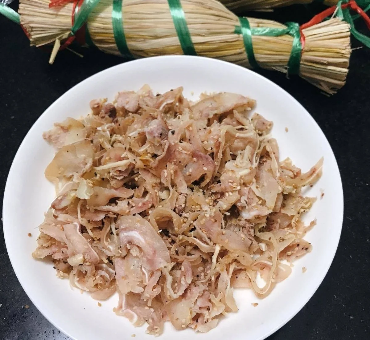 Tré is a rustic delicacy crafted from high-quality pork head meat, skin, and ears, seasoned expertly with a fragrant blend of galangal, garlic, and toasted sesame seeds. What sets it apart is the ingenious traditional preservation method. The seasoned meat is packed tightly, wrapped in guava leaves for aroma, and then encased in a thick outer layer of dry straw. This natural packaging facilitates a natural fermentation process, resulting in a perfectly balanced tangy, sour, and savory flavor profile.