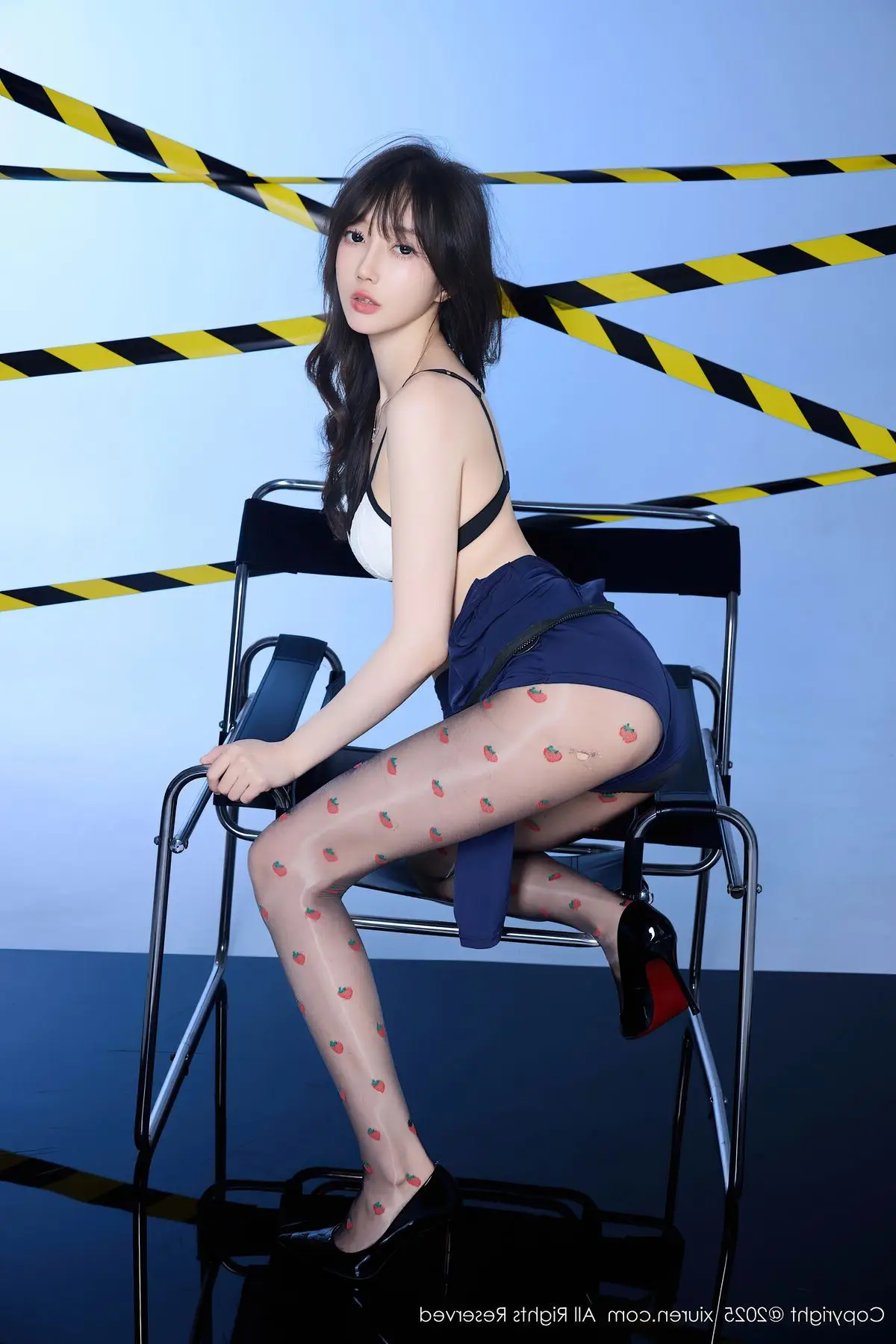 The XiuRen No 10544 photo collection features model Yue Er Yue Er, showcasing her enchanting beauty. In this particular image, Yue Er Yue Er strikes an alluring pose on a chair, highlighting her long, slender legs adorned in unique patterned stockings. Her outfit, combining a bra and shorts, creates a style that is both sensual and distinctive. The minimalist background, accented by yellow and black caution tape, adds an intriguing visual element and a touch of mystery to the photograph. Every moment captured of Yue Er Yue Er exudes natural confidence and charm. This is part of an impressive photo series, sure to captivate every gaze and reveal the model's multifaceted beauty.#YueEr #XiuRen #AsianModel #GlamourPhotography #FashionShoot