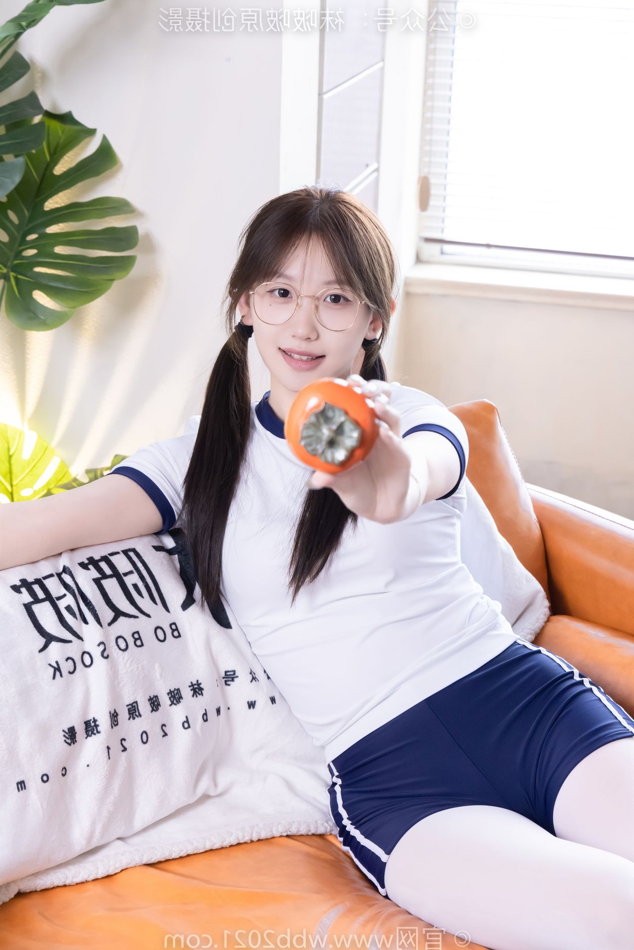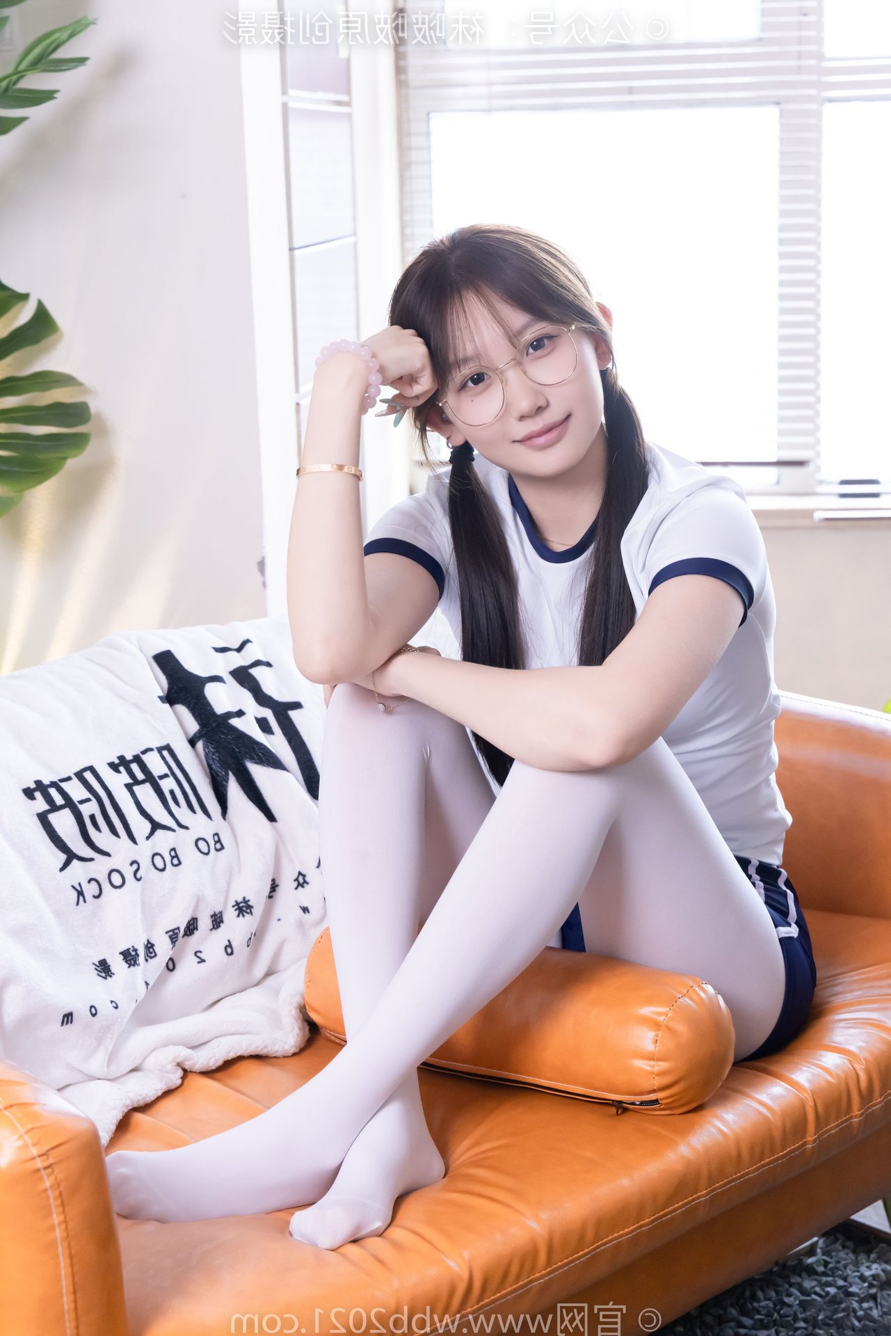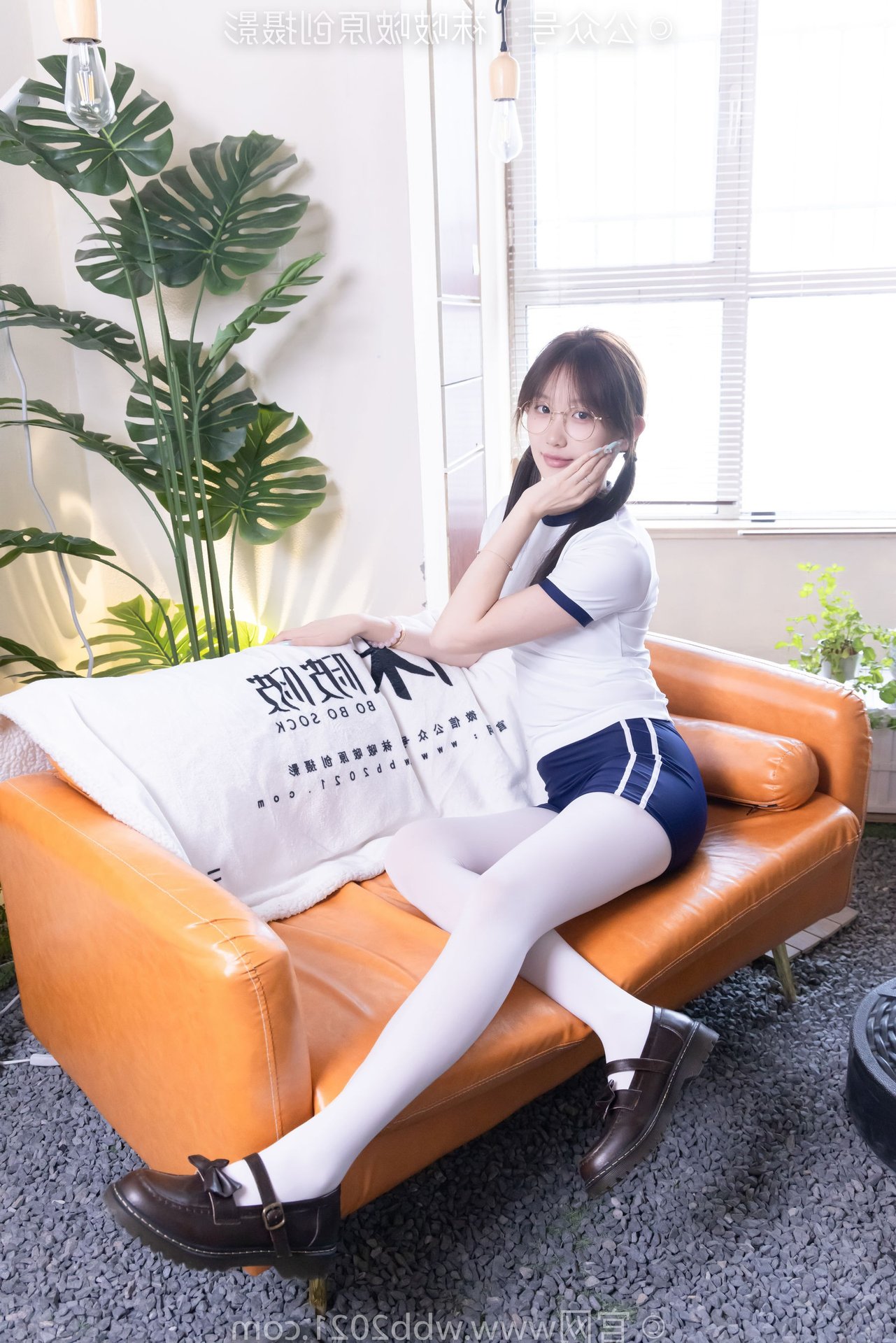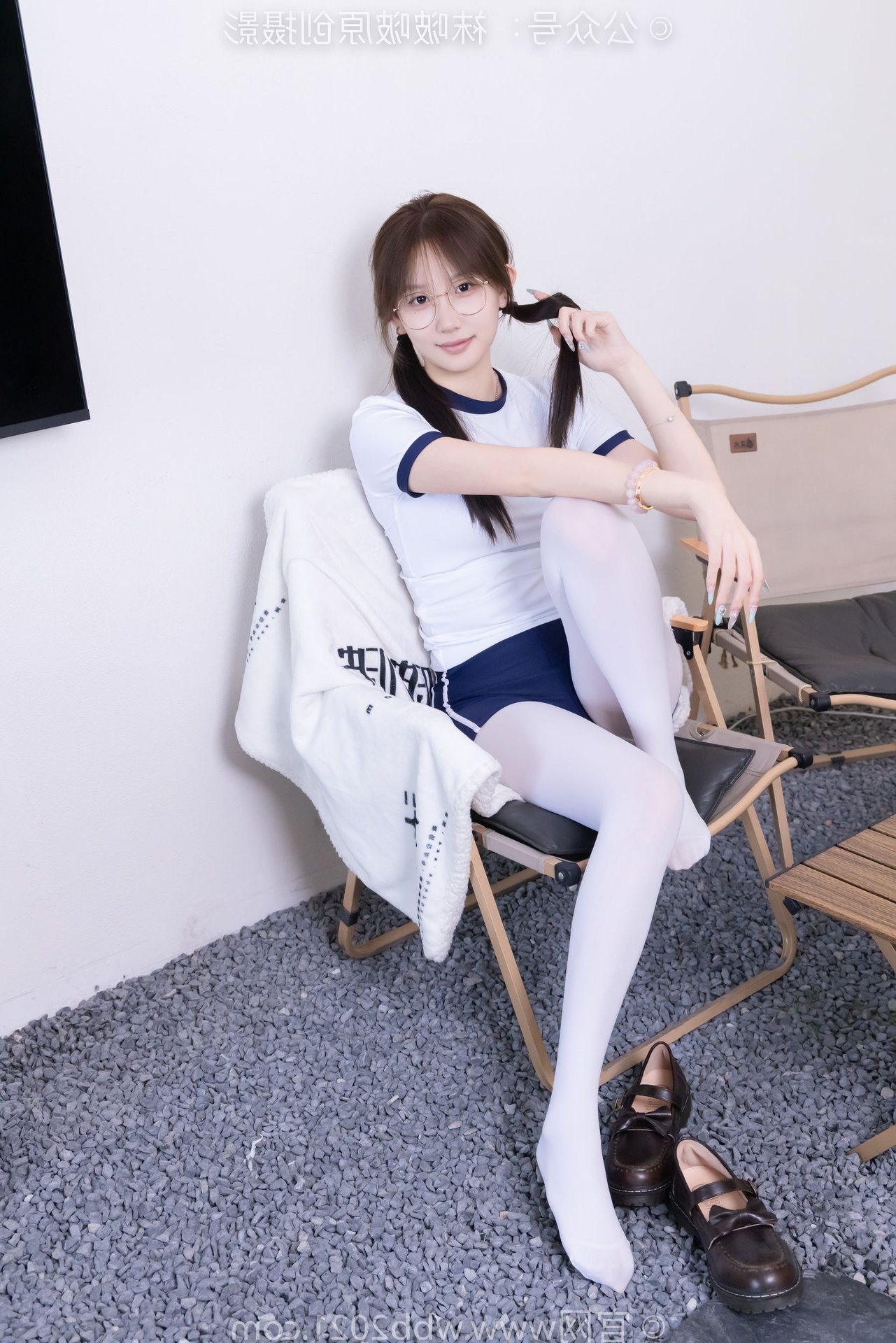 This captivating image features Chinese Model No.562 Xiangcai, radiating youthful charm and energy. Dressed in a vibrant sports outfit consisting of a white t-shirt and blue shorts, paired with thick white stockings, she embodies a blend of innocence and athleticism. Her gentle smile, playful pigtails, and stylish glasses enhance her pure and fresh appearance. The pose, with hands raised, suggests a dynamic and confident spirit, perfectly capturing the essence of a lively young woman. This photo is ideal for showcasing a youthful, sporty aesthetic with a touch of sweet purity.