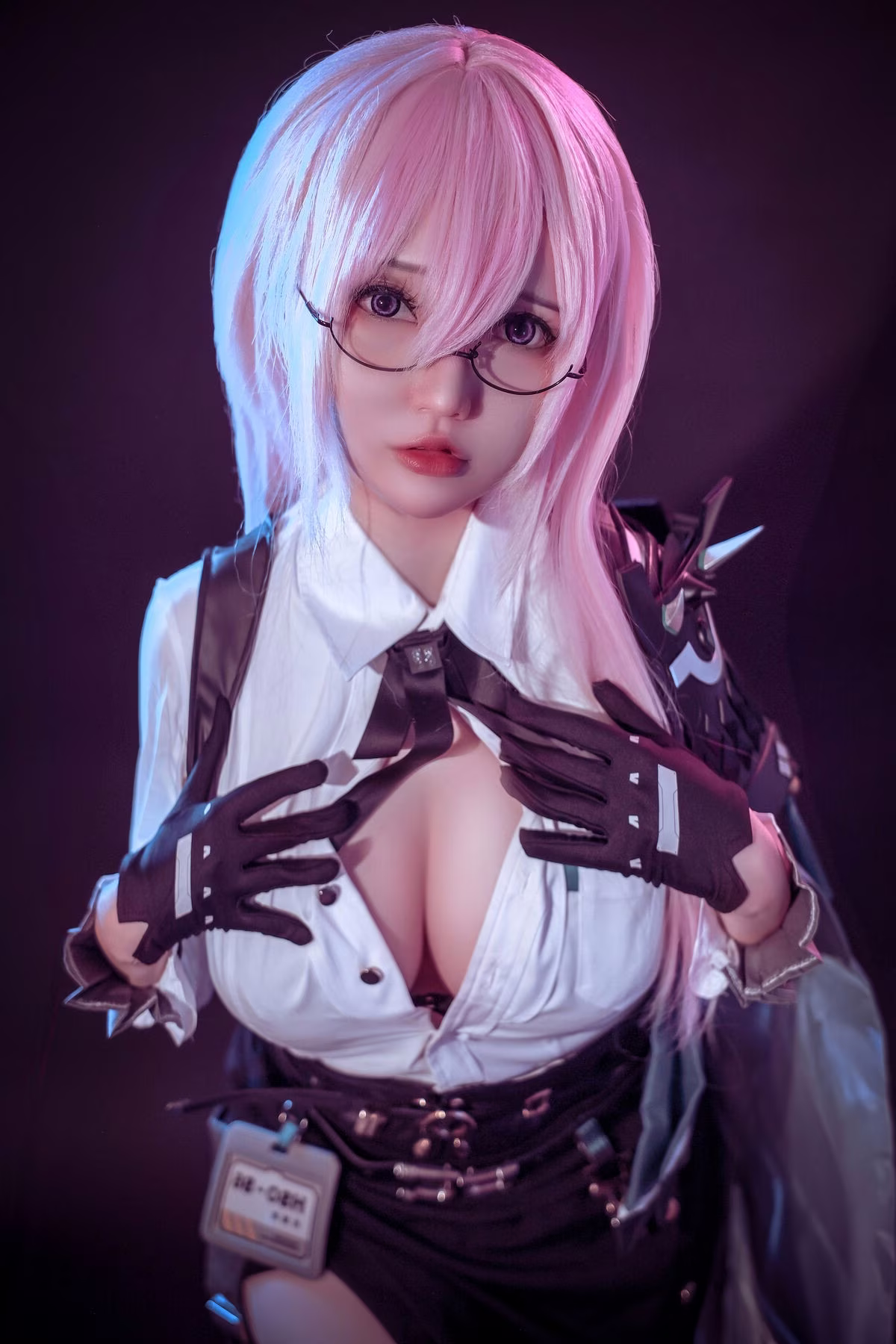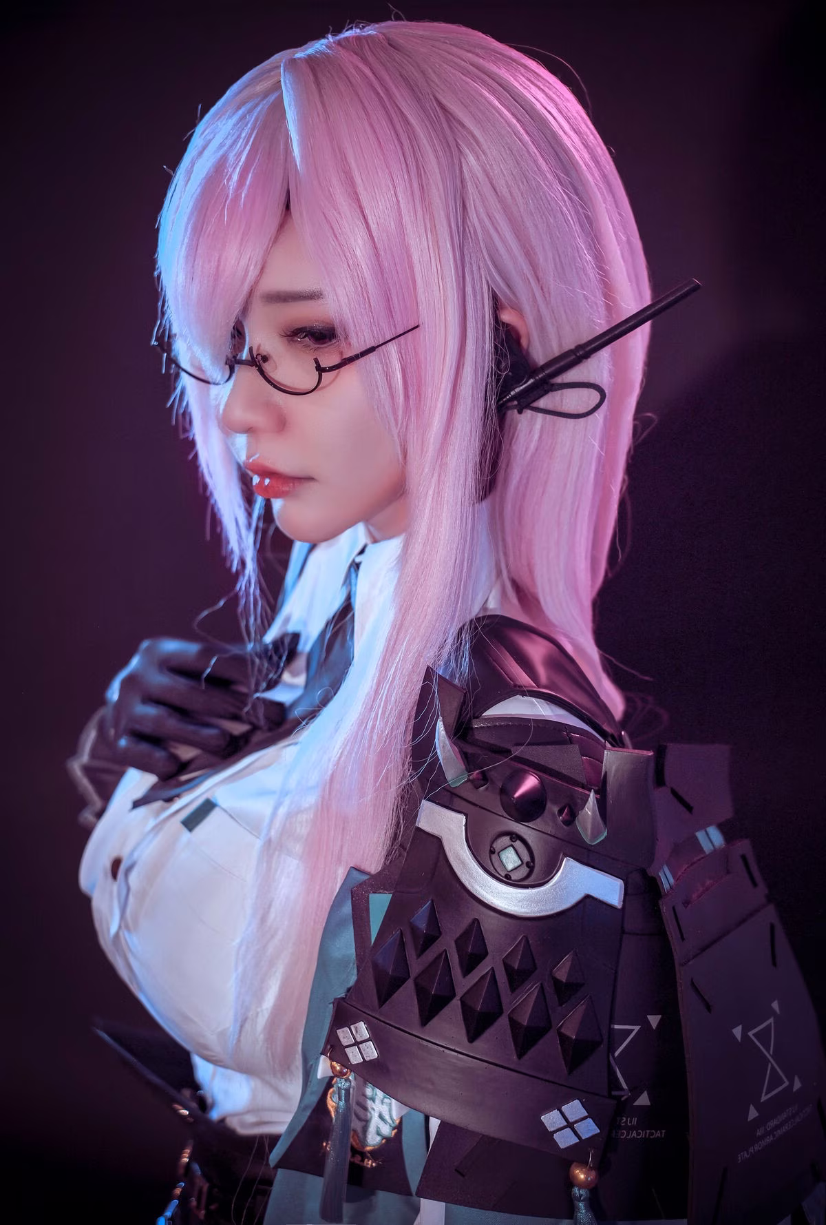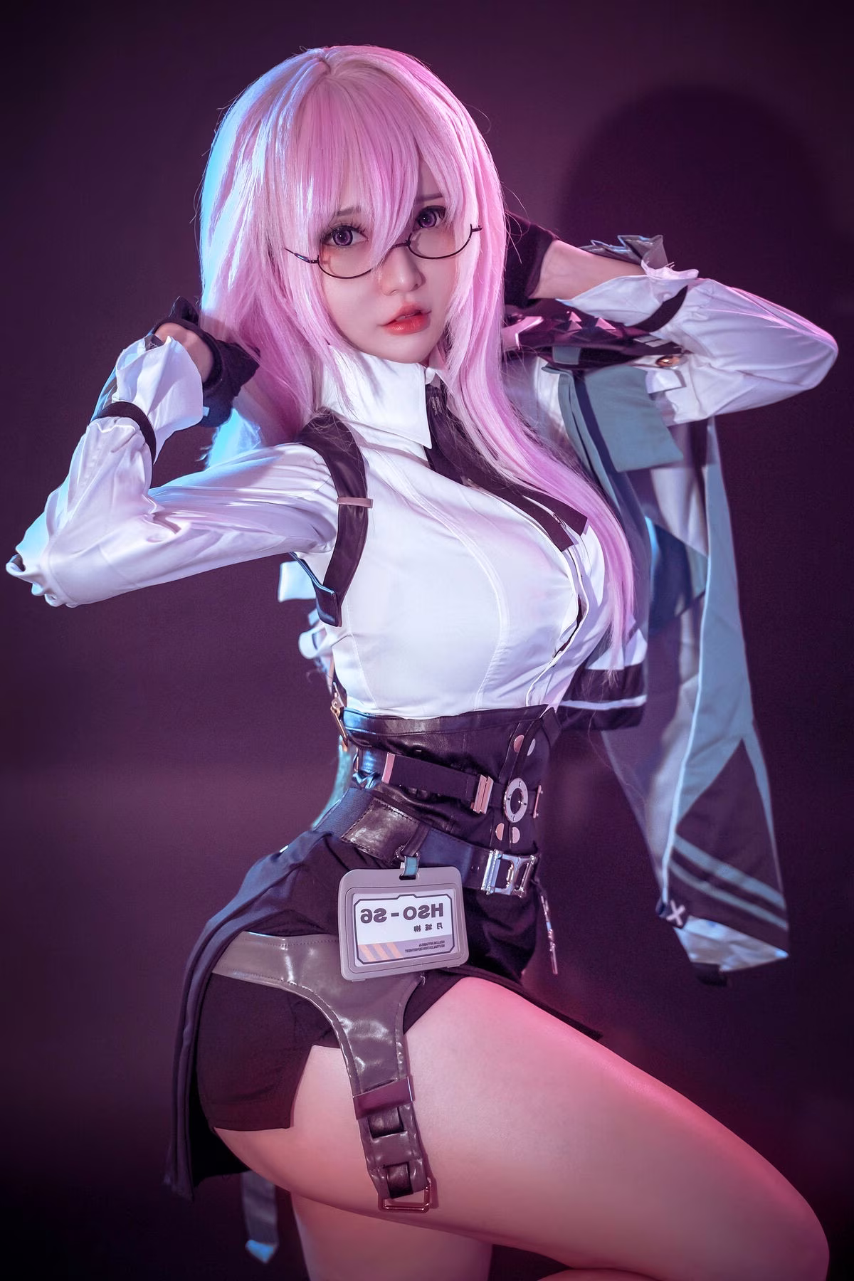 Immerse yourself in the enchanting world of cosplay with Potato Godzilla's exceptional portrayal of Yanagi. This talented cosplayer vividly and captivatingly recreates the character with striking pink hair and intellectual glasses. The meticulously designed outfit from the pristine white shirt paired with a form-fitting black corset to the intricate strap details creates a look that is both strong and alluring. The ethereal purple glow enveloping the scene further accentuates Yanagi's mysterious aura and confident demeanor. Every angle radiates Potato Godzilla's professionalism and passion for the art of cosplay. This is not just a photograph but a narrative of creativity and dedication.