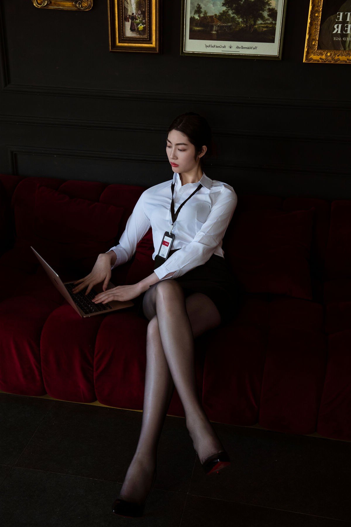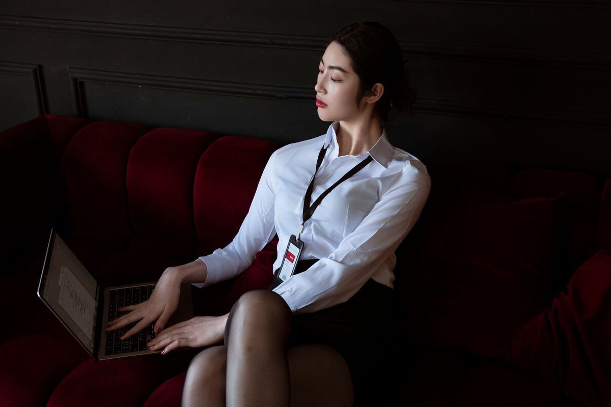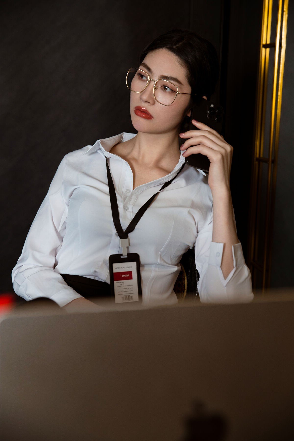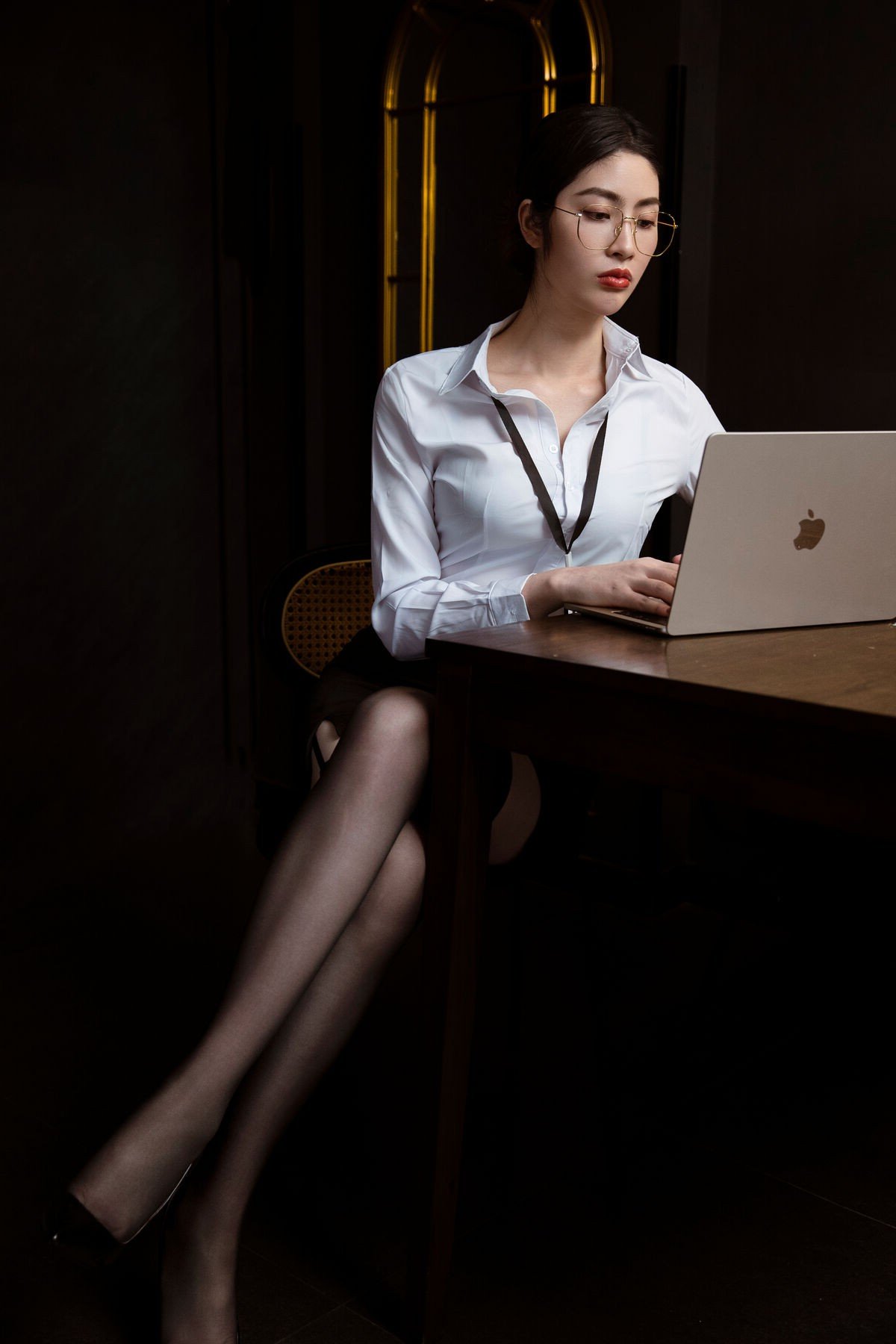 This image features office girl Sang Ni in an elegant and professional business attire She wears a pristine white shirt paired with a dark skirt exuding a refined and confident beauty Her fashionable eyeglasses and neat hairstyle further highlight her captivating aura and intelligence Office lady Sang Ni stands leaning against the wall with a direct gaze full of strength and determination This portrayal not only showcases modern office fashion but also conveys the confidence and assertiveness of women in the workplace The girl emanates an alluring beauty while maintaining the necessary seriousness and professionalism