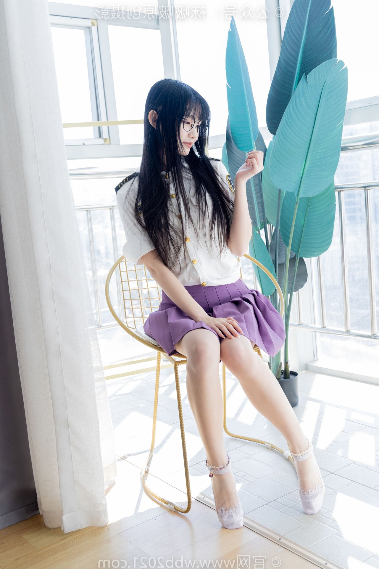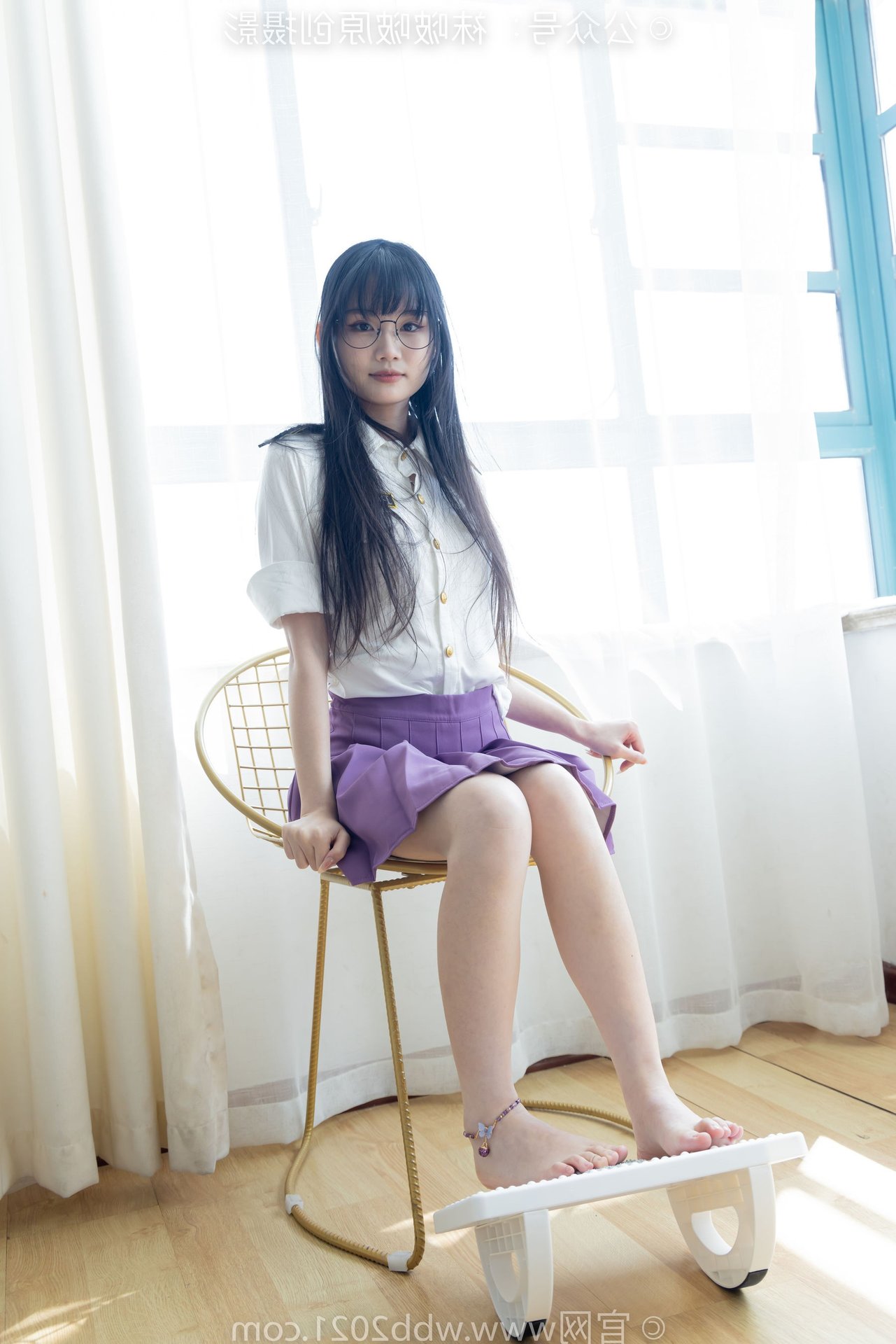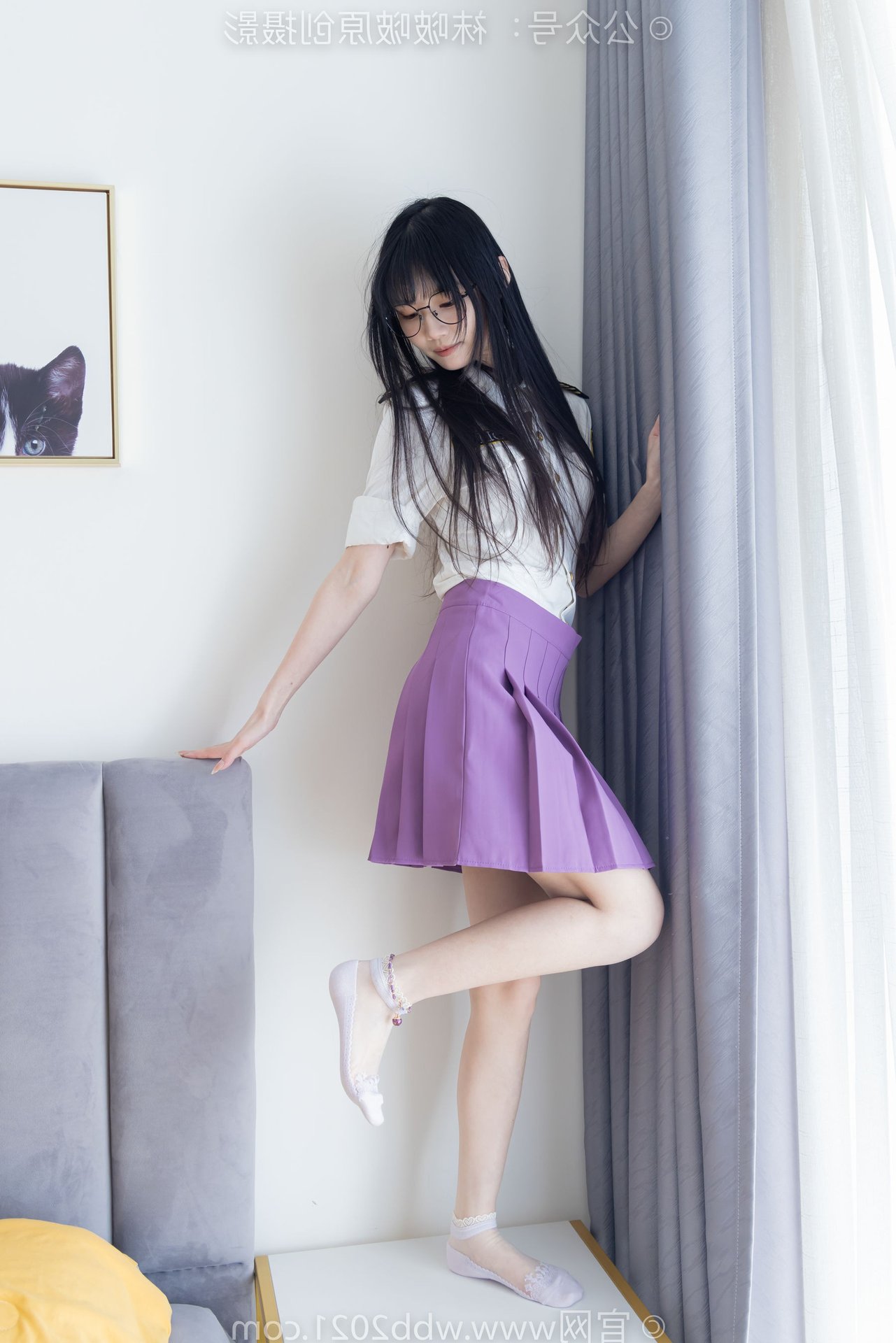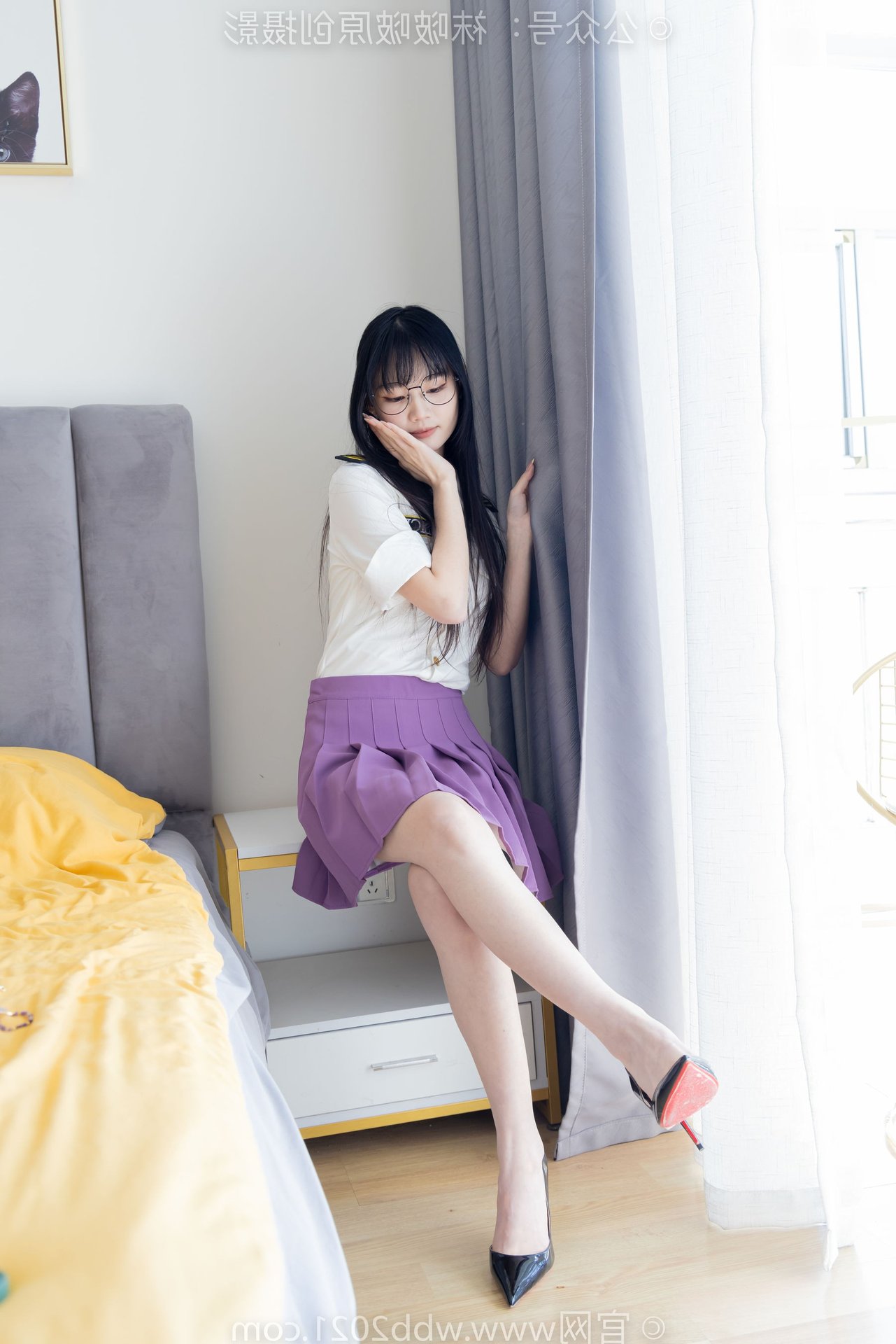 This captivating image portrays the refined beauty of a Chinese model, identified as BoBoSocks No.538, seated gracefully. Her long, flowing hair and delicate glasses exude an air of elegance and intellect. The outfit features a striking purple pleated mini skirt, harmoniously paired with a crisp white shirt, creating a youthful yet sophisticated appeal. Her slender legs are perfectly accentuated by sheer, shimmering crystal socks and stylish white high heels. The entire ensemble presents an image that is both gentle and modern, radiating charm and exquisite fashion taste. It's a perfect blend of traditional femininity and contemporary style.