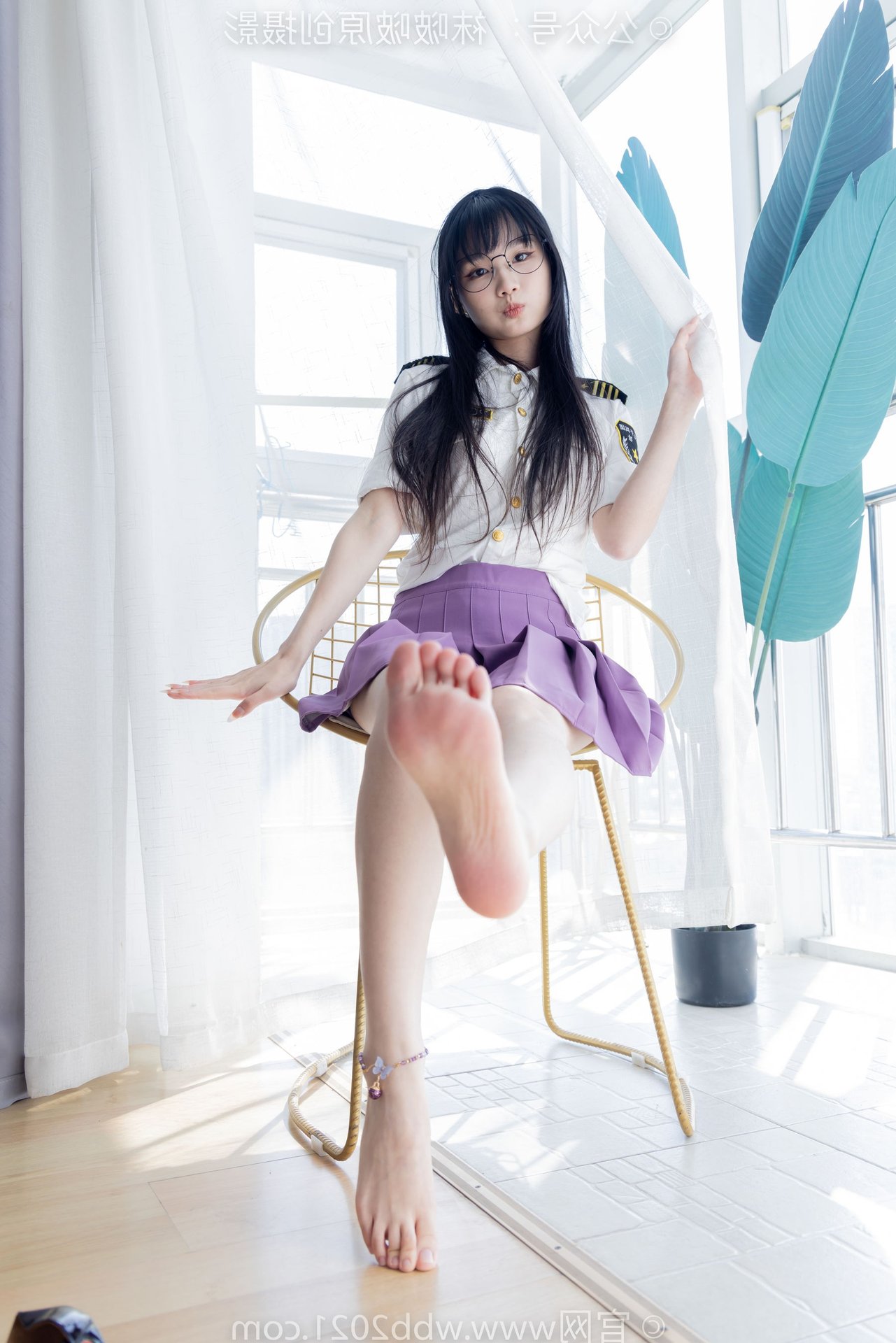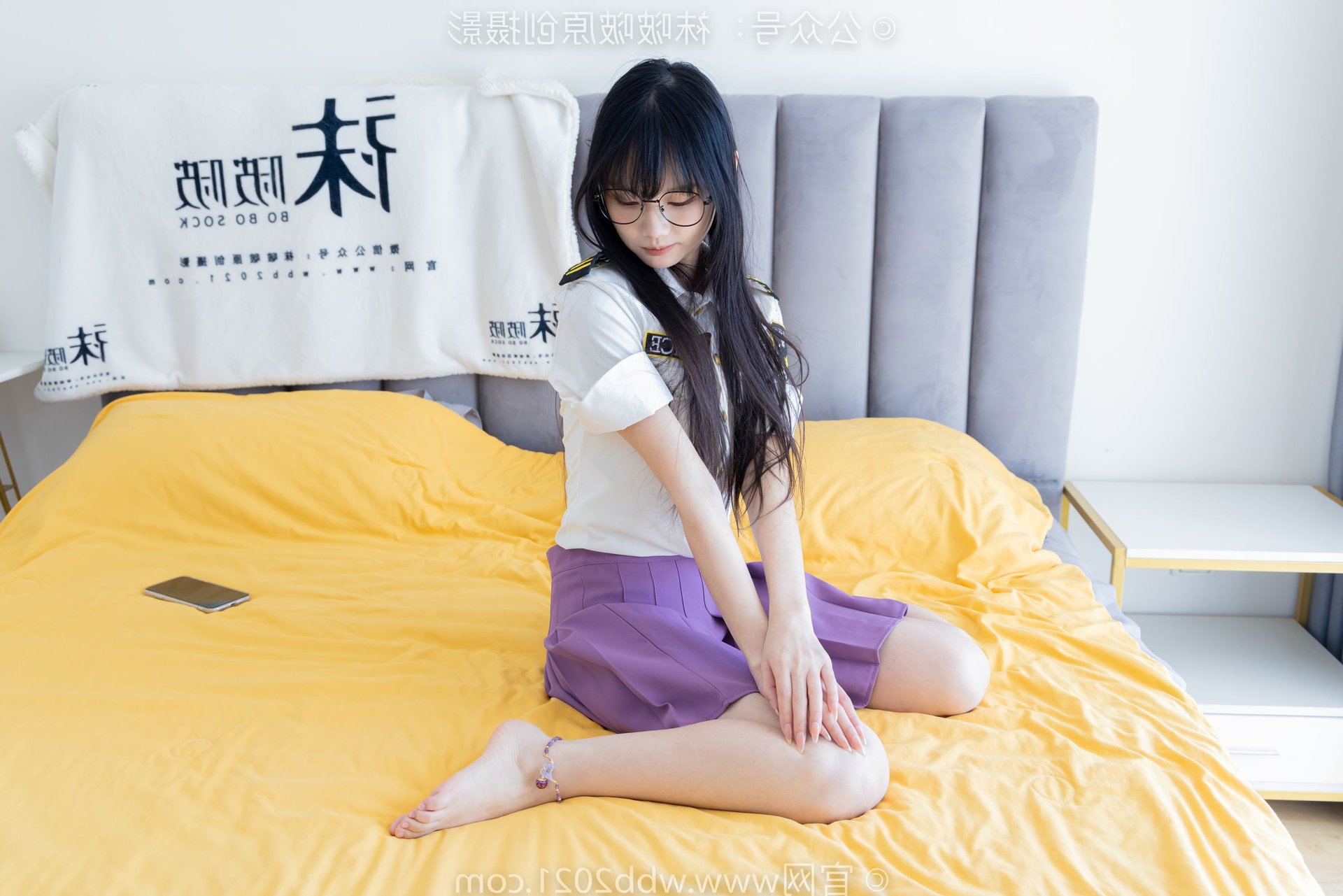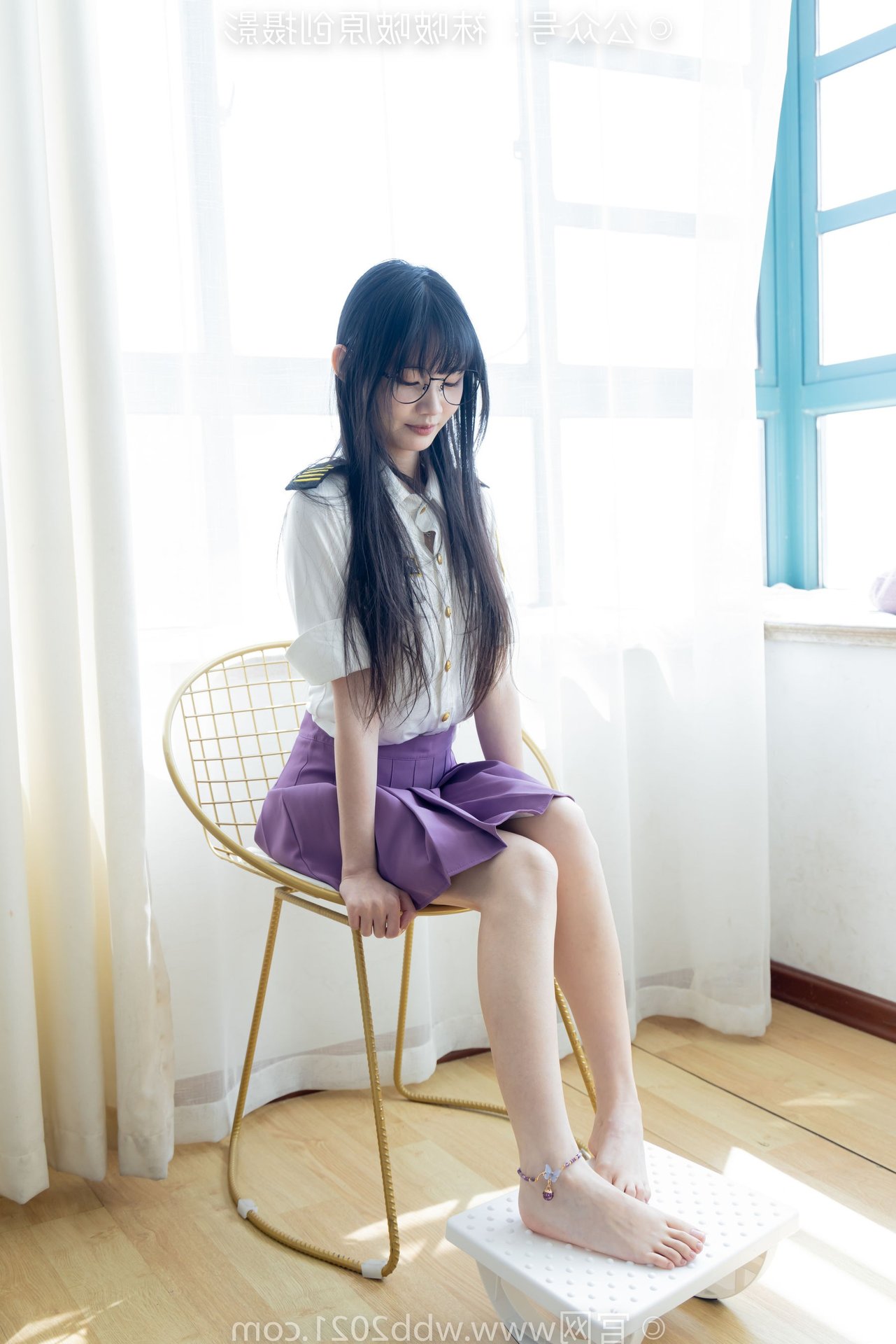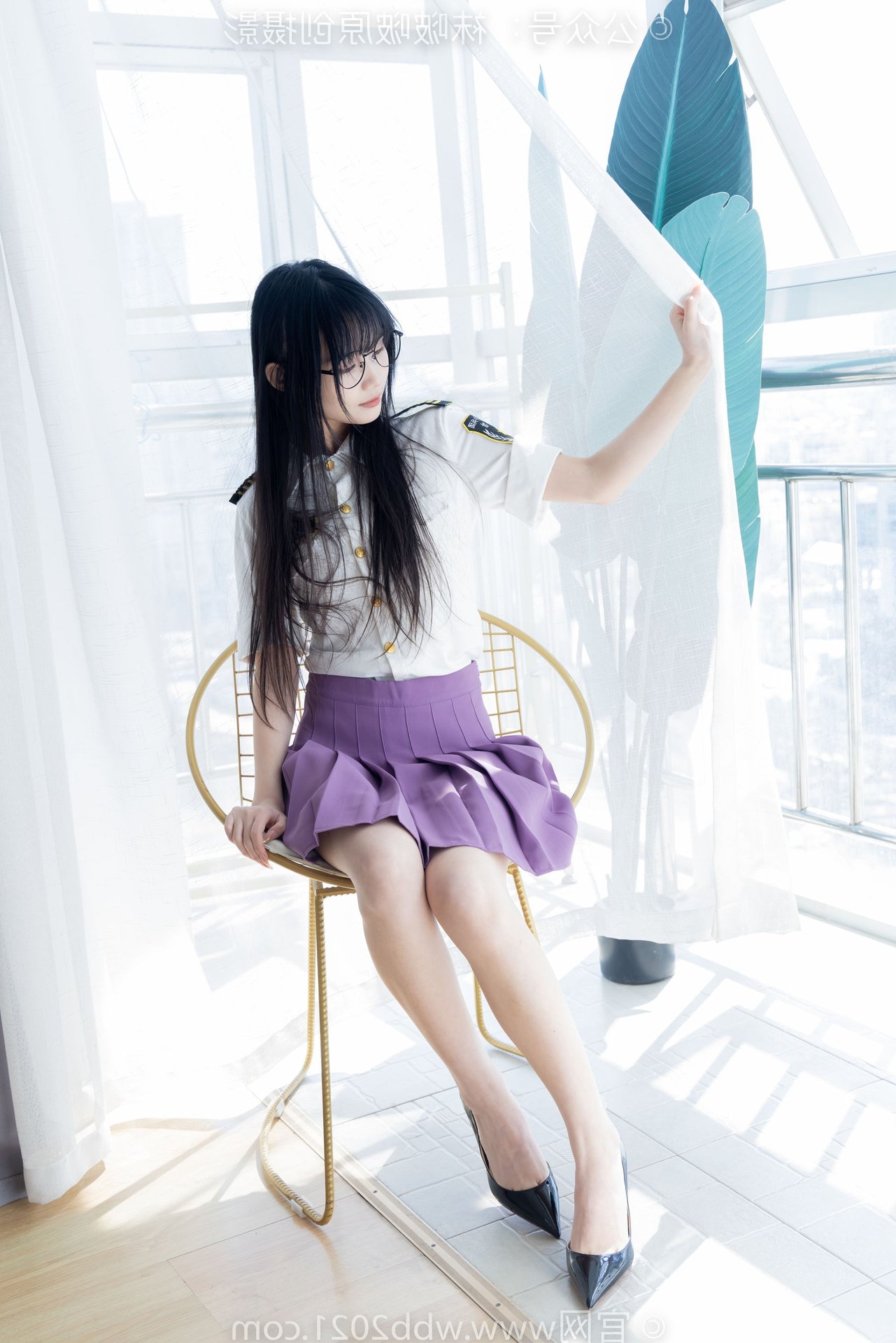 This captivating image portrays the refined beauty of a Chinese model, identified as BoBoSocks No.538, seated gracefully. Her long, flowing hair and delicate glasses exude an air of elegance and intellect. The outfit features a striking purple pleated mini skirt, harmoniously paired with a crisp white shirt, creating a youthful yet sophisticated appeal. Her slender legs are perfectly accentuated by sheer, shimmering crystal socks and stylish white high heels. The entire ensemble presents an image that is both gentle and modern, radiating charm and exquisite fashion taste. It's a perfect blend of traditional femininity and contemporary style.