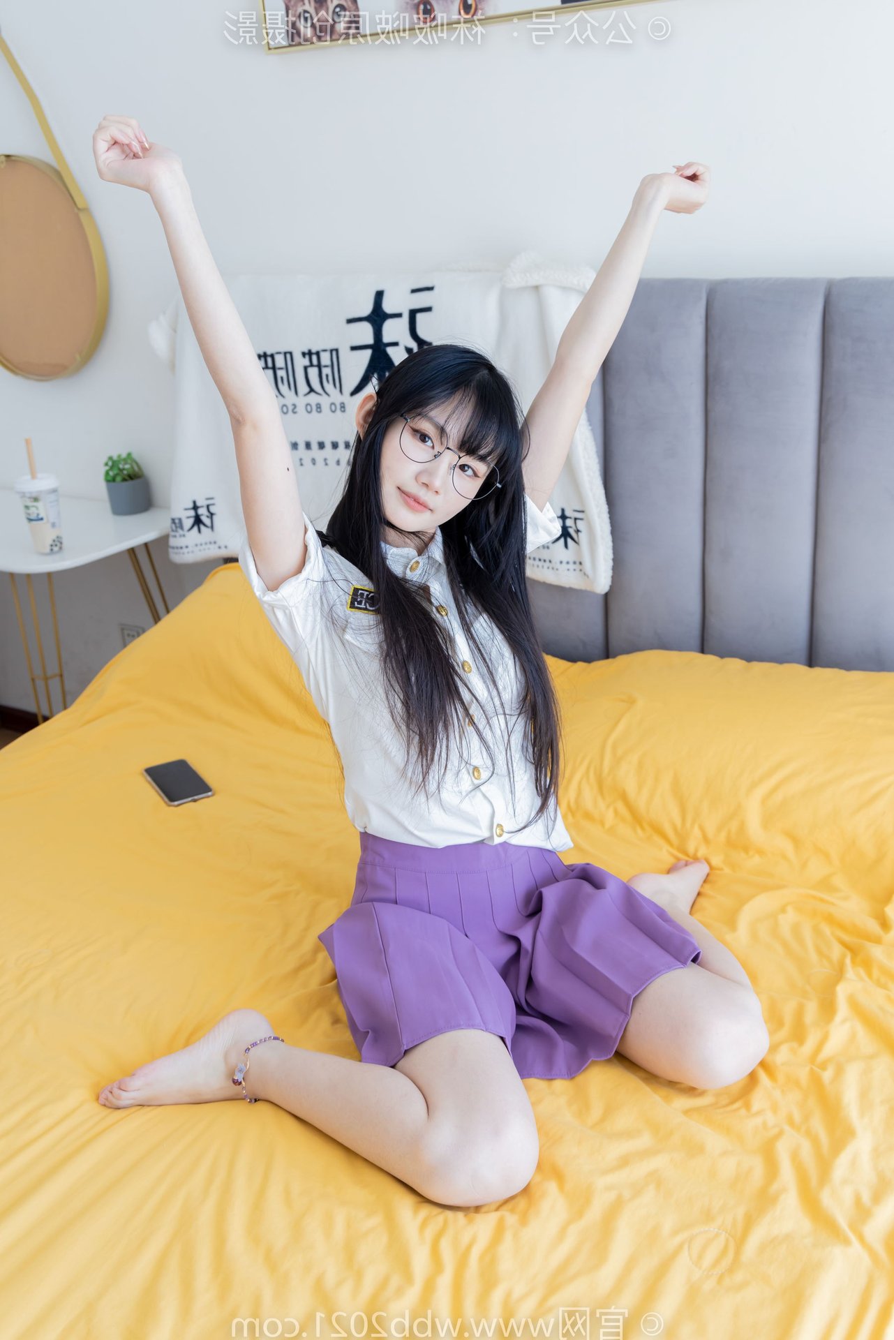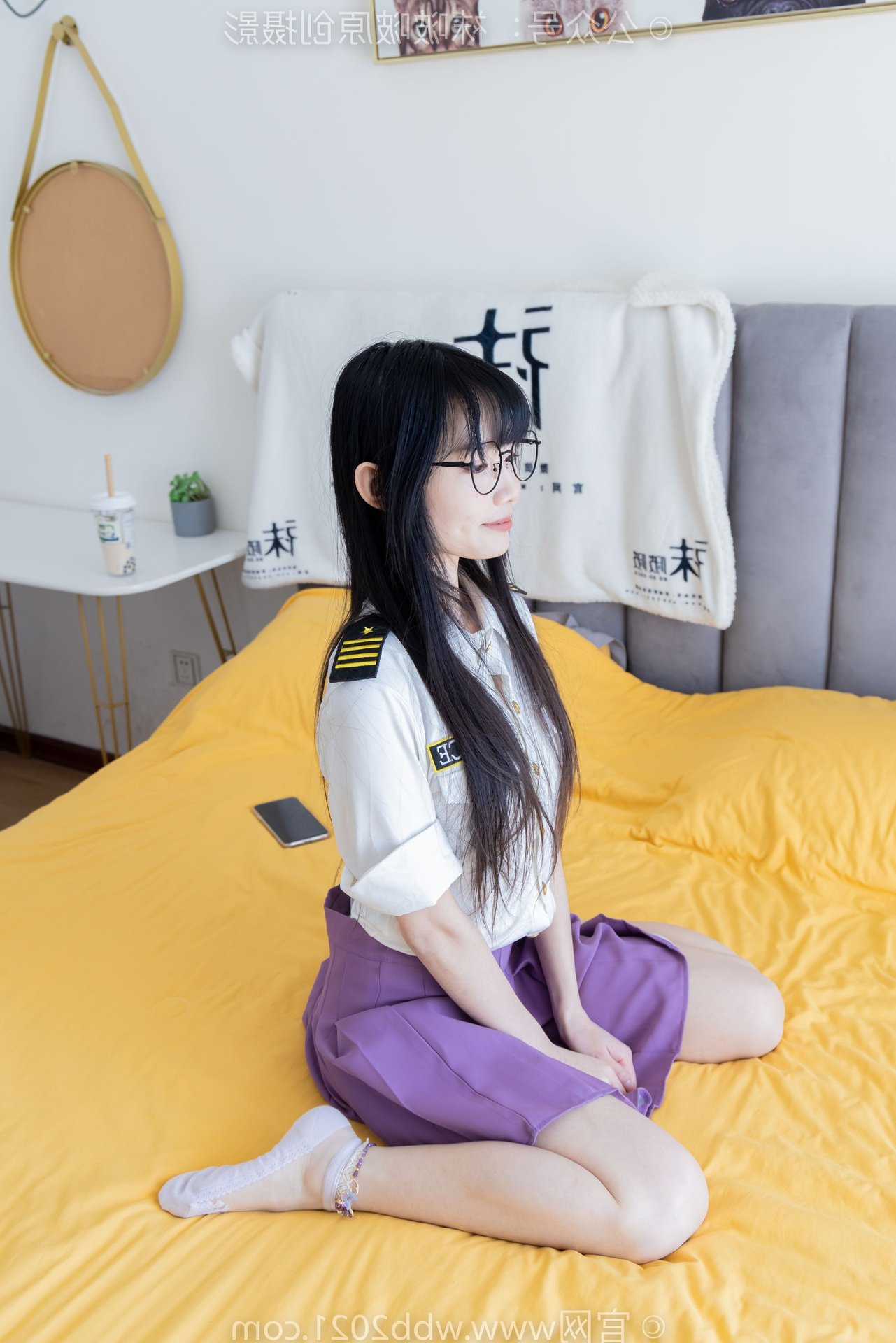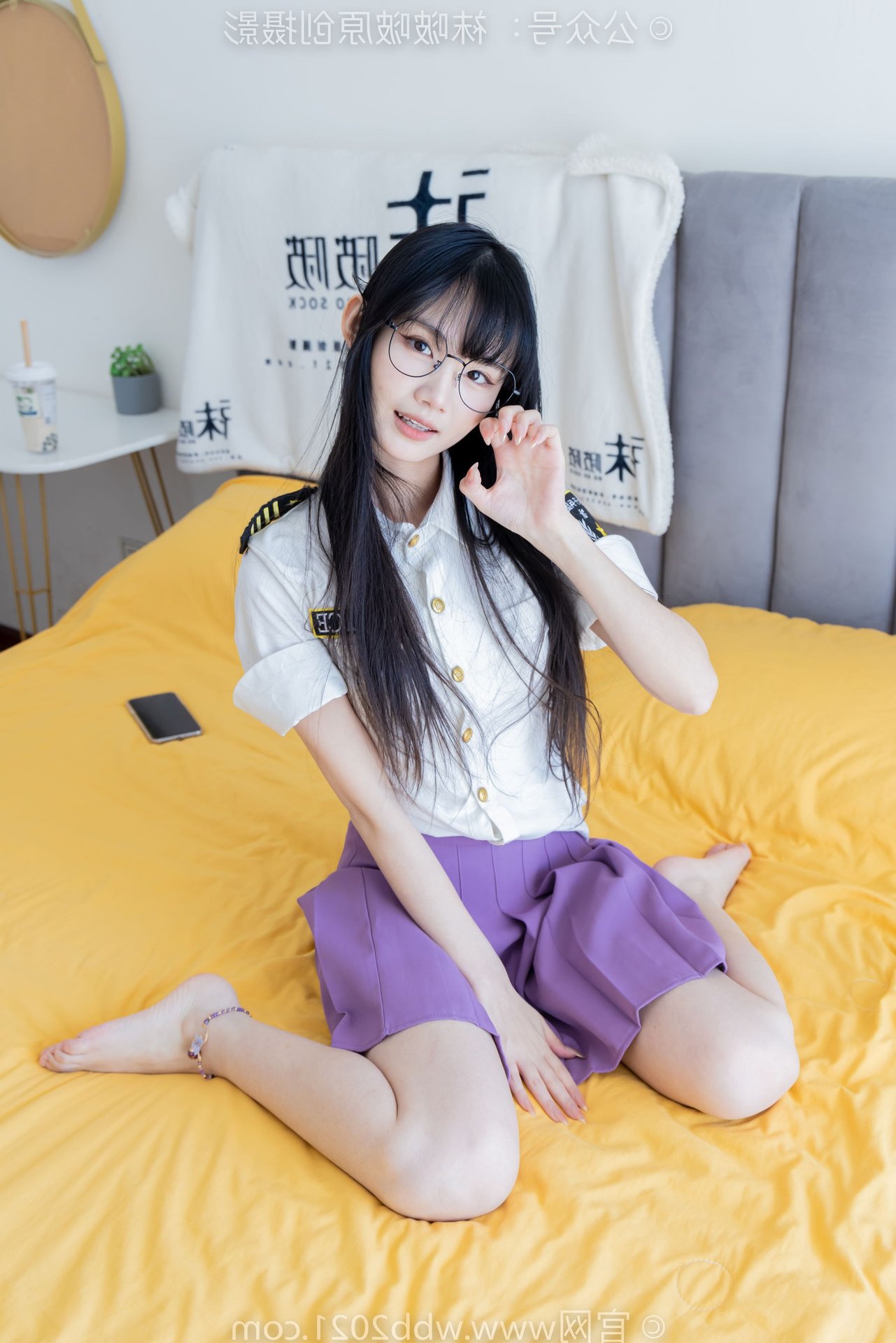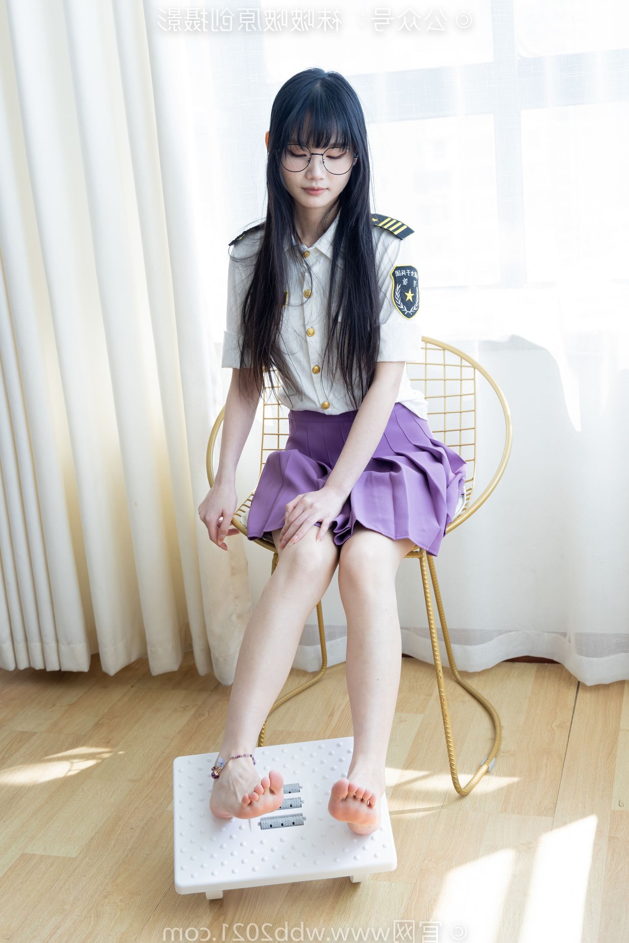 This captivating image portrays the refined beauty of a Chinese model, identified as BoBoSocks No.538, seated gracefully. Her long, flowing hair and delicate glasses exude an air of elegance and intellect. The outfit features a striking purple pleated mini skirt, harmoniously paired with a crisp white shirt, creating a youthful yet sophisticated appeal. Her slender legs are perfectly accentuated by sheer, shimmering crystal socks and stylish white high heels. The entire ensemble presents an image that is both gentle and modern, radiating charm and exquisite fashion taste. It's a perfect blend of traditional femininity and contemporary style.