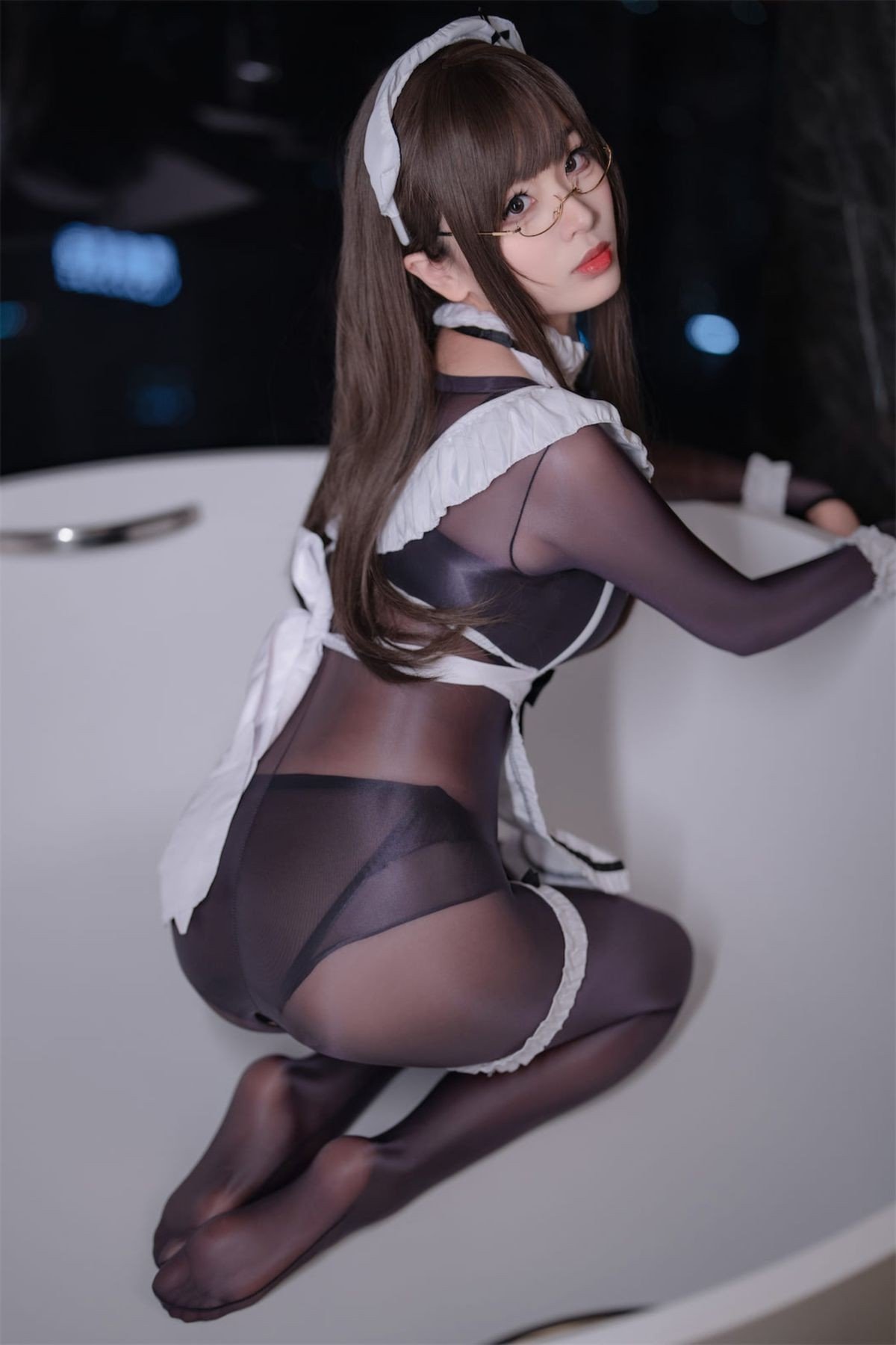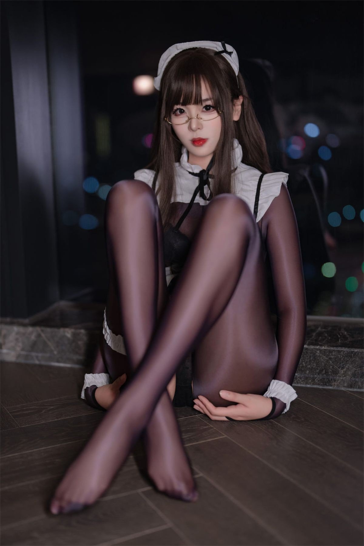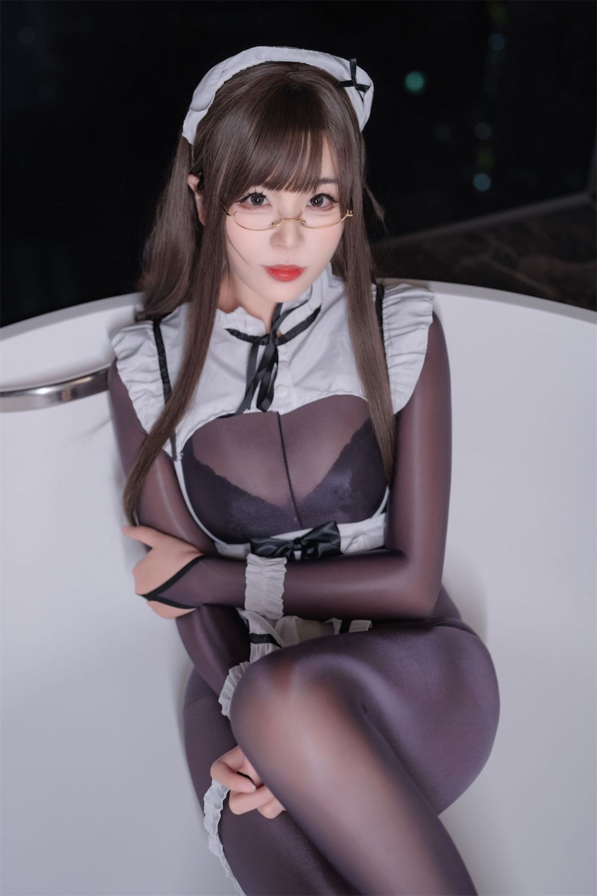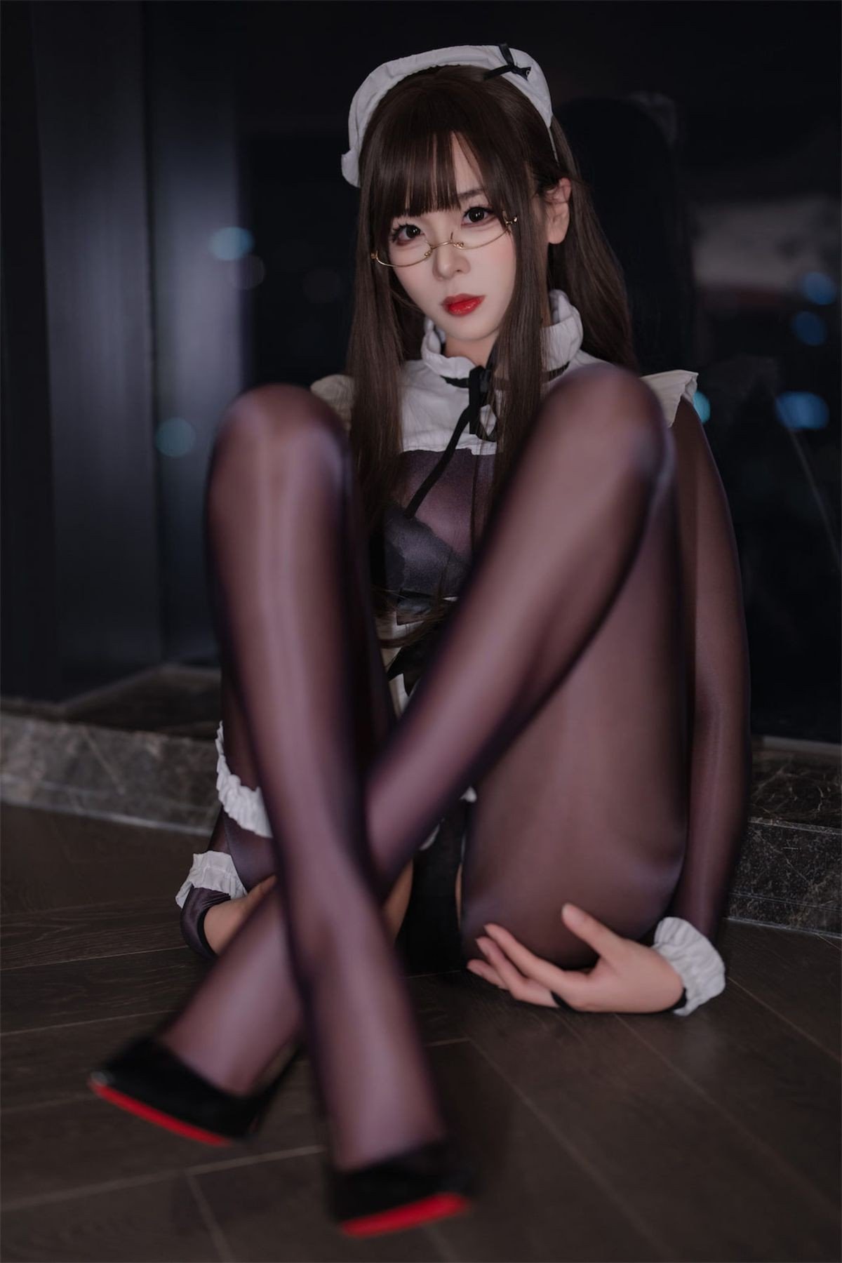This captivating image features Coser Xuan Xiao Xue Jie in an enchanting black sheer bodysuit maid outfit The form-fitting costume gracefully accentuates her figure highlighting every elegant curve Her striking red high heels provide a vibrant contrast adding a touch of bold sophistication to the ensemble Posed gracefully lying down with legs elegantly extended the model exudes confidence and an irresistible allure Her gentle expression framed by stylish glasses enhances the mysterious and charming appeal This unique blend of traditional maid aesthetics with the modern allure of a sheer bodysuit creates a truly memorable and visually stunning cosplay experience for viewers