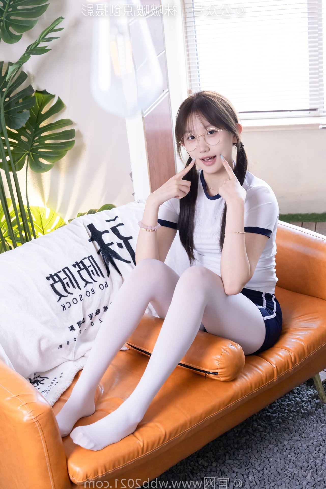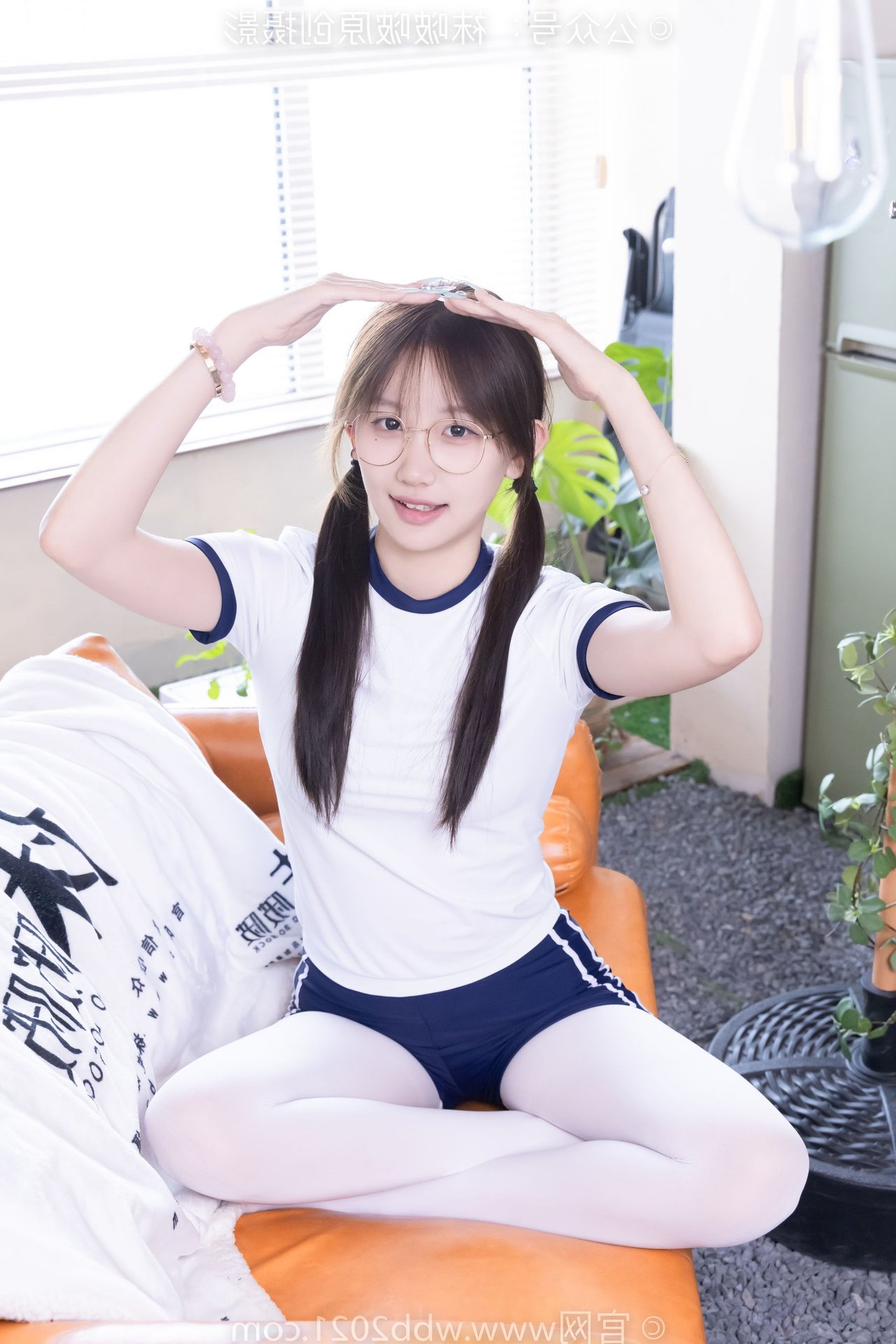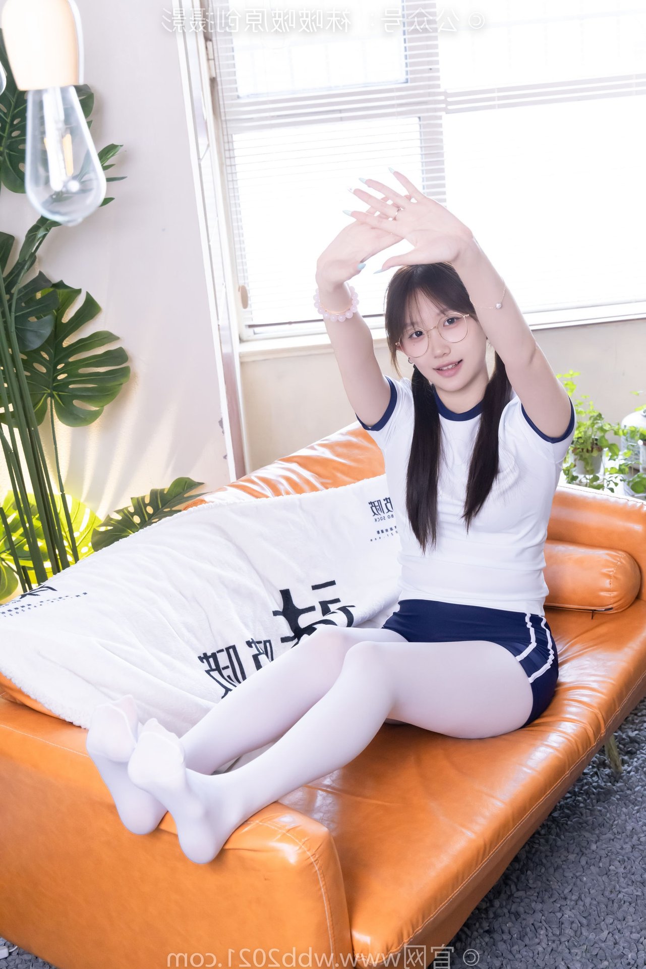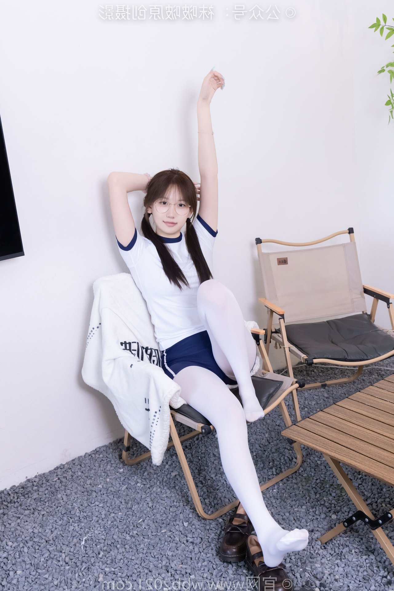 This captivating image features Chinese Model No.562 Xiangcai, radiating youthful charm and energy. Dressed in a vibrant sports outfit consisting of a white t-shirt and blue shorts, paired with thick white stockings, she embodies a blend of innocence and athleticism. Her gentle smile, playful pigtails, and stylish glasses enhance her pure and fresh appearance. The pose, with hands raised, suggests a dynamic and confident spirit, perfectly capturing the essence of a lively young woman. This photo is ideal for showcasing a youthful, sporty aesthetic with a touch of sweet purity.