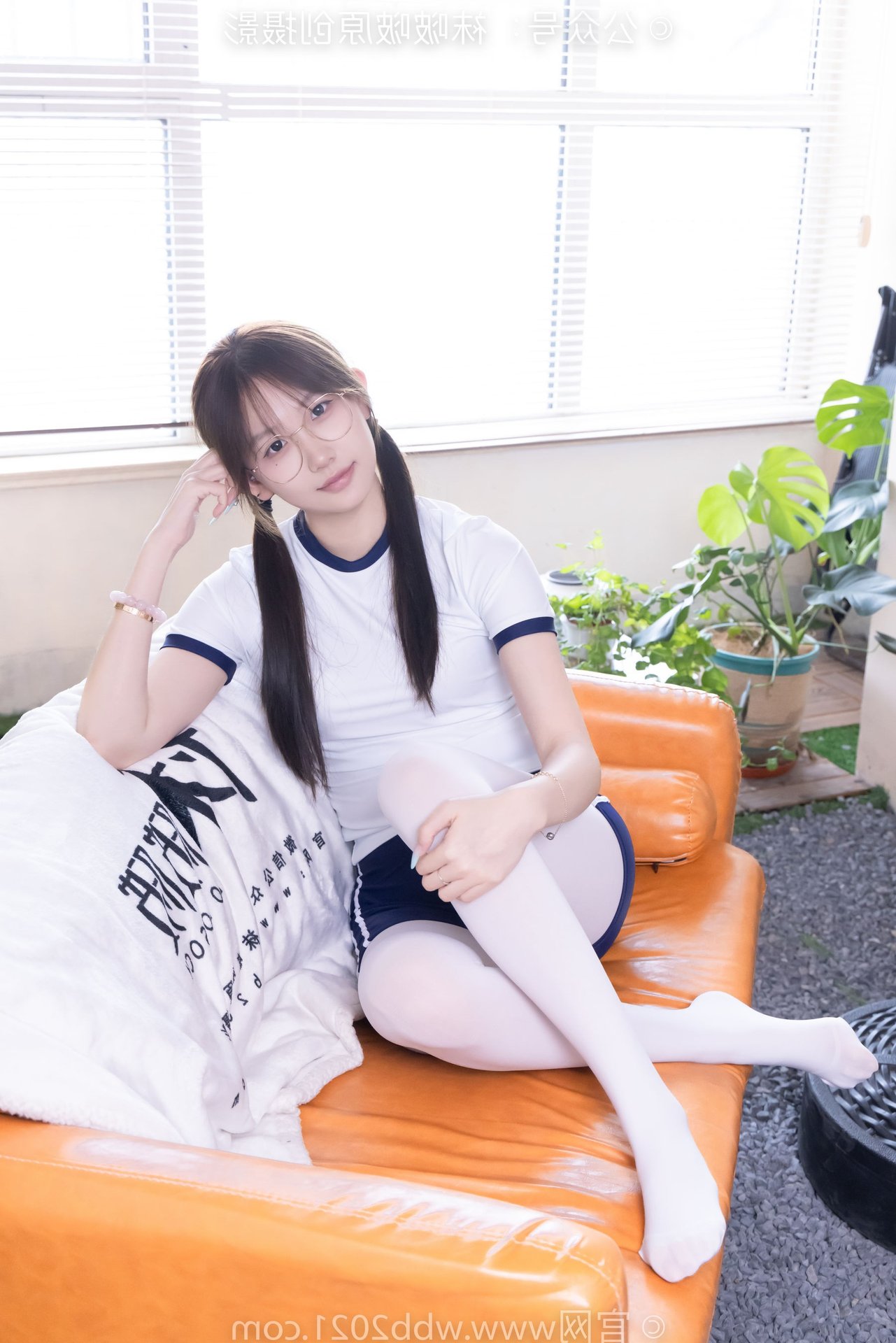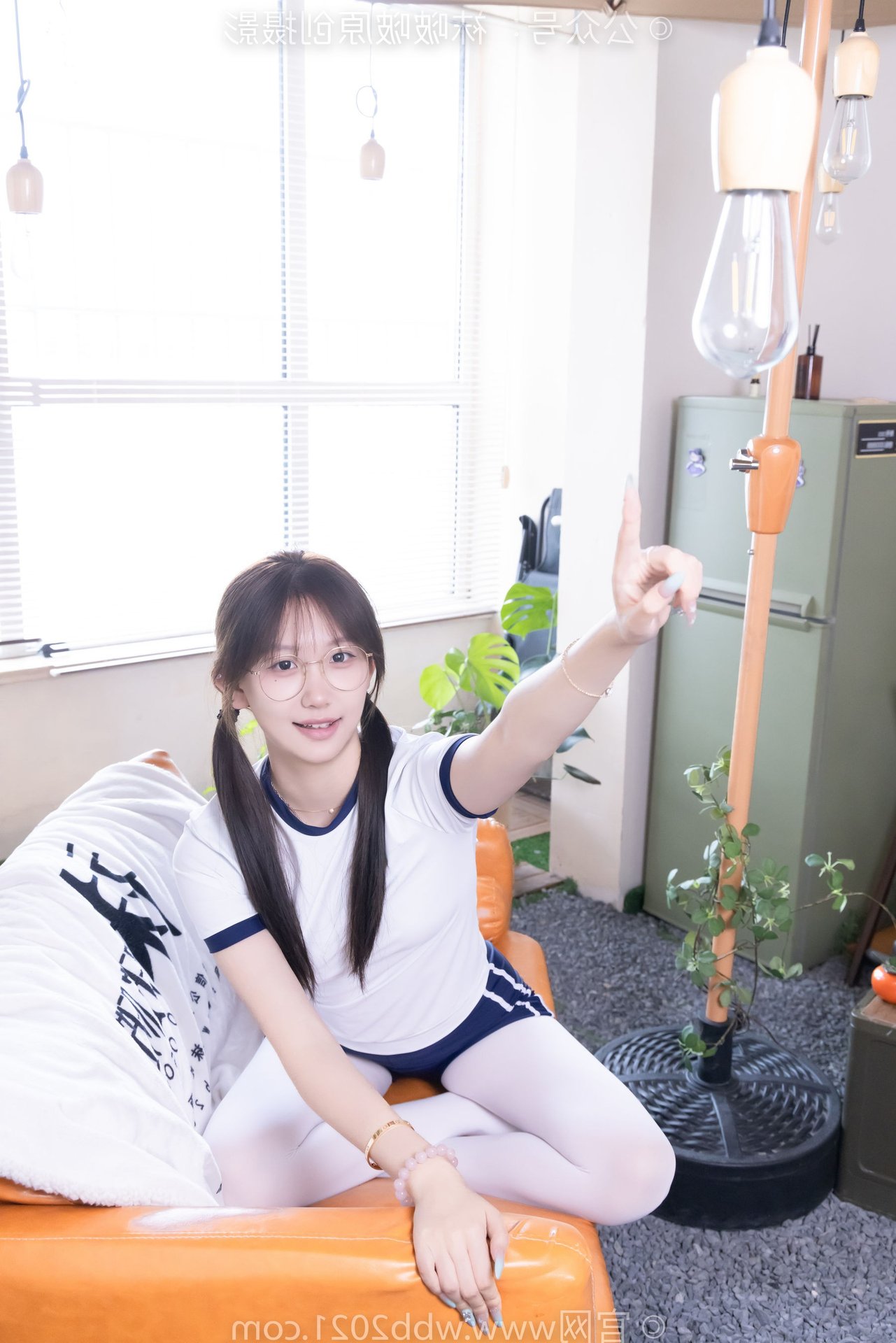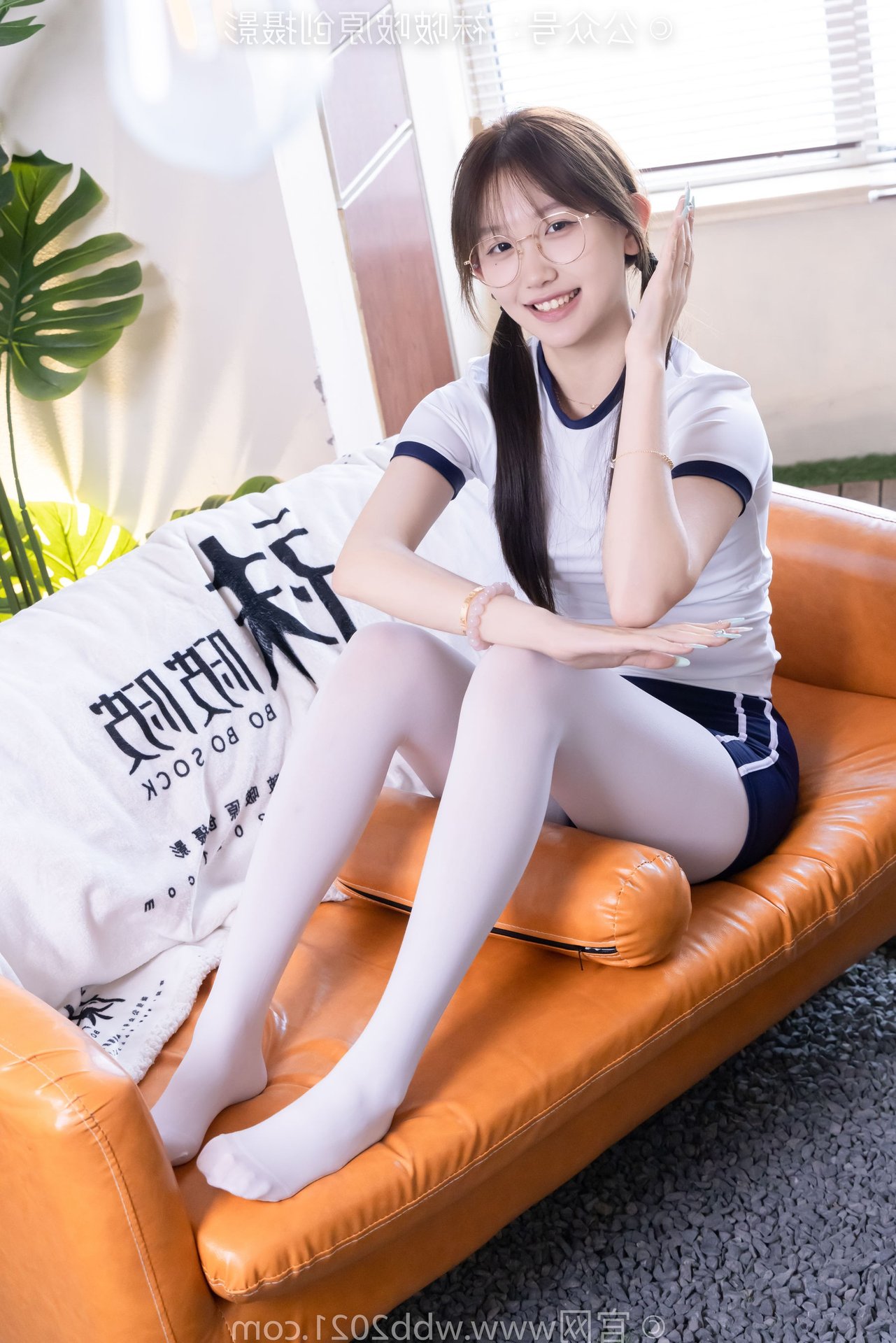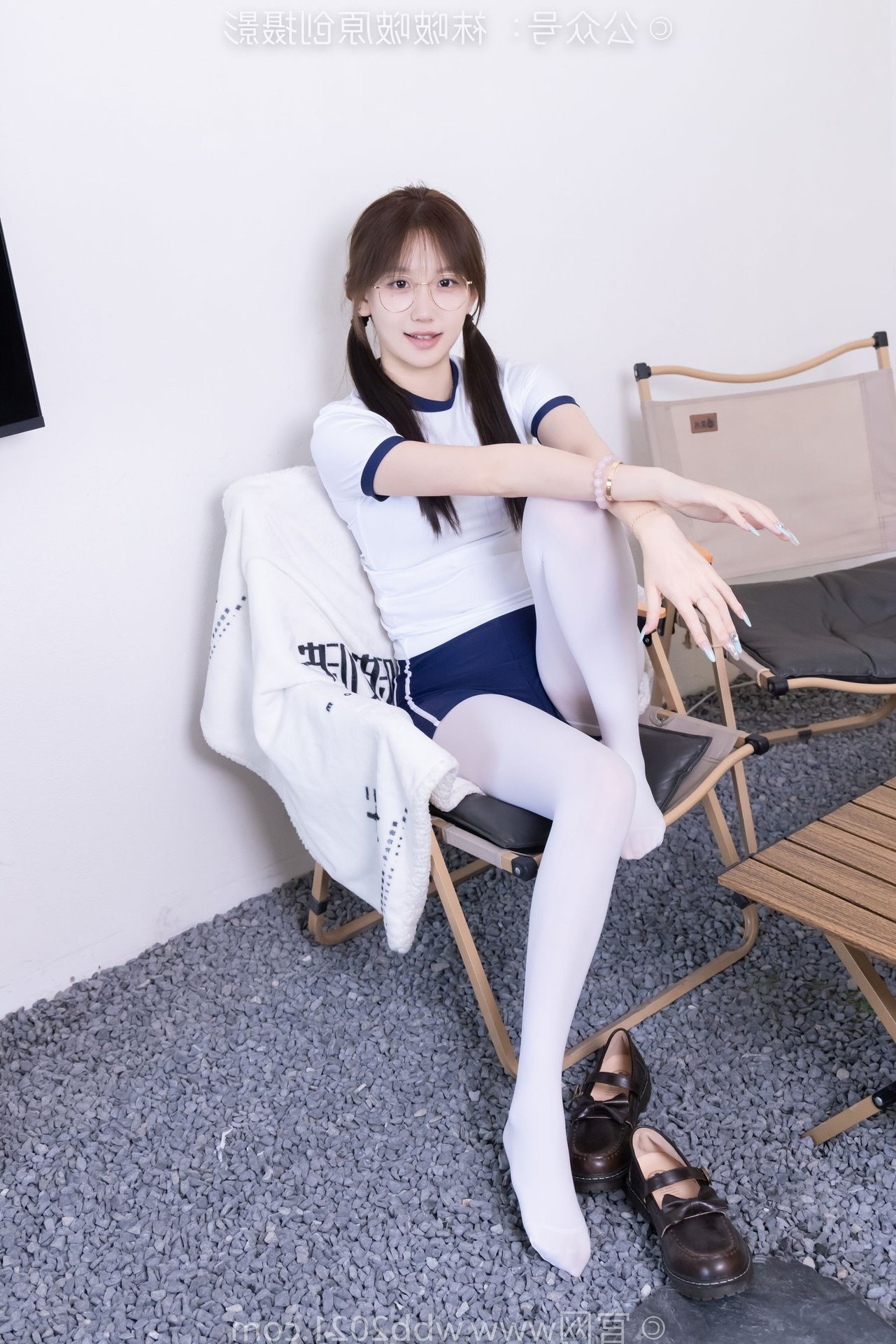 This captivating image features Chinese Model No.562 Xiangcai, radiating youthful charm and energy. Dressed in a vibrant sports outfit consisting of a white t-shirt and blue shorts, paired with thick white stockings, she embodies a blend of innocence and athleticism. Her gentle smile, playful pigtails, and stylish glasses enhance her pure and fresh appearance. The pose, with hands raised, suggests a dynamic and confident spirit, perfectly capturing the essence of a lively young woman. This photo is ideal for showcasing a youthful, sporty aesthetic with a touch of sweet purity.