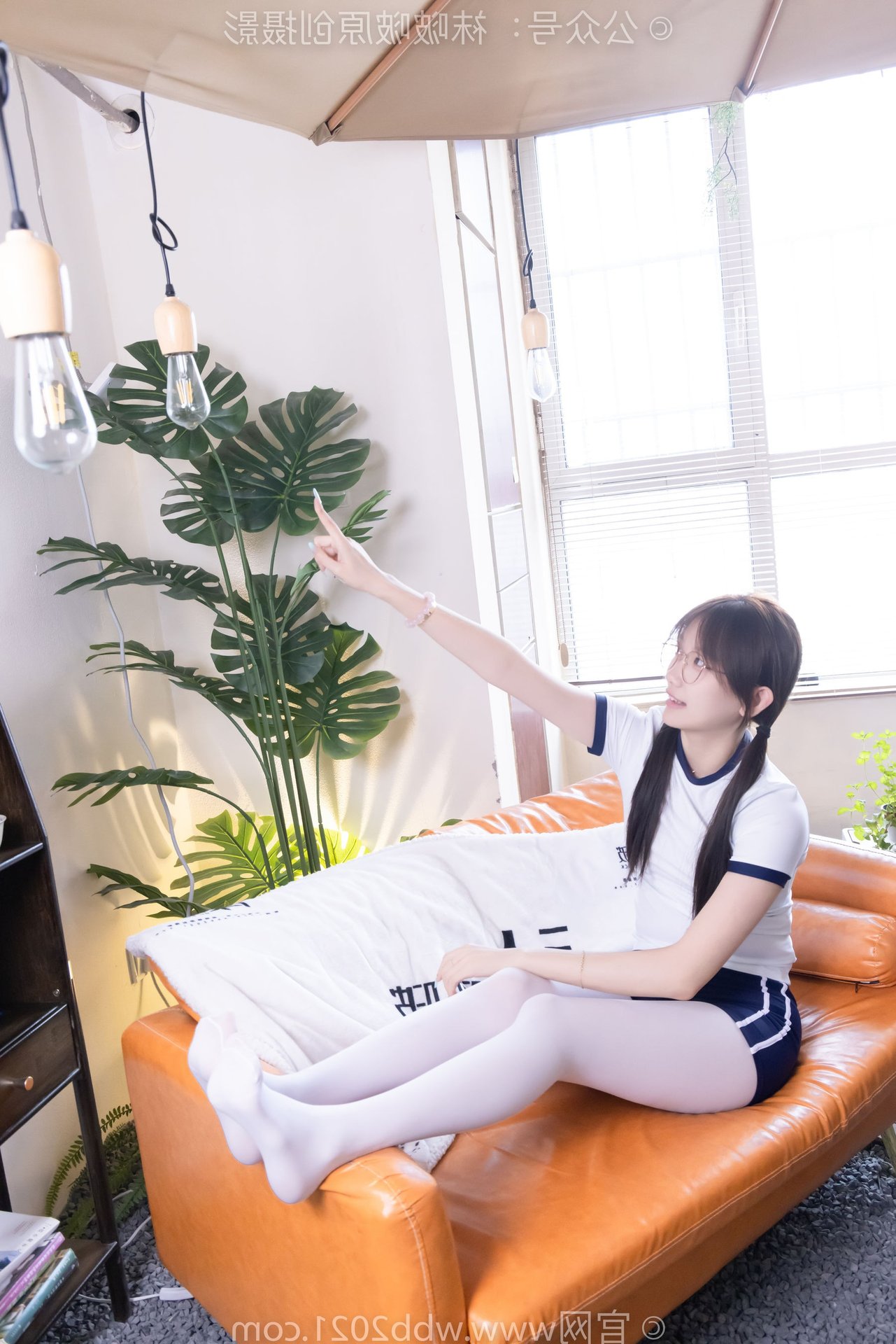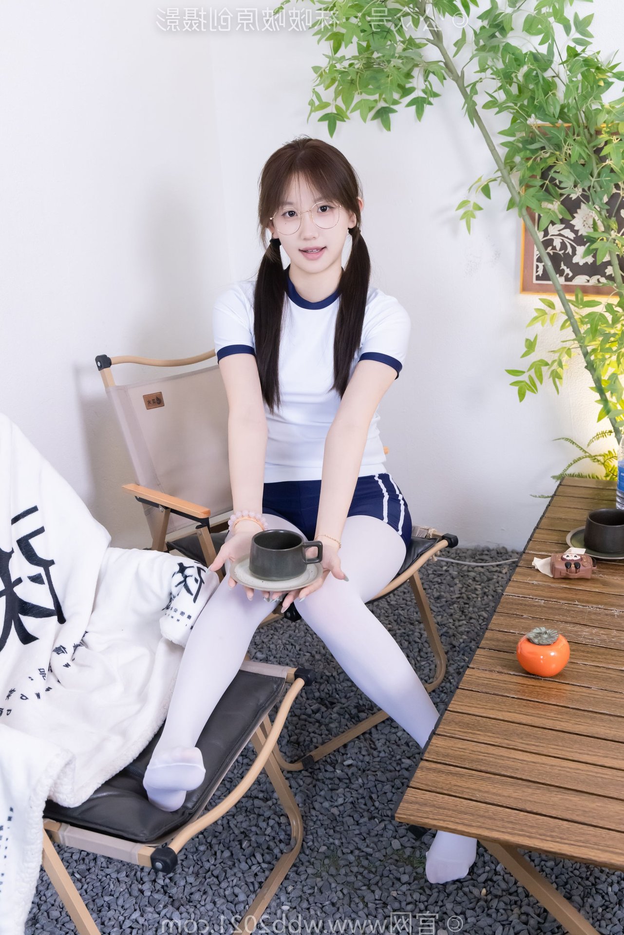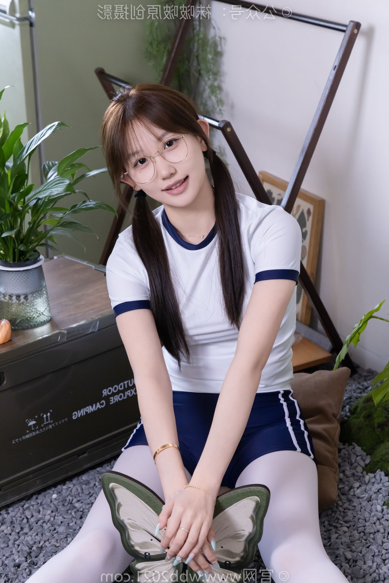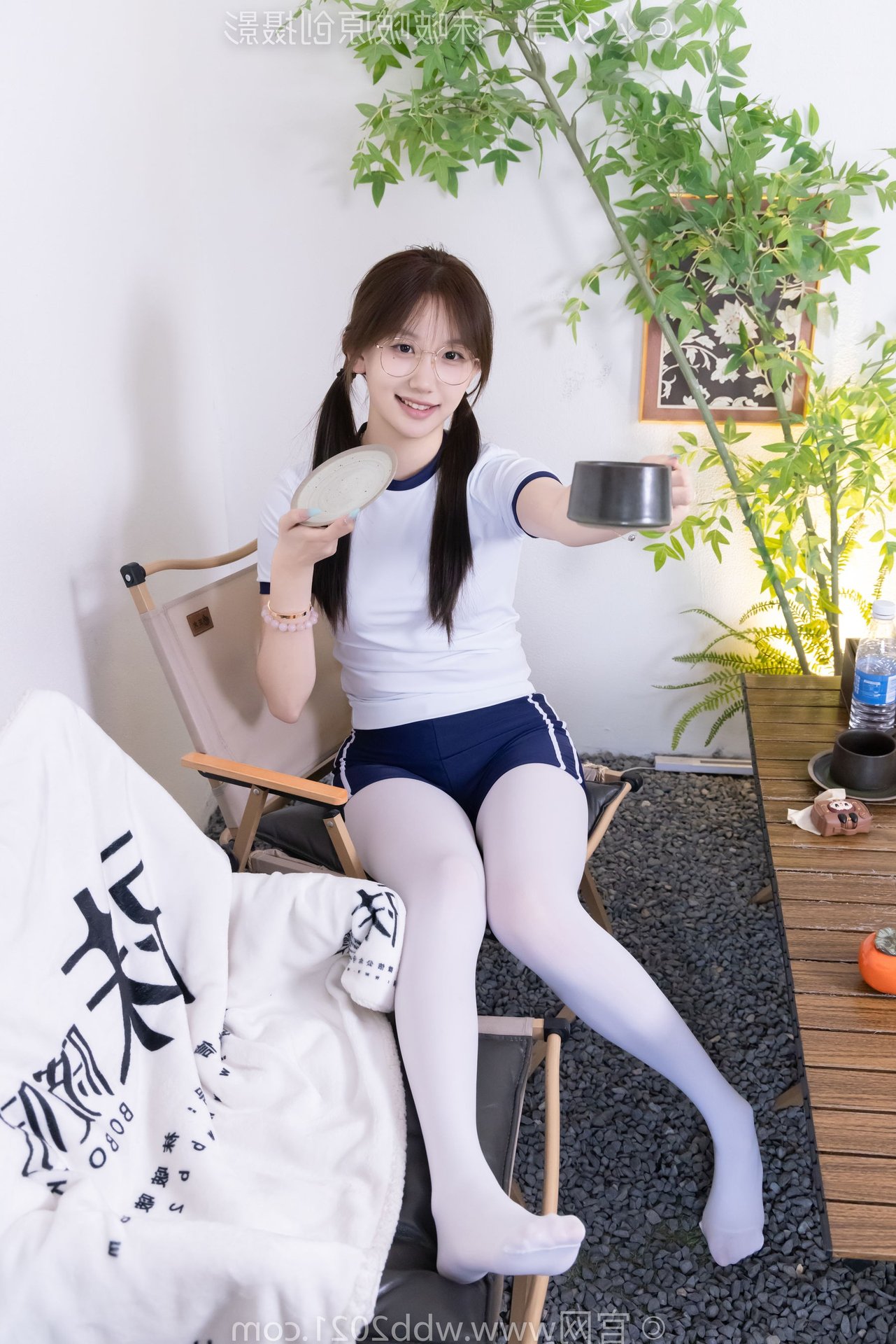 This captivating image features Chinese Model No.562 Xiangcai, radiating youthful charm and energy. Dressed in a vibrant sports outfit consisting of a white t-shirt and blue shorts, paired with thick white stockings, she embodies a blend of innocence and athleticism. Her gentle smile, playful pigtails, and stylish glasses enhance her pure and fresh appearance. The pose, with hands raised, suggests a dynamic and confident spirit, perfectly capturing the essence of a lively young woman. This photo is ideal for showcasing a youthful, sporty aesthetic with a touch of sweet purity.