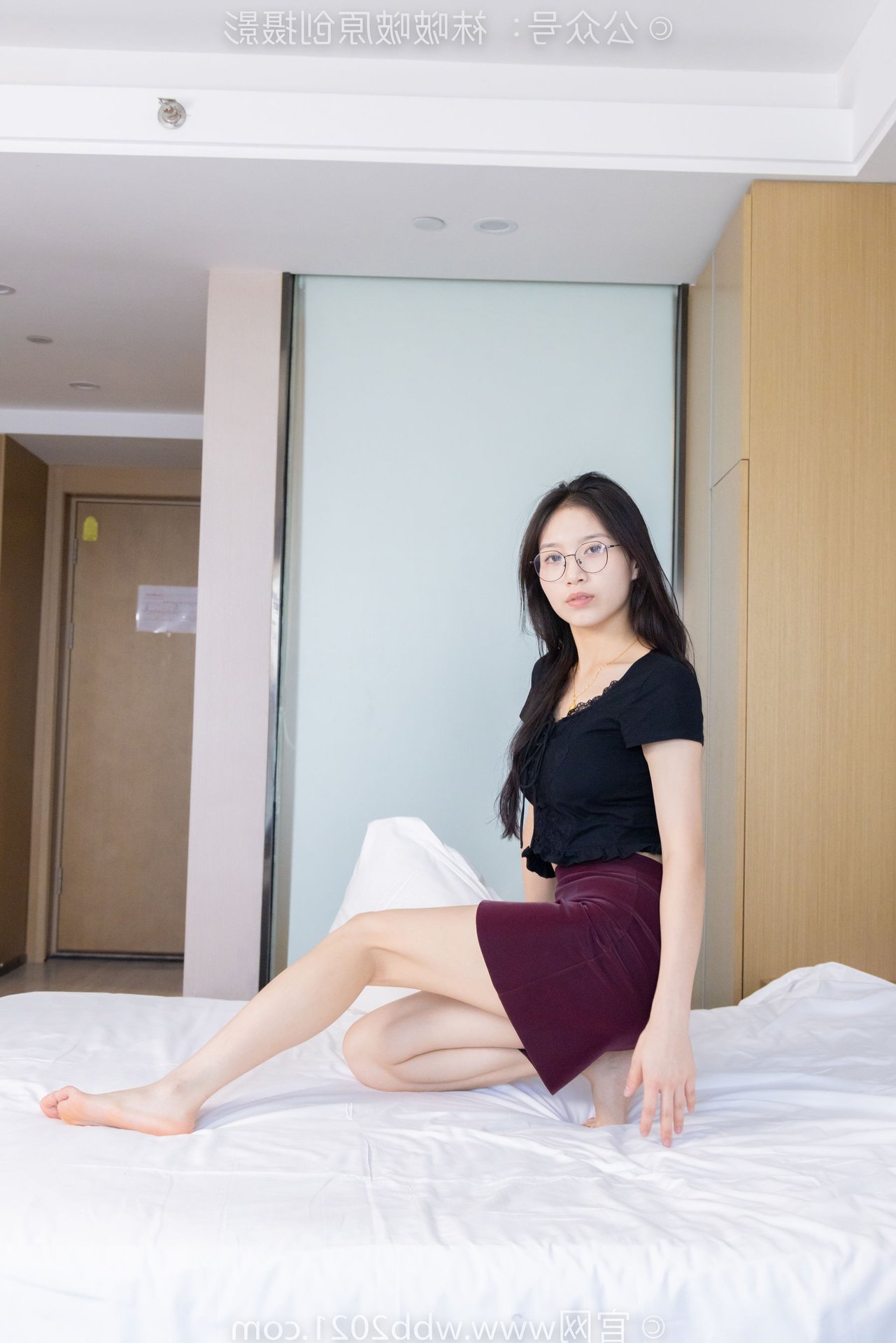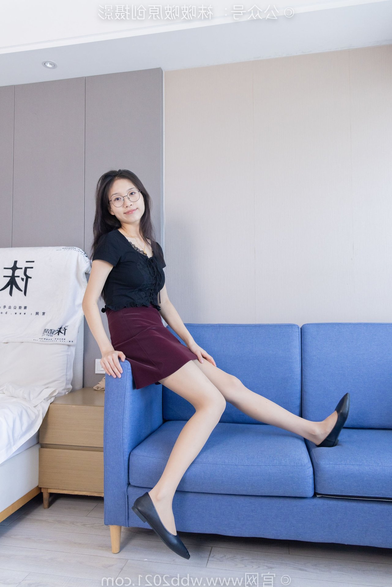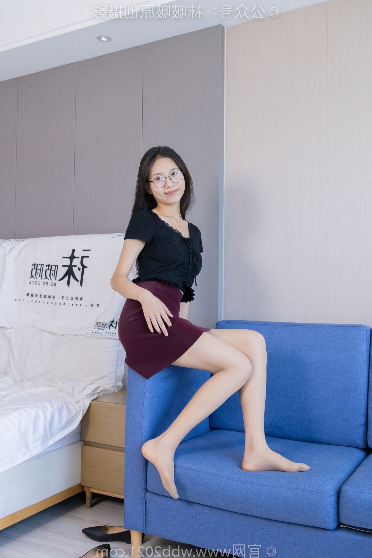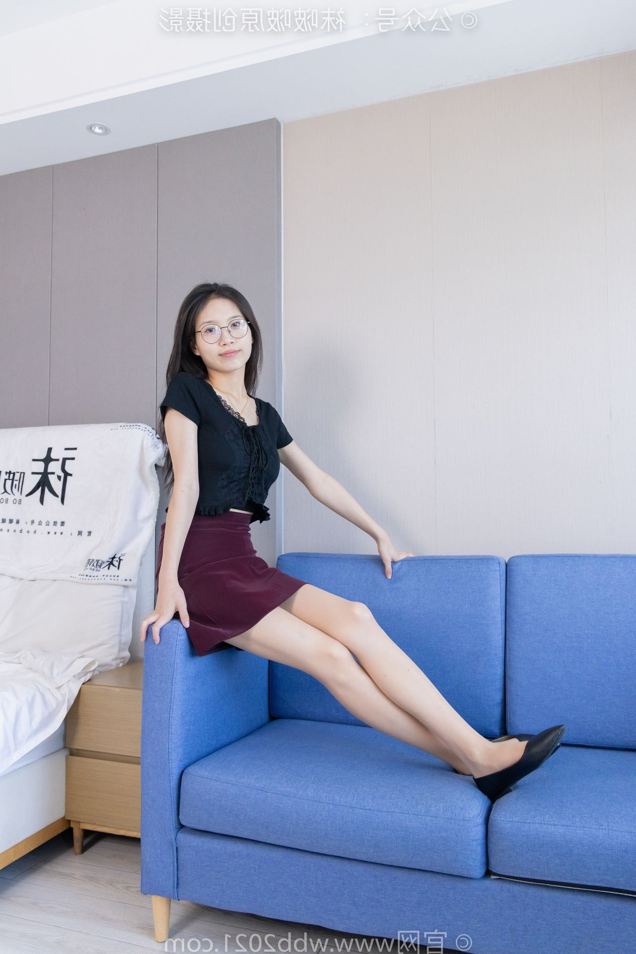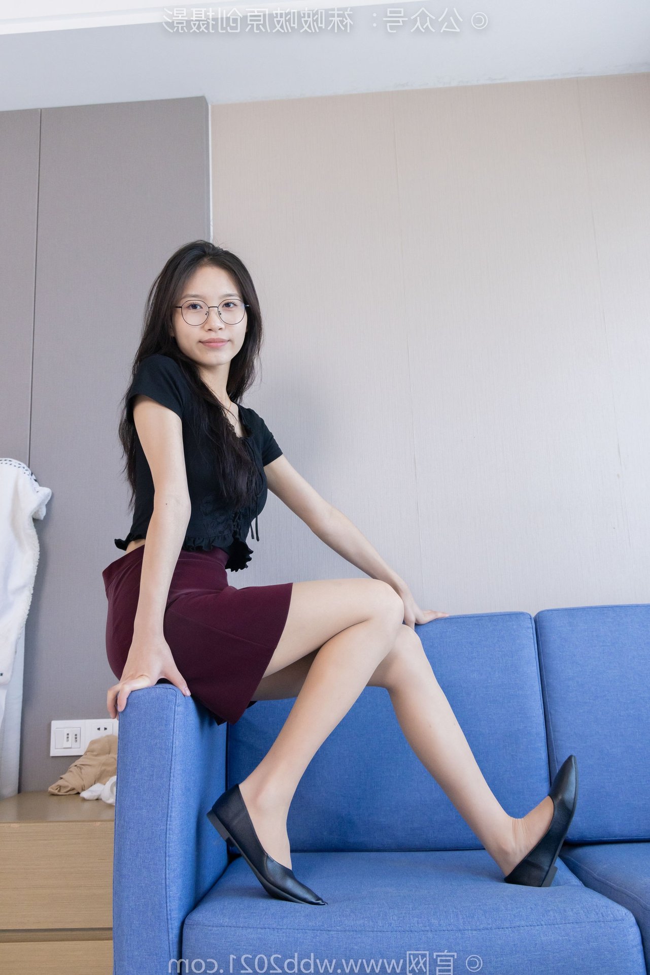 This captivating image features BoBoSocks Chinese Model No.554, exuding an elegant yet youthful charm. She sports a simple black top paired with a fashionable burgundy short skirt, accentuating her slender figure. The look is completed with chic black flat shoes, offering both comfort and a touch of feminine grace. While subtly visible, the thin sheer stockings, a highlight from the original description, add a delicate allure to her ensemble. With her long hair and glasses, she projects an intelligent and gentle aura. Model BoBoSocks No.554's confident and fresh demeanor, combined with her casual yet stylish outfit, makes this a perfect inspiration for everyday fashion enthusiasts.