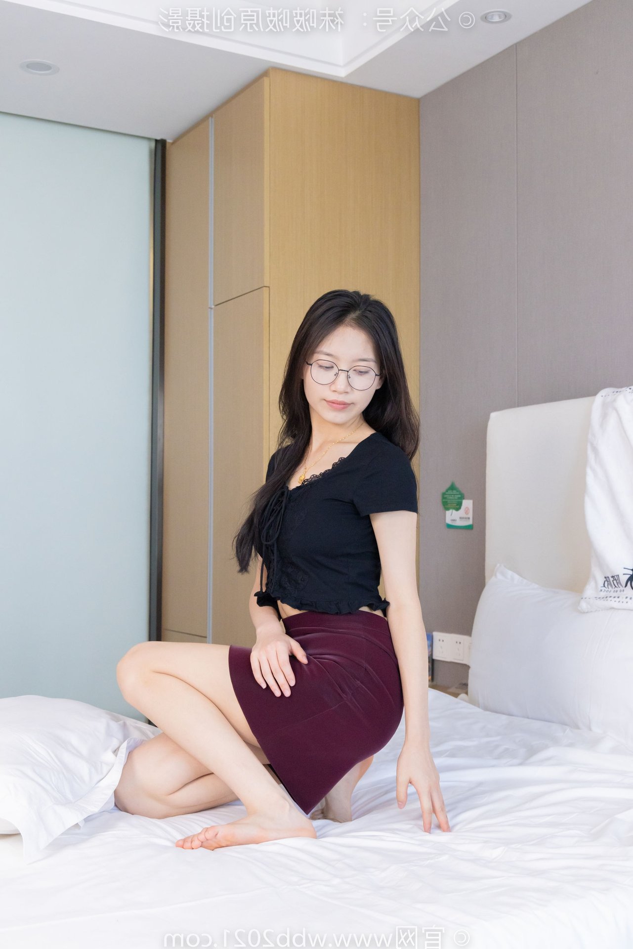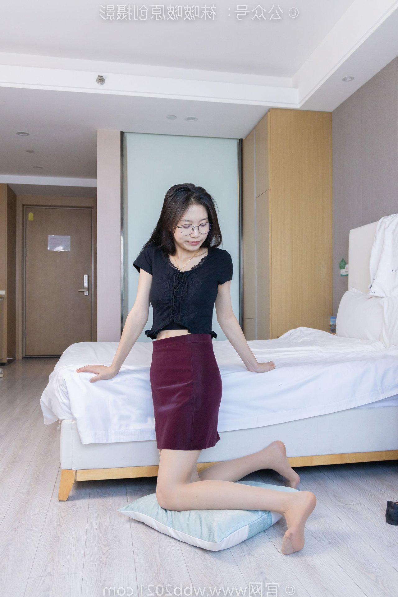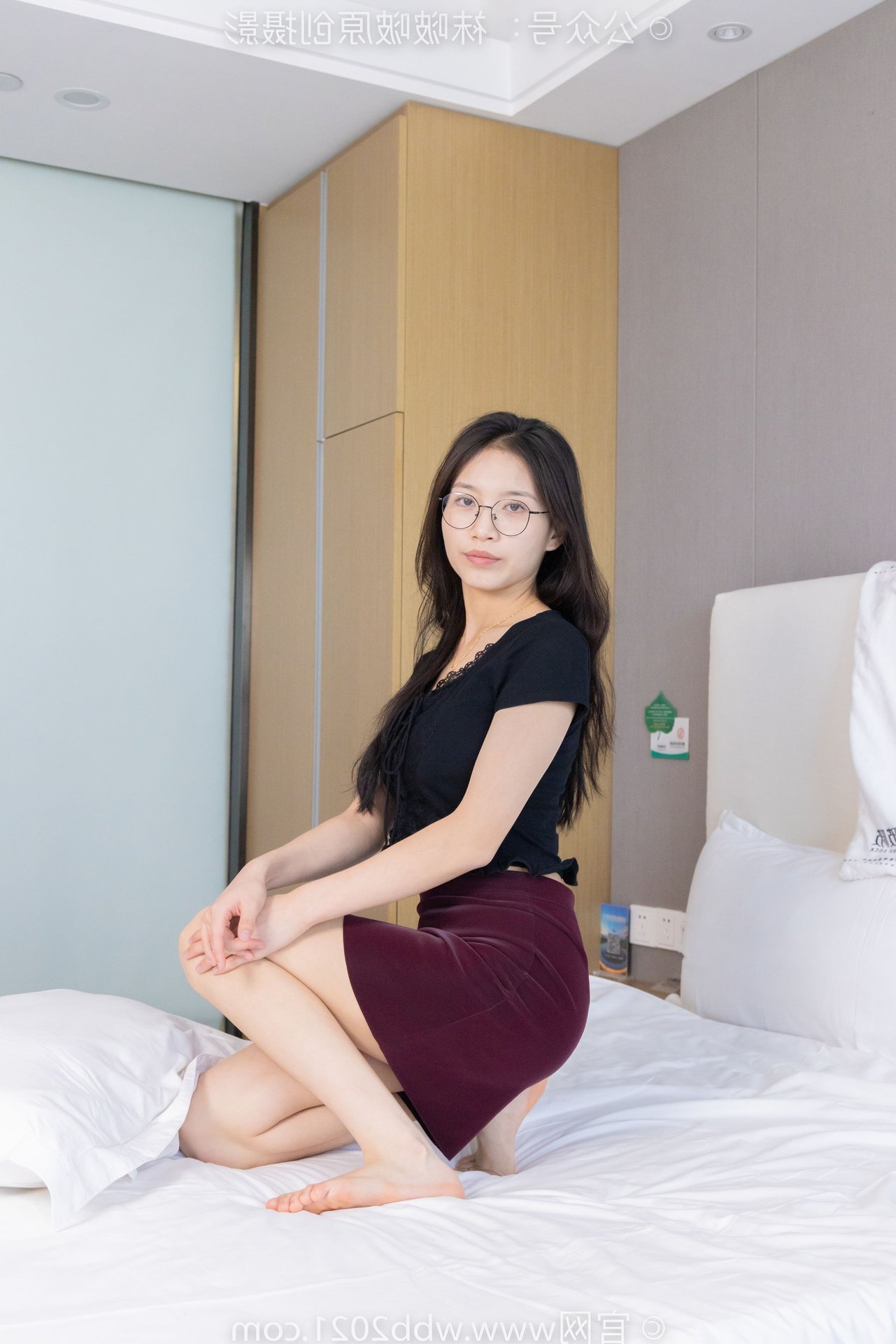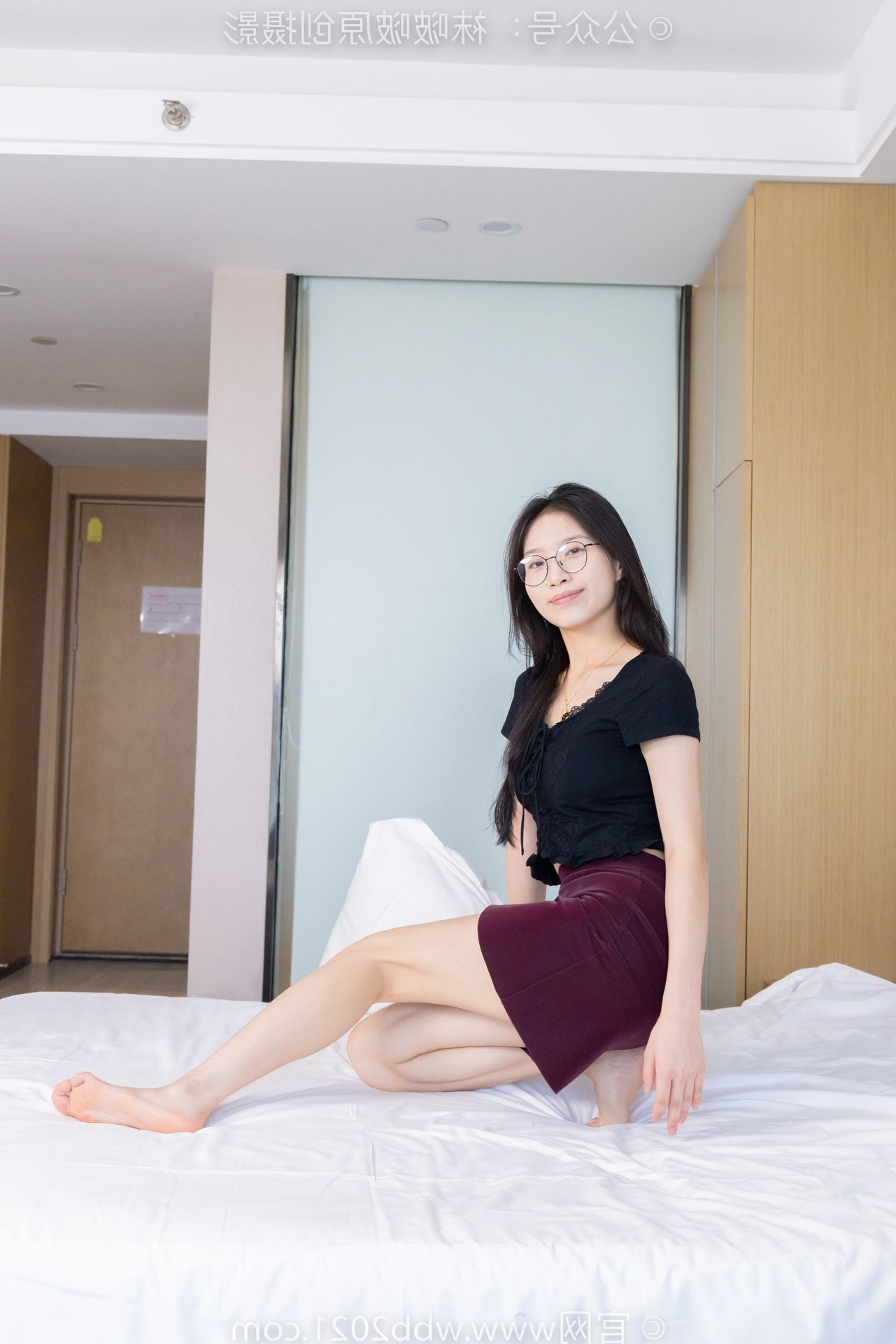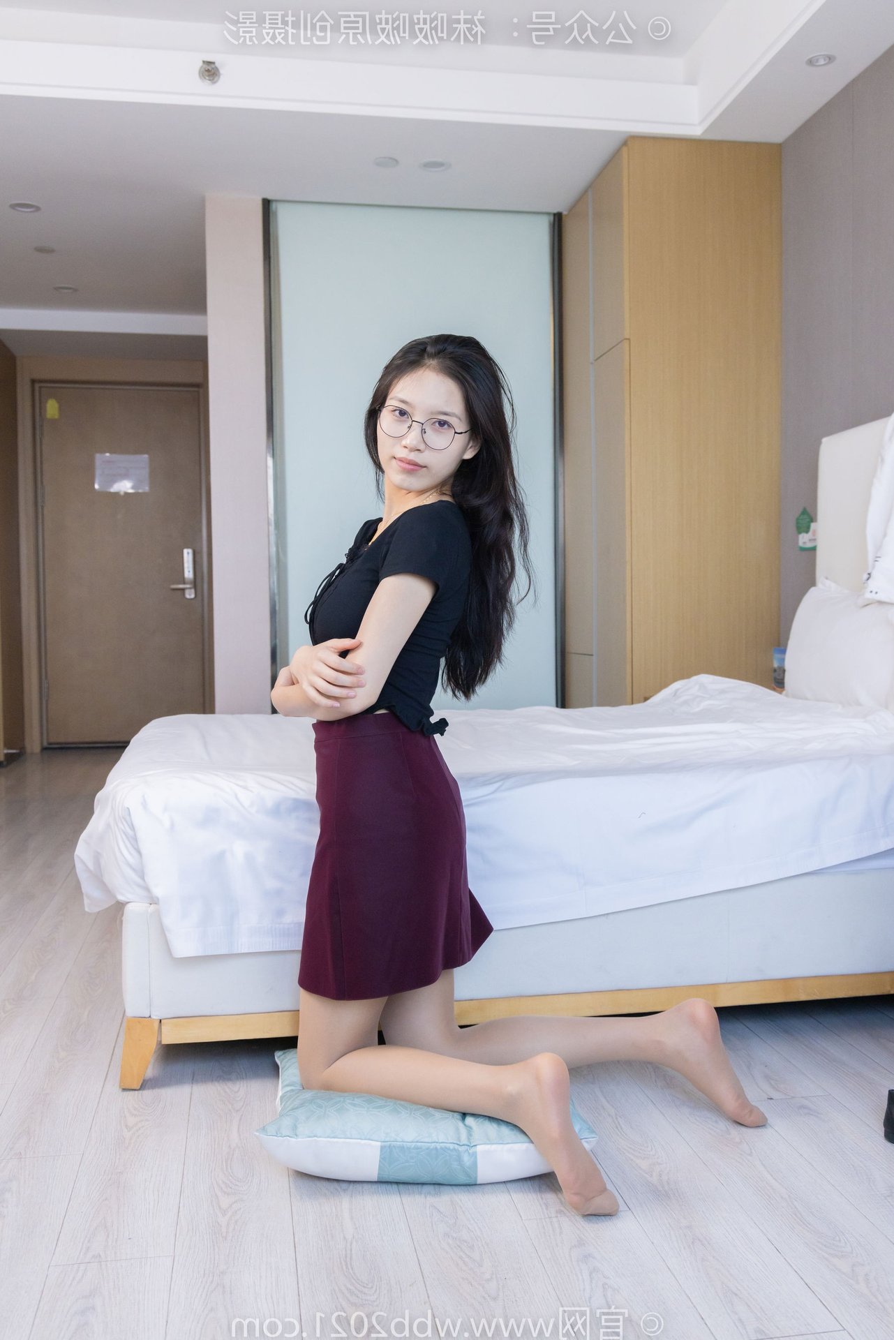 This captivating image features BoBoSocks Chinese Model No.554, exuding an elegant yet youthful charm. She sports a simple black top paired with a fashionable burgundy short skirt, accentuating her slender figure. The look is completed with chic black flat shoes, offering both comfort and a touch of feminine grace. While subtly visible, the thin sheer stockings, a highlight from the original description, add a delicate allure to her ensemble. With her long hair and glasses, she projects an intelligent and gentle aura. Model BoBoSocks No.554's confident and fresh demeanor, combined with her casual yet stylish outfit, makes this a perfect inspiration for everyday fashion enthusiasts.
