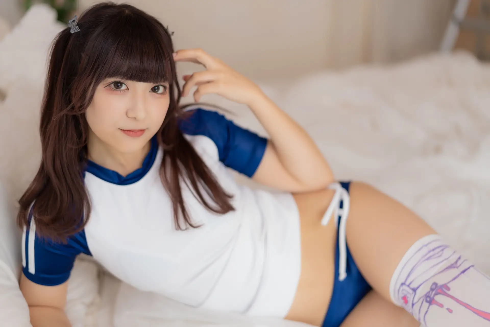 Ai Takanashi 高梨あい shines with youthful beauty and vibrant energy in her unique #ROM02 photoshoot. She captivates in a dynamic blue and white sportswear outfit, paired with matching shorts and delicate patterned thigh-high stockings, creating a look that is both adorable and alluring. Ai Takanashi's gentle smile and sparkling eyes against the pristine white bed evoke a sweet and intimate feeling. This photograph not only celebrates her slender figure but also perfectly conveys her characteristic playful and captivating charm, sure to enchant every gaze.#AiTakanashi #SportswearFashion #ThighHighs #GravureIdol #ROM02