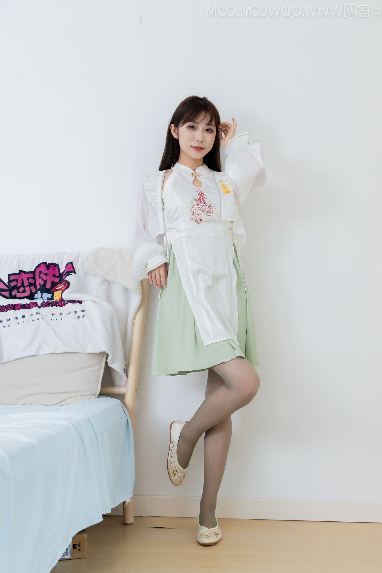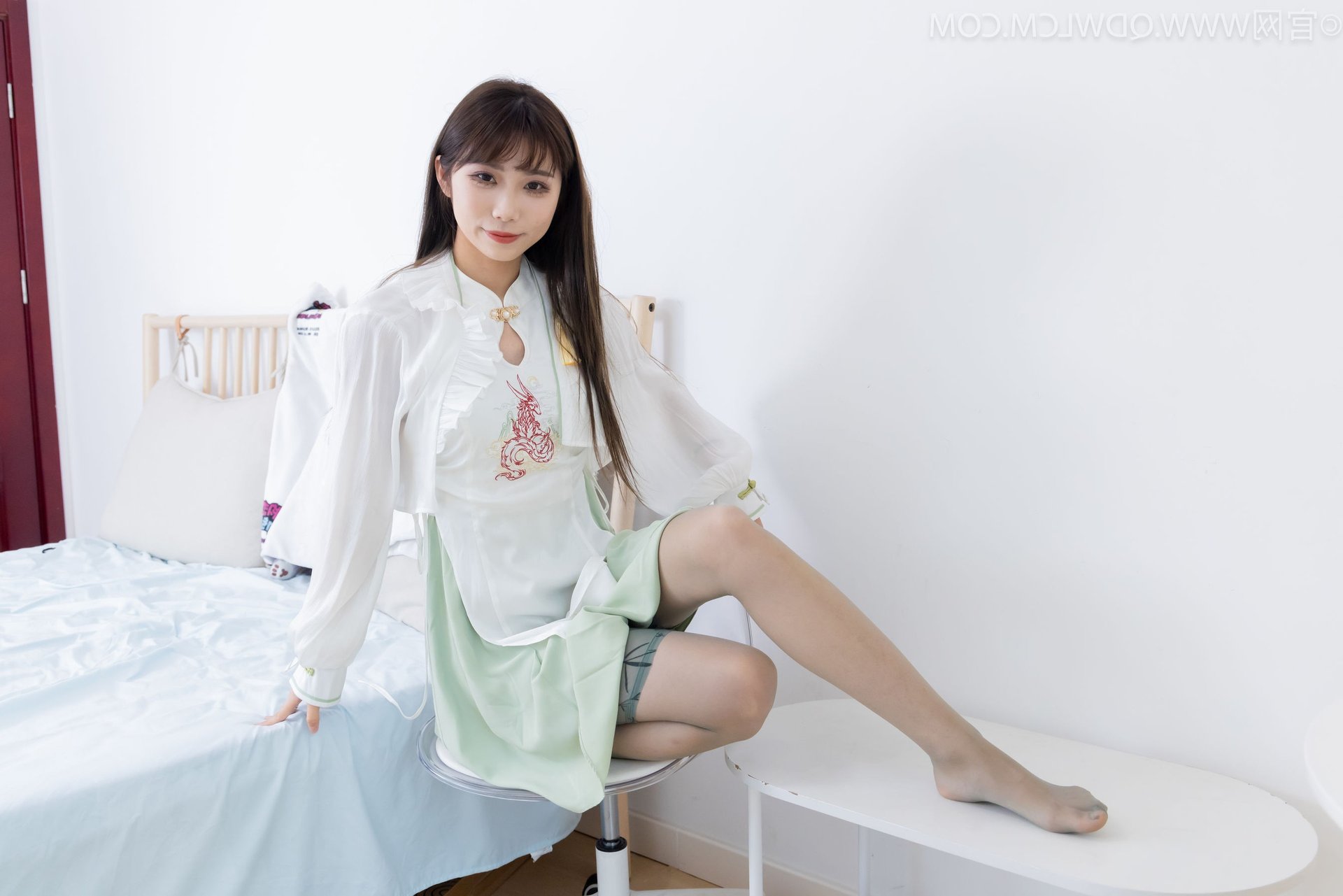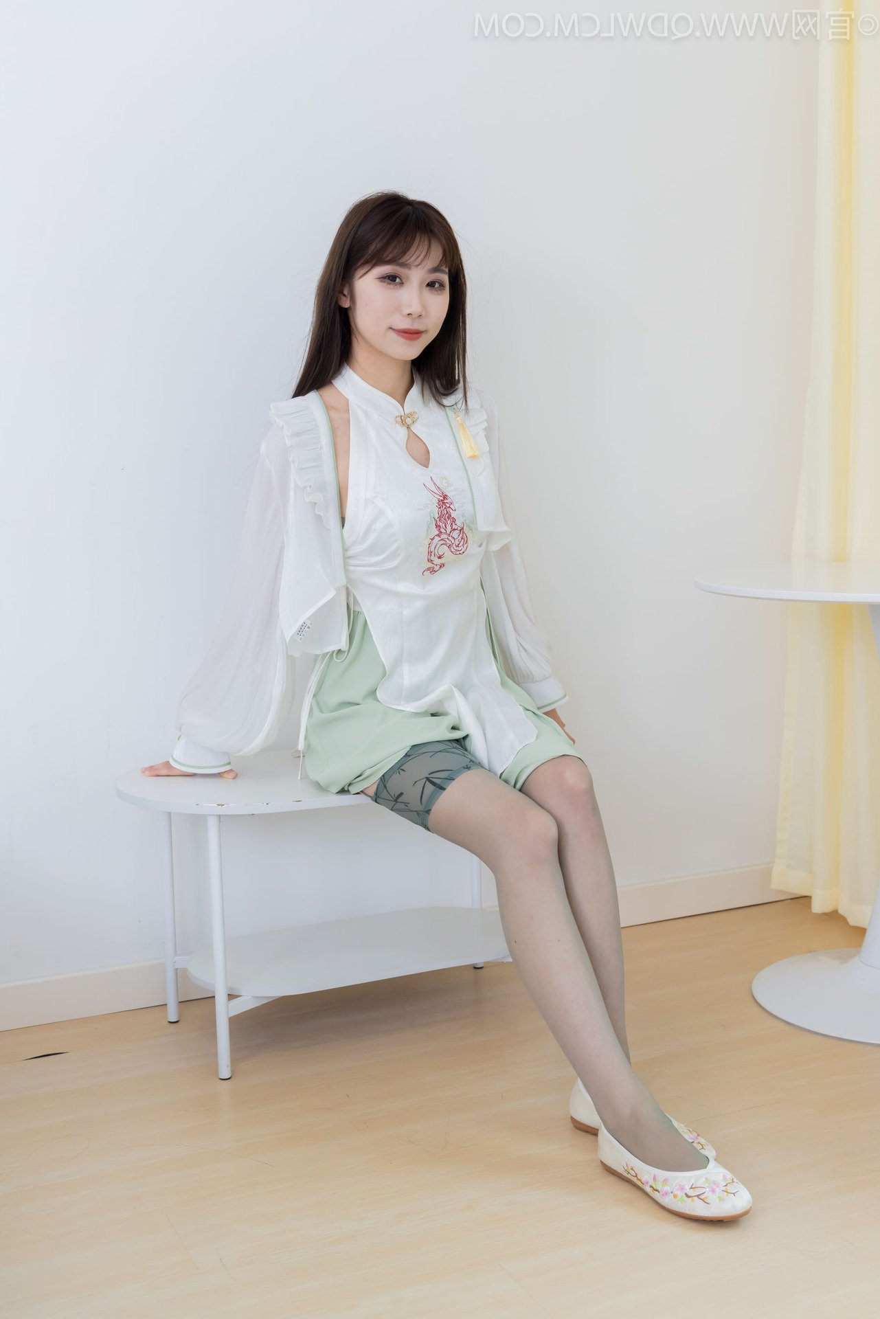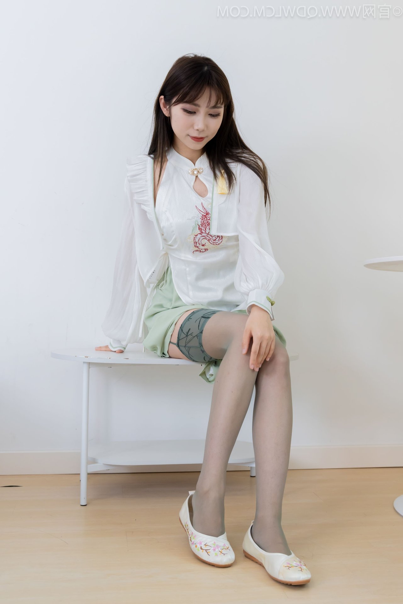 Discover the exquisite charm of Chinese Model No.2323 Pao Pao, showcasing a beautiful blend of traditional and contemporary fashion. This graceful model captivates in a modern Hanfu-inspired white top paired with a delicate light green skirt and stylish white flat shoes. A striking feature is the elegant over-the-knee stockings in a subtle smoky grey hue, adding a touch of classic sophistication to her modern ensemble. With her long flowing hair and gentle gaze, the model radiates an ethereal Asian beauty and refined elegance. This image beautifully captures her unique fashion sense and embodies the confident yet demure aura of the model.