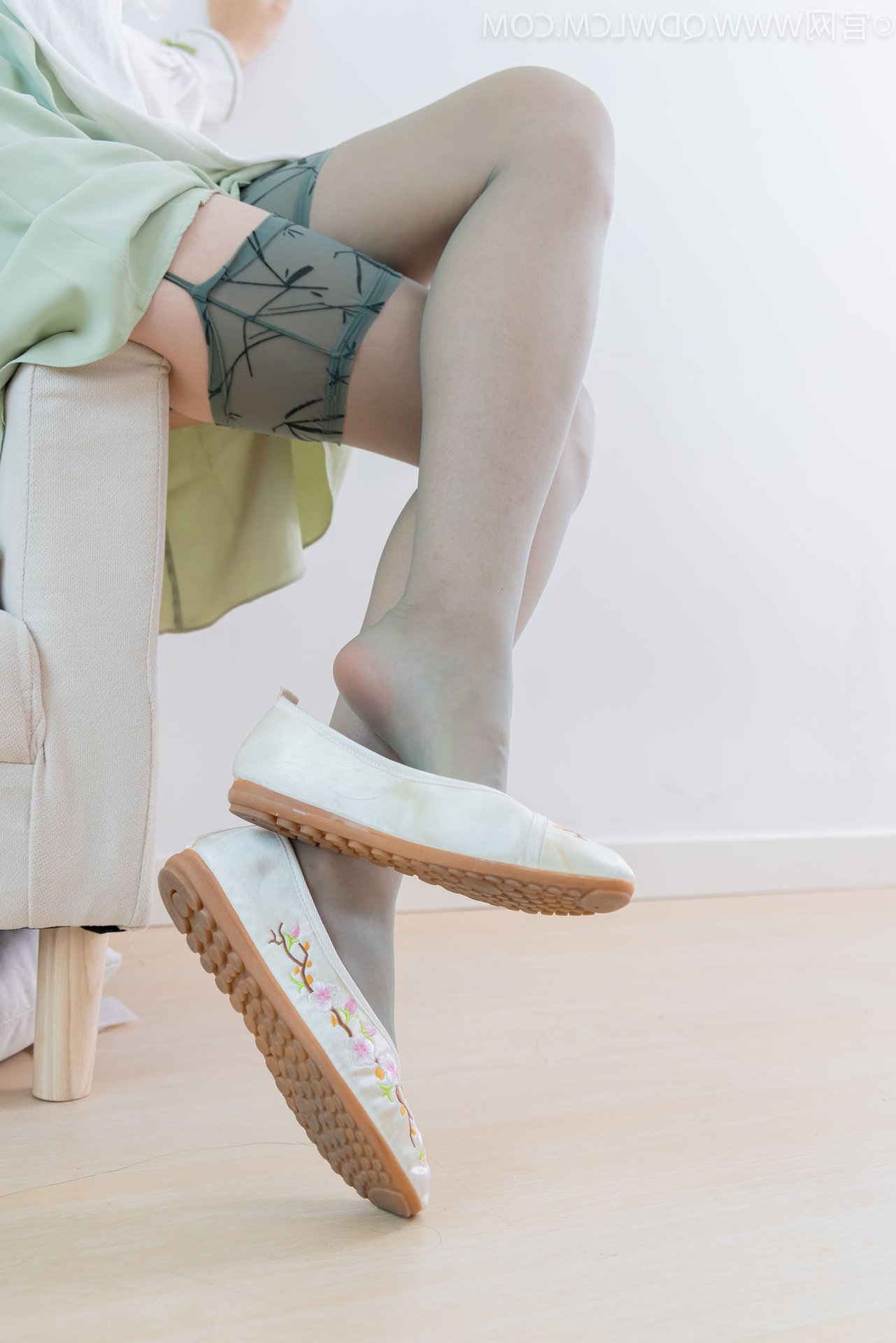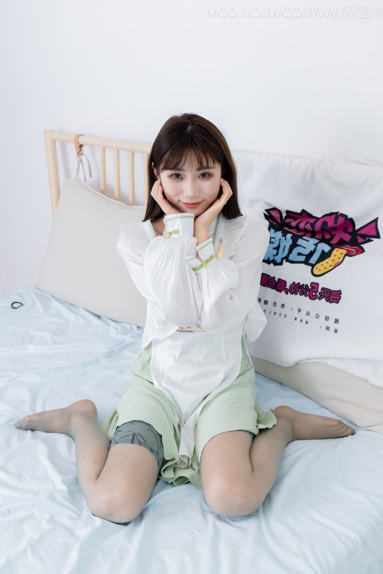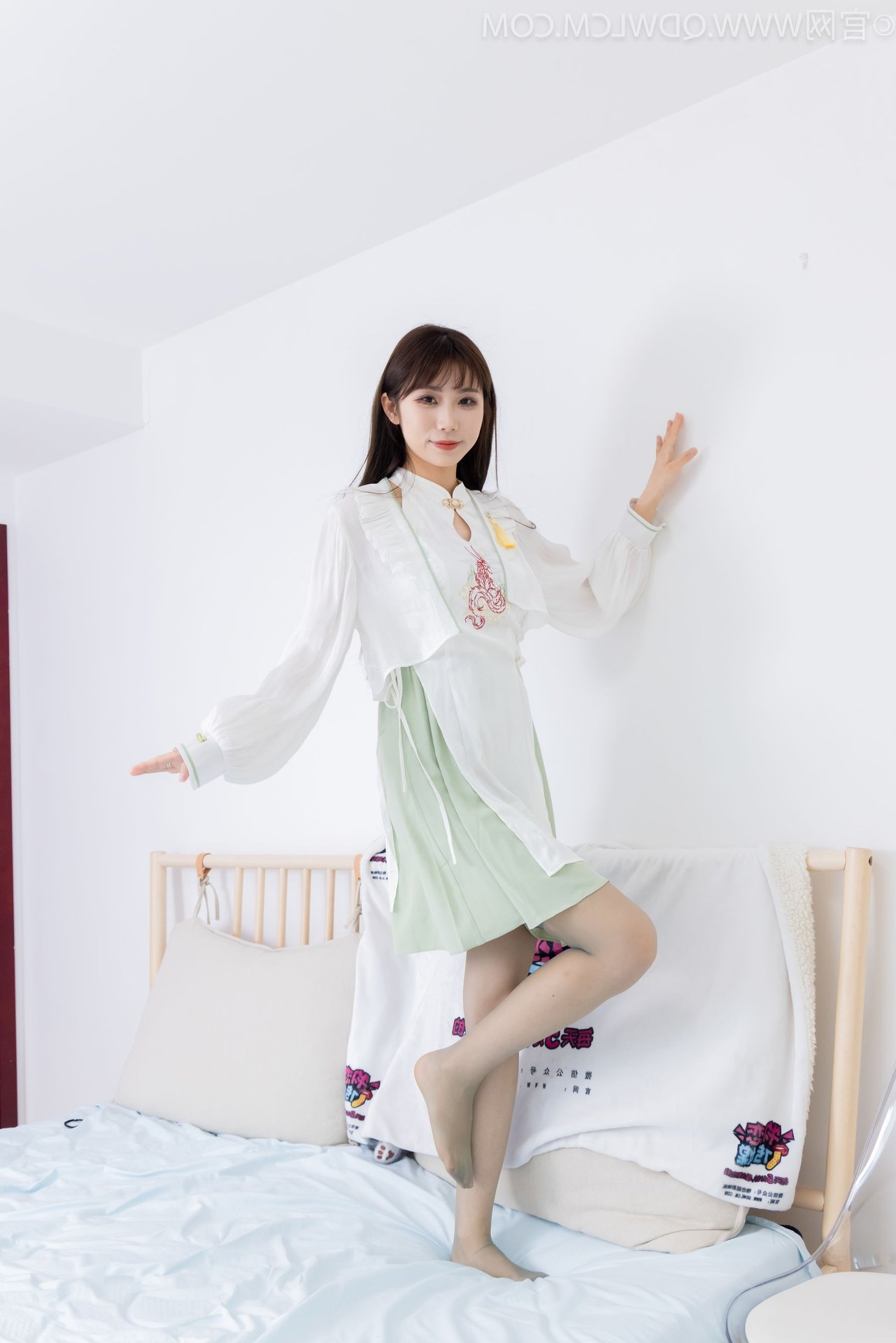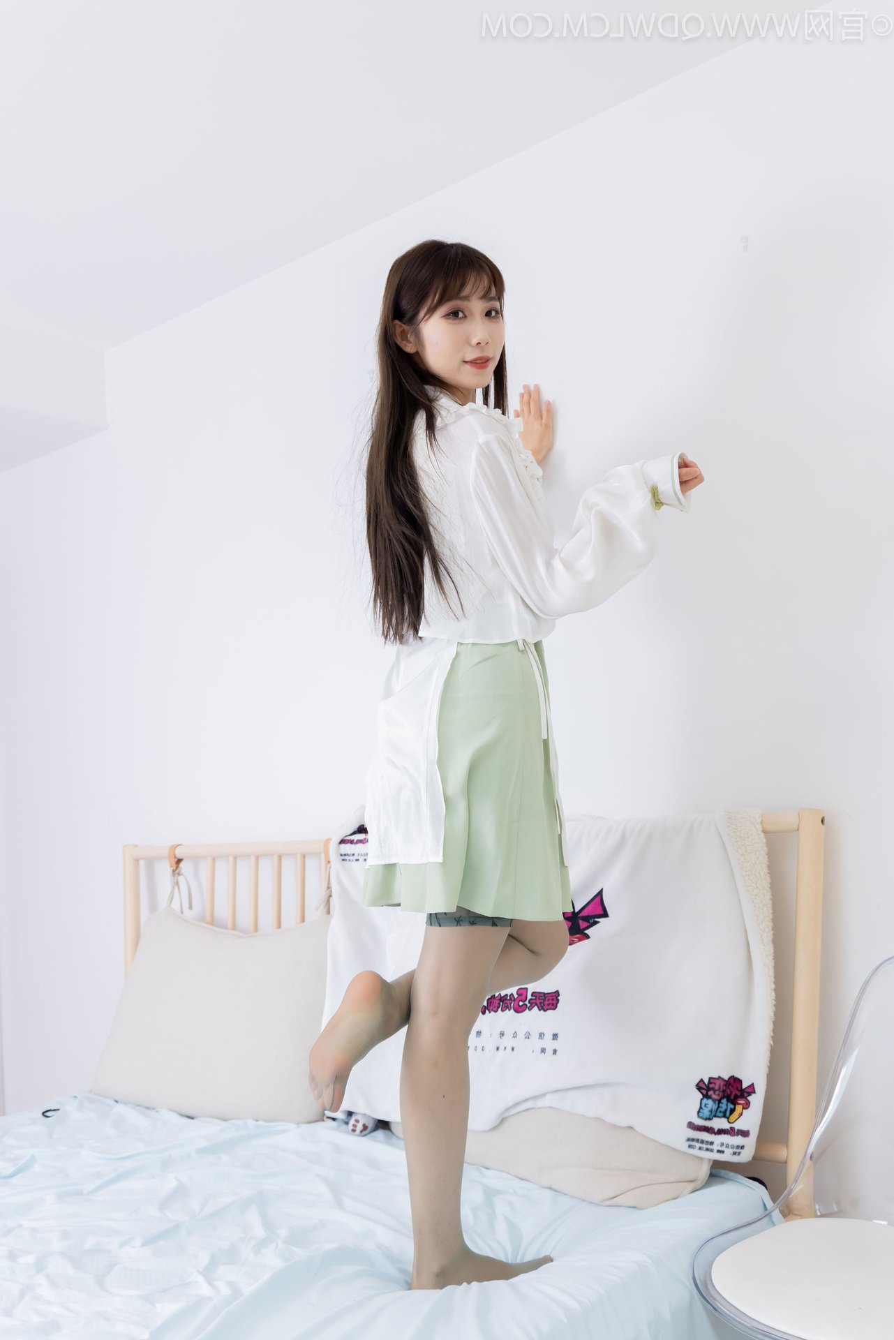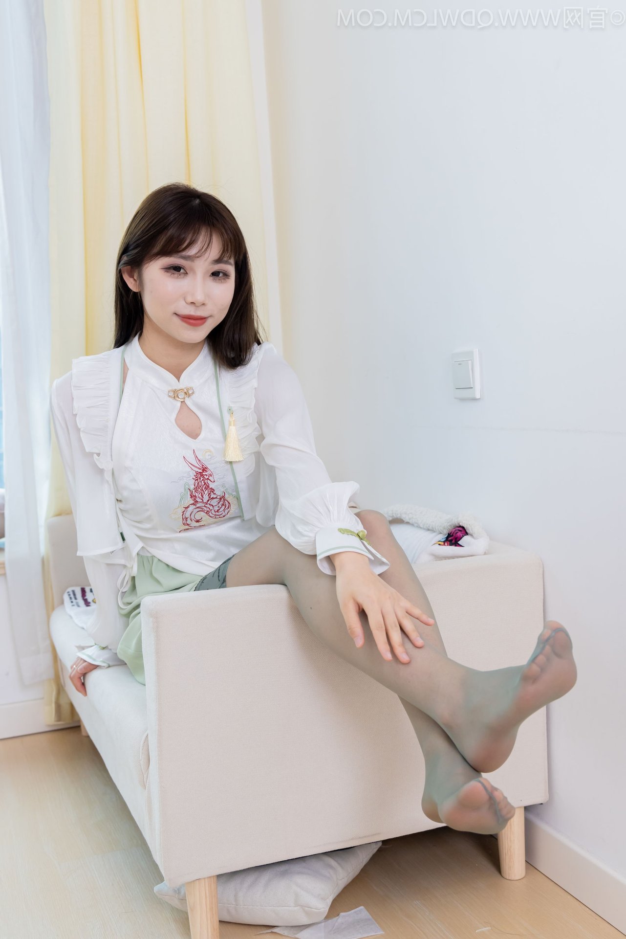 Discover the exquisite charm of Chinese Model No.2323 Pao Pao, showcasing a beautiful blend of traditional and contemporary fashion. This graceful model captivates in a modern Hanfu-inspired white top paired with a delicate light green skirt and stylish white flat shoes. A striking feature is the elegant over-the-knee stockings in a subtle smoky grey hue, adding a touch of classic sophistication to her modern ensemble. With her long flowing hair and gentle gaze, the model radiates an ethereal Asian beauty and refined elegance. This image beautifully captures her unique fashion sense and embodies the confident yet demure aura of the model.