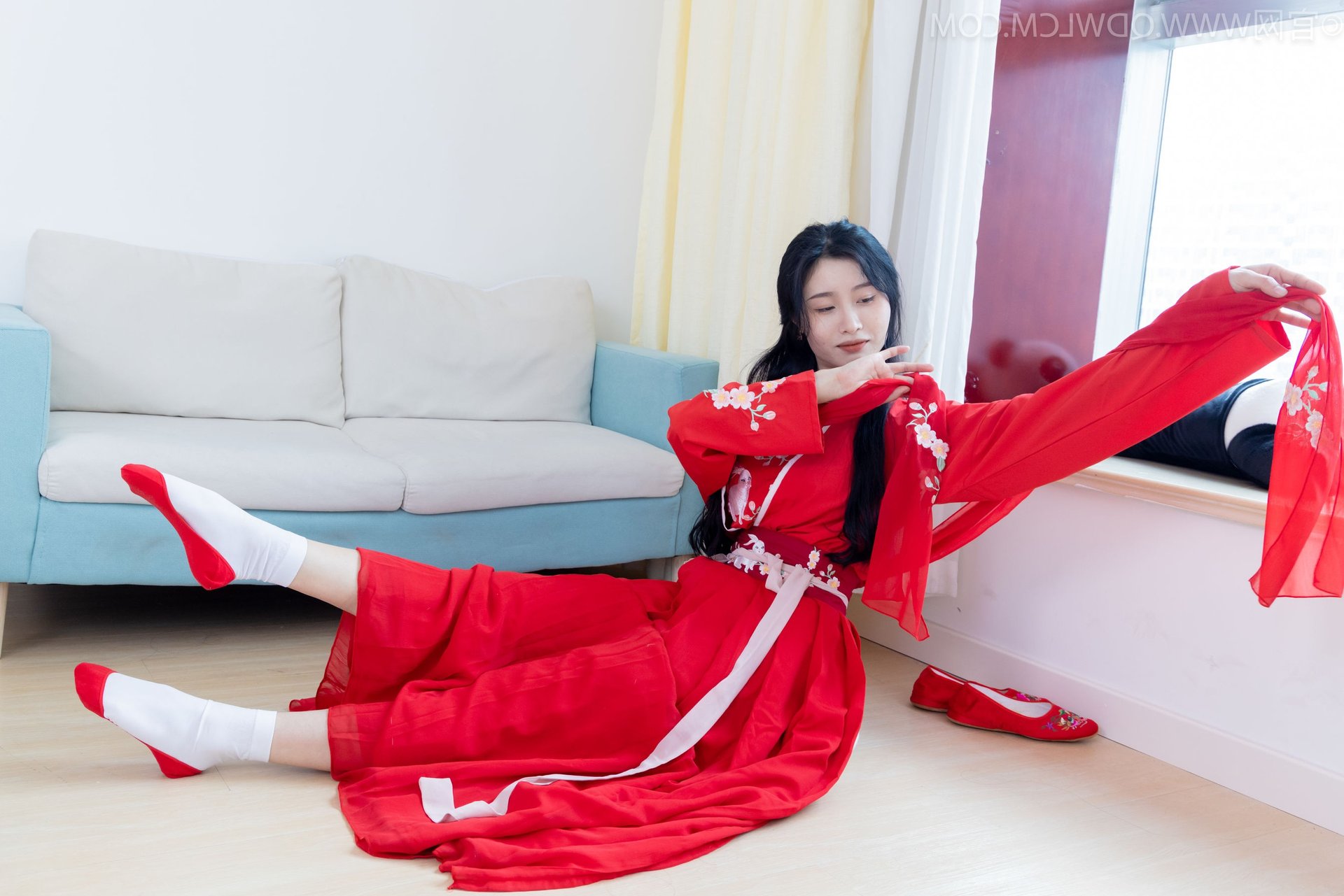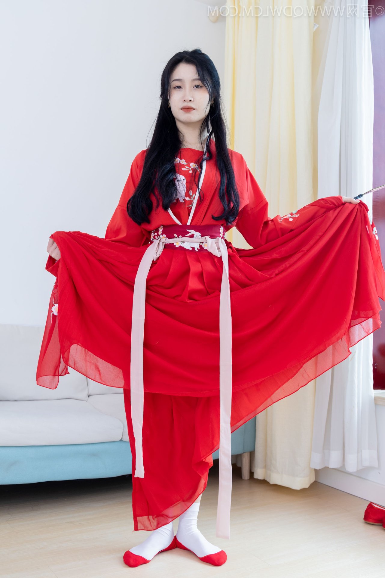 This stunning image features Chinese Model Rongrong No2328 gracefully adorned in a vibrant red Hanfu. The intricately designed traditional attire with its soft lines and elegant white sash highlights her delicate beauty. Rongrong complements her ensemble with pristine white socks and classic red cloth shoes creating a perfectly harmonious look. Her graceful pose and captivating gaze exude an ethereal charm and a timeless classical aesthetic deeply rooted in East Asian culture. This portrayal beautifully blends traditional fashion with a modern sensibility offering a profound glimpse into the enduring elegance of Hanfu.