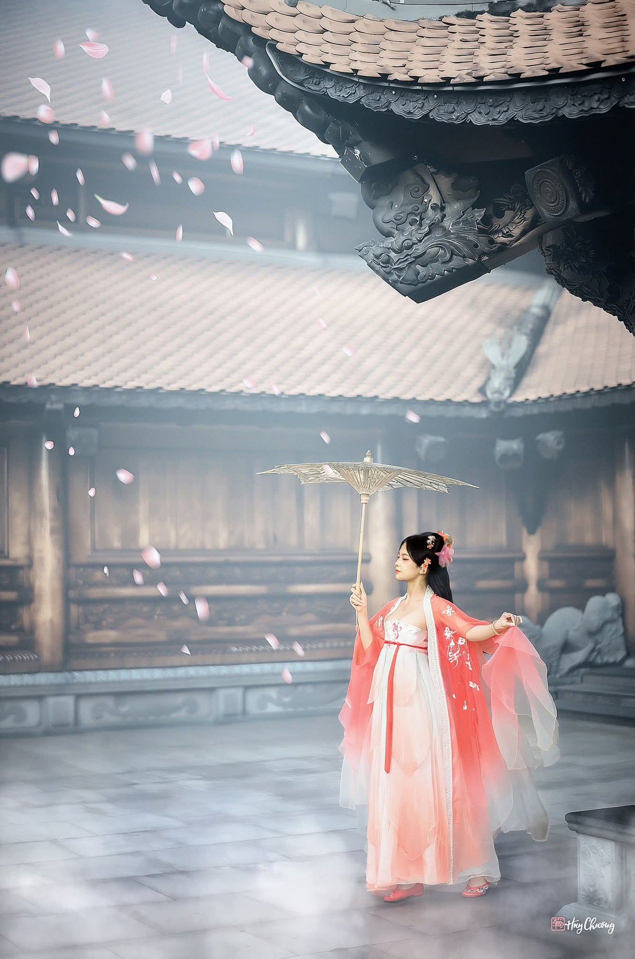 This exquisite photograph captures a young woman embodying the serene grace of Asian beauty, adorned in a delicate light pink Hanfu, intricately embroidered. She stands elegantly in a lush garden, where the foliage hints at autumn's embrace with touches of red and orange, creating a truly romantic and picturesque backdrop. A traditional yellow paper umbrella, held with a gentle poise, serves as a charming accent, further enhancing her classic and refined appearance. Her soft gaze and subtle smile, combined with the ethereal mist at her feet, transport viewers into a scene straight out of an ancient fairy tale. More than just a portrait, this image celebrates cultural heritage and traditional aesthetics, evoking a sense of peaceful nostalgia and timeless charm.#VGU #Hanfu #AsianBeauty #Traditional #Garden #Portrait