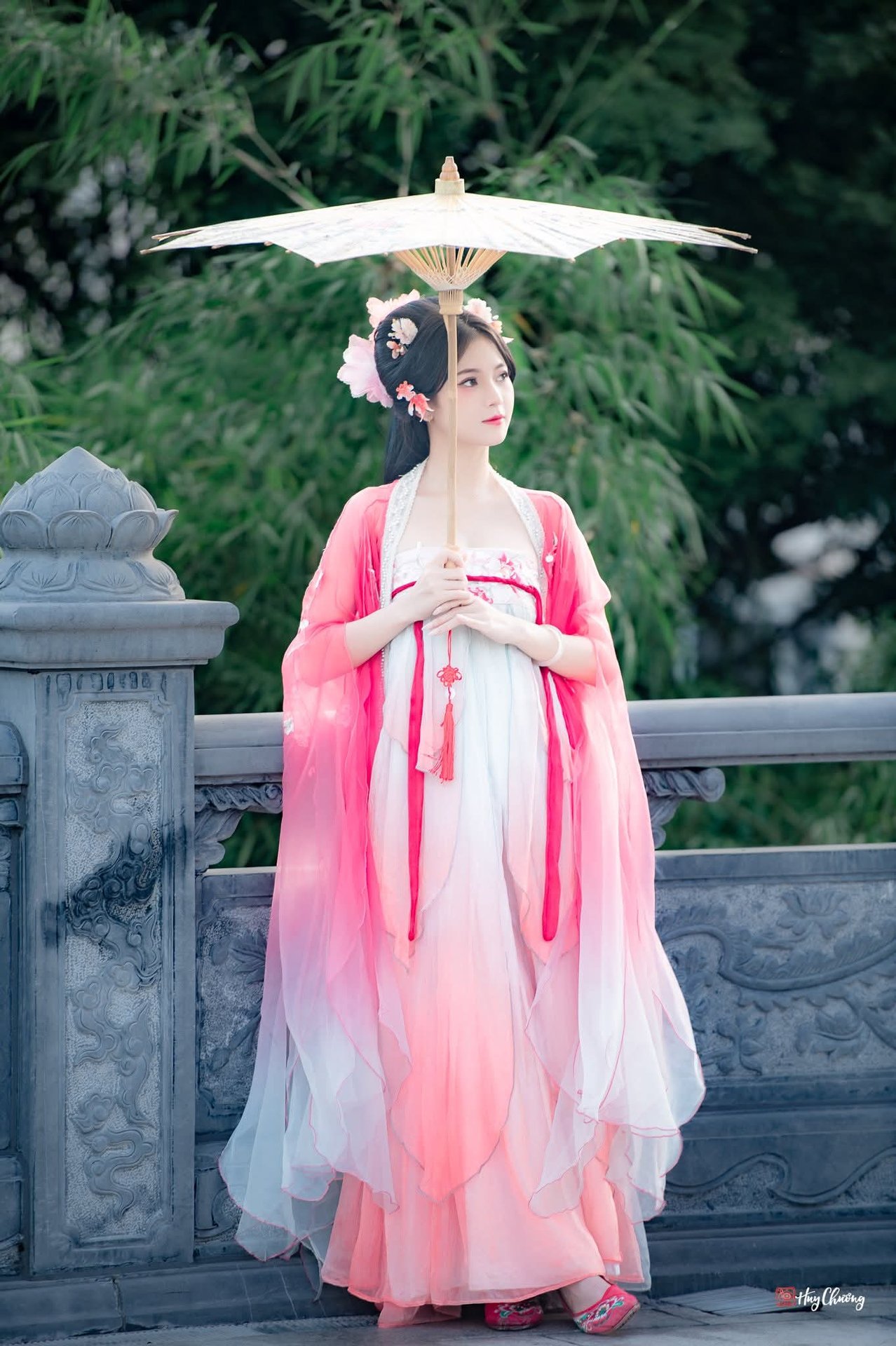 This exquisite image captures a gentle young woman adorned in a beautiful pink and white ombre Hanfu embodying the elegant and classic beauty of East Asia. Her hair is styled in a refined updo adorned with fresh flowers as she poses gracefully with a delicate white fan in hand. A traditional oil-paper umbrella rests beside her enhancing the poetic and serene ambiance. This portrayal beautifully represents the grace and sophistication inherent in traditional costume culture offering a captivating visual experience.