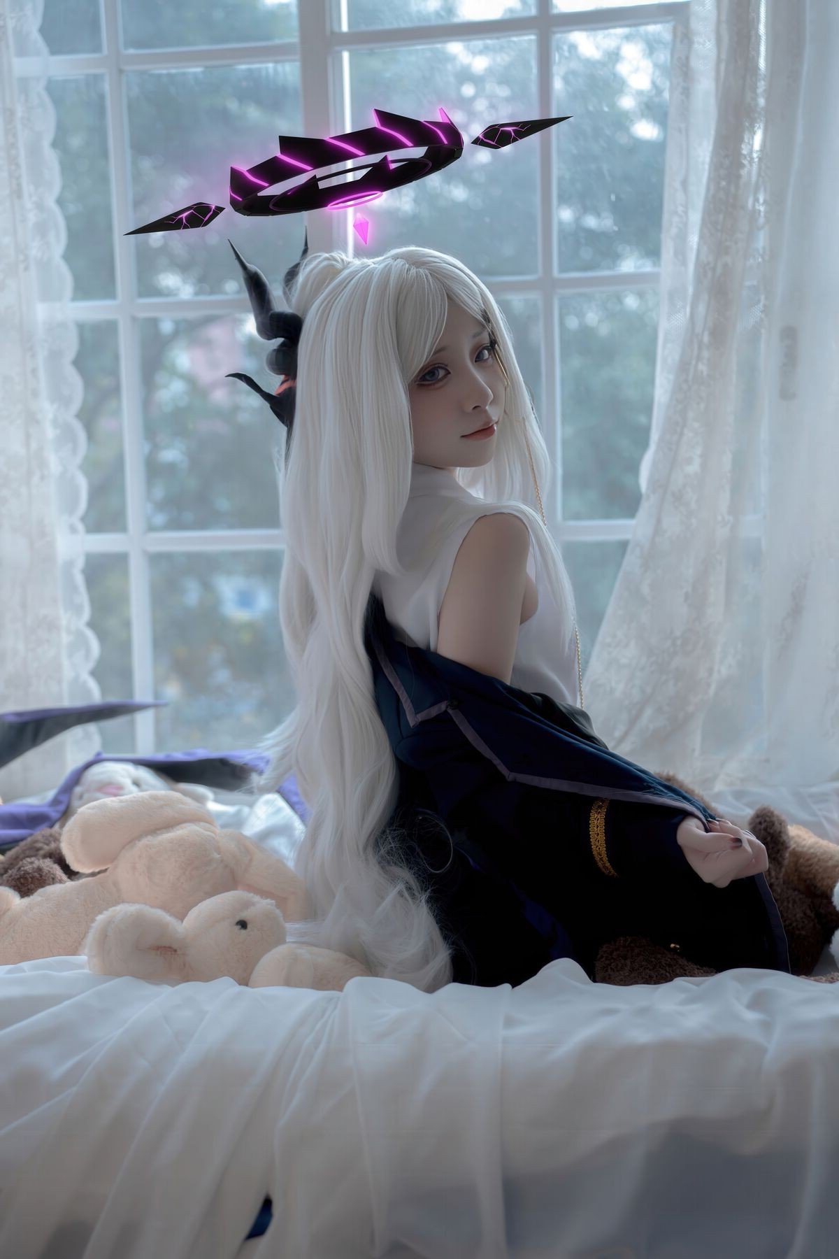 In this captivating Cosplay photoshoot Coser Zhi Yue Etsu ko embodies the character Hina Original with charming cat ears and a striking outfit Her delicate beauty long flowing hair and purple thigh high stockings create an irresistible allure Posing by the window bathed in natural light the character exudes a dreamy and enchanting charm The soft setting complemented by subtle accessories highlights the captivating appeal of the cosplay This collection not only showcases the cosplayers talent but also delivers artistic moments filled with emotion It is undoubtedly a highly admired and sought after work.