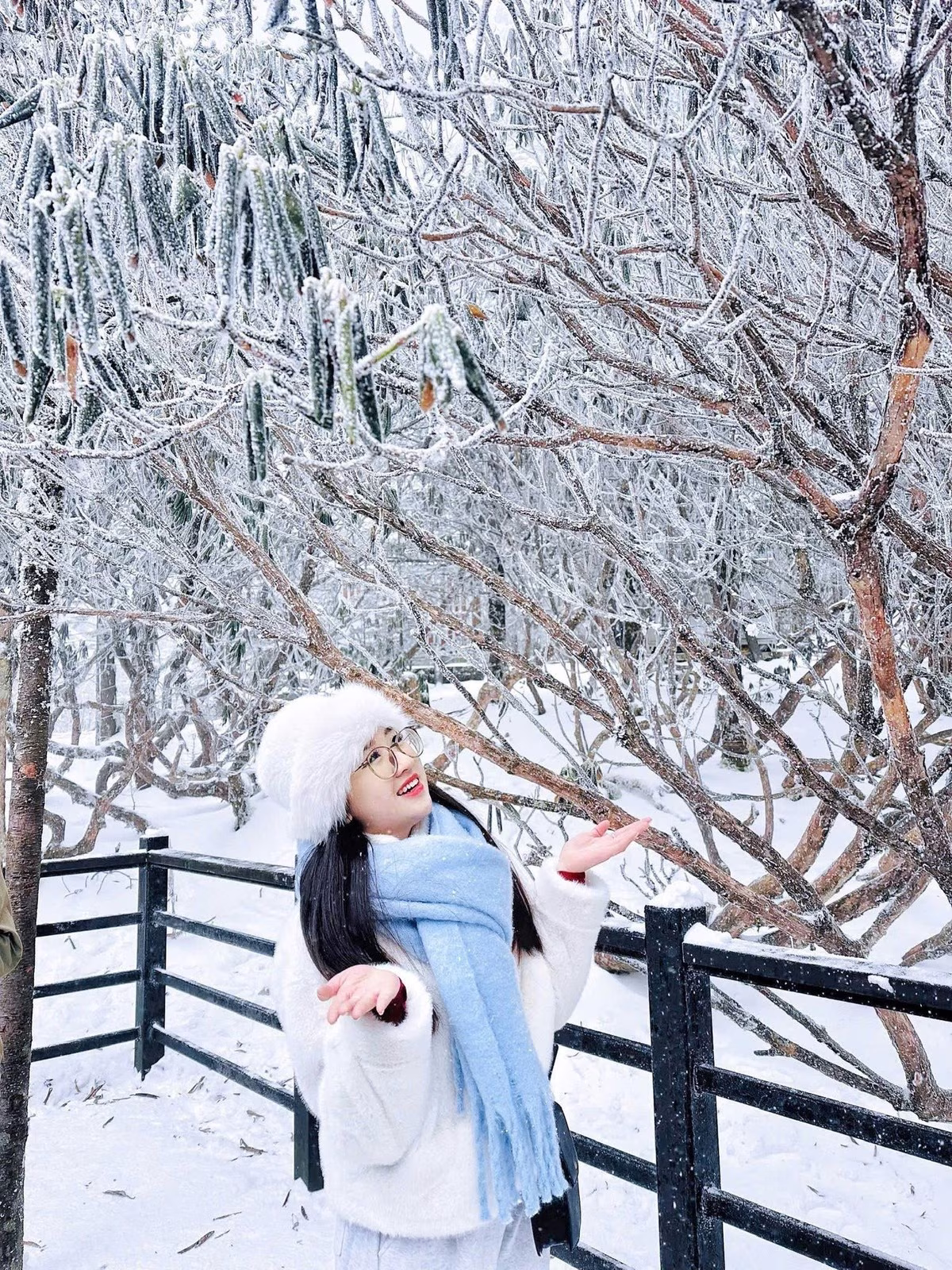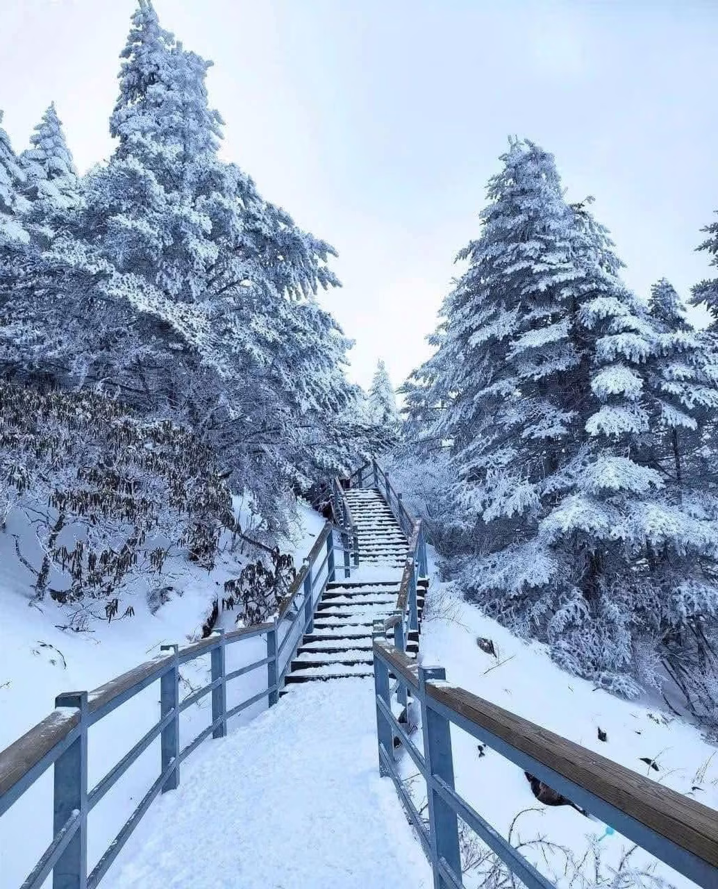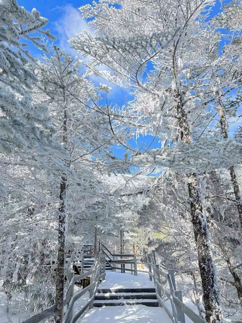 This stunning image transports us to a magnificent snow paradise in Yunnan China likely Mount Jiaozishan A winding snow-covered path ascends through majestic silver-dusted pine trees creating a breathtaking and poetic winter landscape It is a fantastic opportunity for travelers to experience the snow-covered winter and explore the pristine beauty of nature Conquering high peaks is not just a challenging journey but also a chance to immerse yourself in a peaceful environment When planning your trip choose a Yunnan tour that suits your preferences and prepare your gear carefully to ensure safety Enjoy the fresh air and capture precious moments in this magical land an unforgettable experience for every adventurous soul