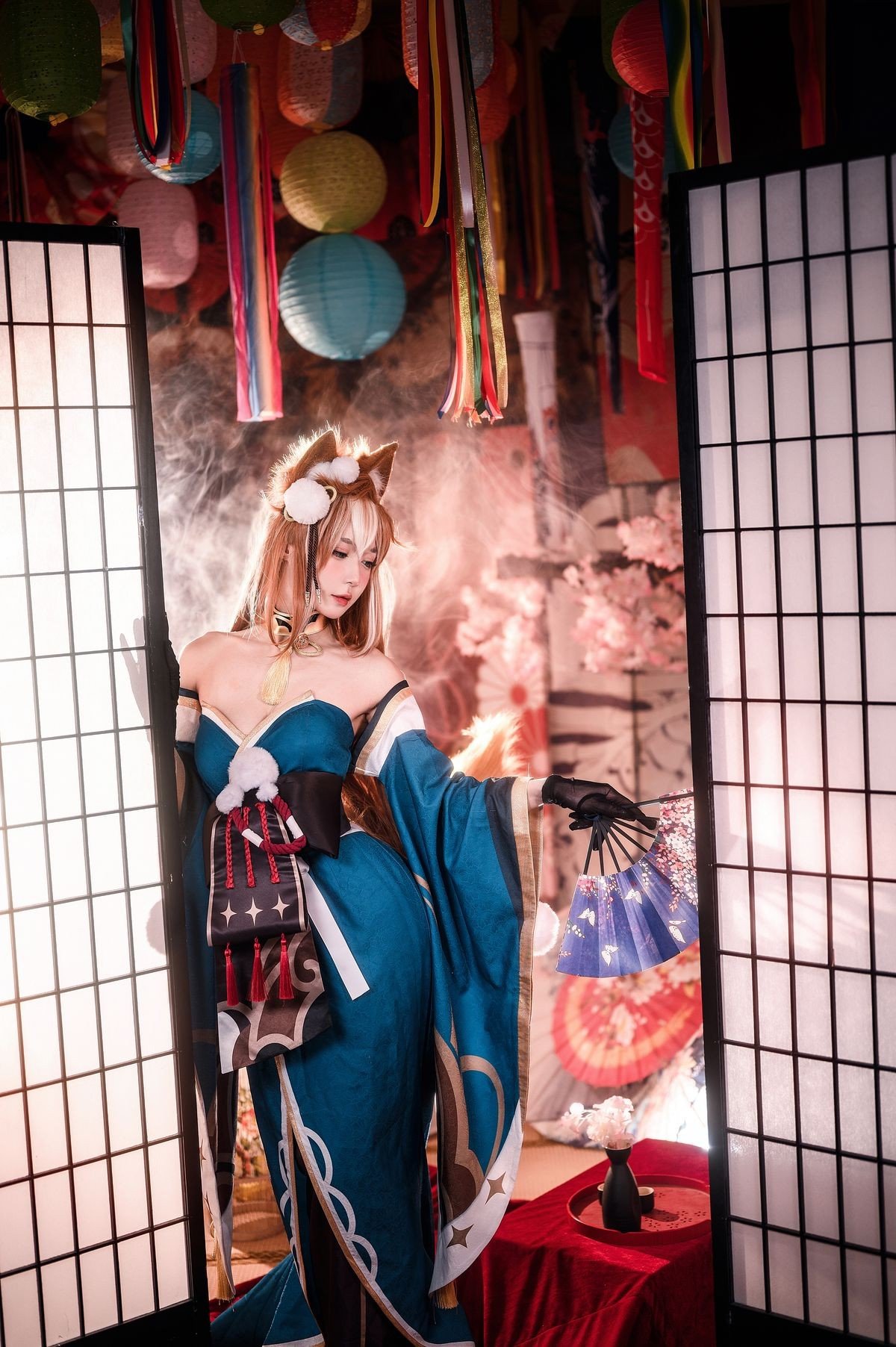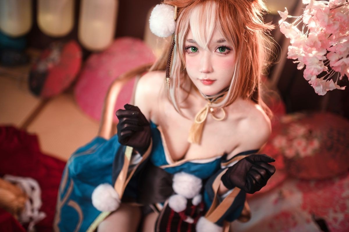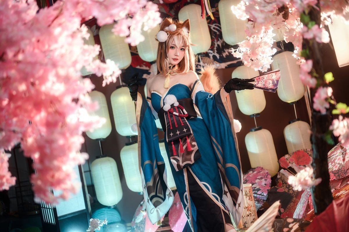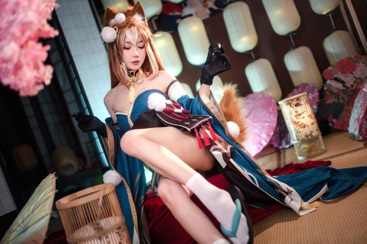 Coser Yuyuan Yuko delivers an exceptional portrayal of Hina from the enchanting world of Genshin Impact. Adorned in a magnificent teal and gold off-shoulder gown, elegantly complemented by soft fox ears, she exudes a gentle yet captivating beauty. The photograph is set against a backdrop of ancient East Asian aesthetics, with a subtle misty effect creating an ethereal and dreamy atmosphere. Every detail, from the intricate costume to her graceful expression, is meticulously crafted, drawing viewers into a fairy-tale realm. This is truly a high-caliber cosplay artwork, showcasing Yuyuan Yuko's dedication and passion, destined to mesmerize any Genshin Impact enthusiast.