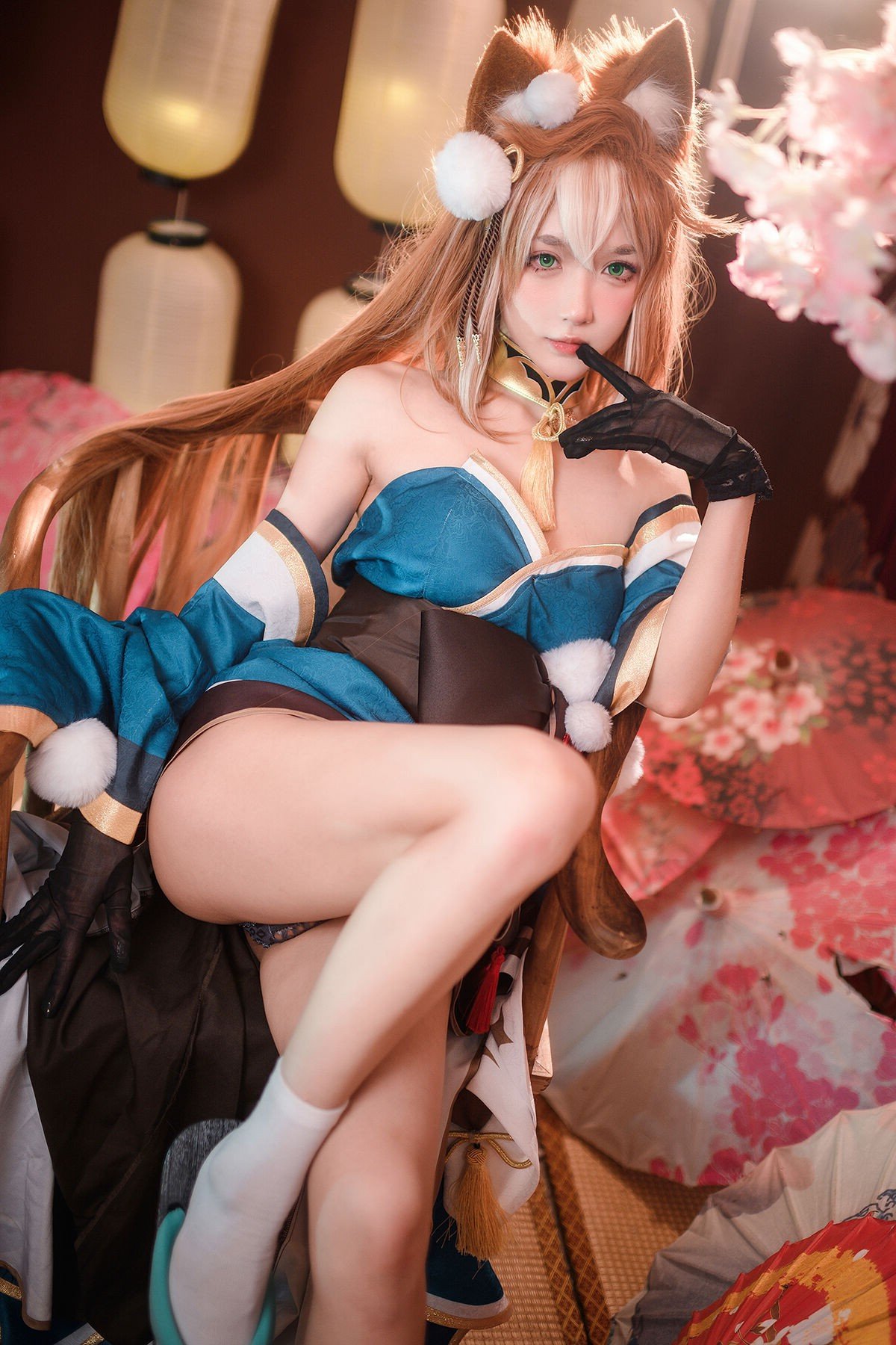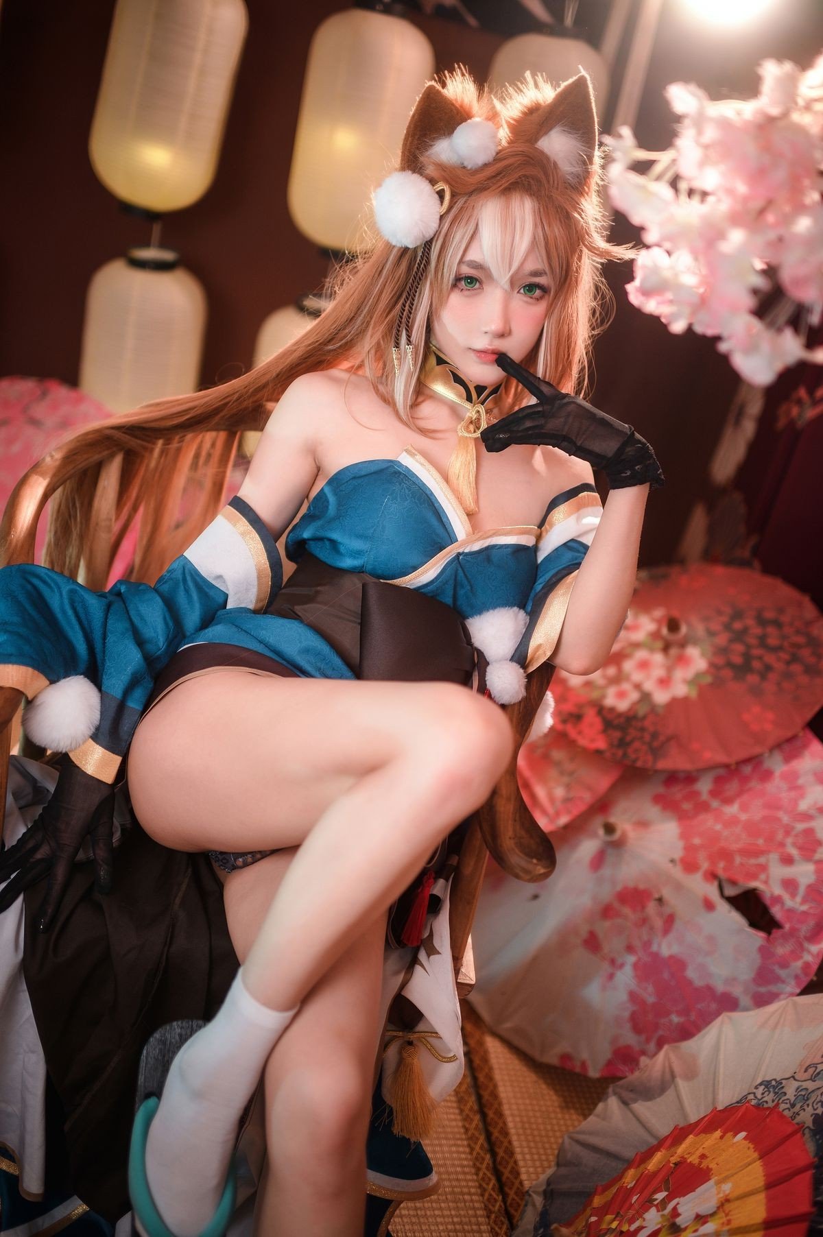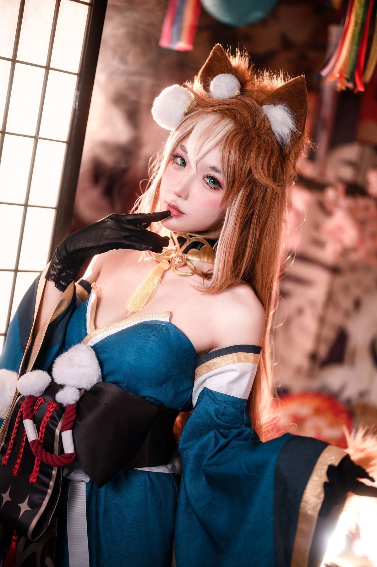 Coser Yuyuan Yuko delivers an exceptional portrayal of Hina from the enchanting world of Genshin Impact. Adorned in a magnificent teal and gold off-shoulder gown, elegantly complemented by soft fox ears, she exudes a gentle yet captivating beauty. The photograph is set against a backdrop of ancient East Asian aesthetics, with a subtle misty effect creating an ethereal and dreamy atmosphere. Every detail, from the intricate costume to her graceful expression, is meticulously crafted, drawing viewers into a fairy-tale realm. This is truly a high-caliber cosplay artwork, showcasing Yuyuan Yuko's dedication and passion, destined to mesmerize any Genshin Impact enthusiast.