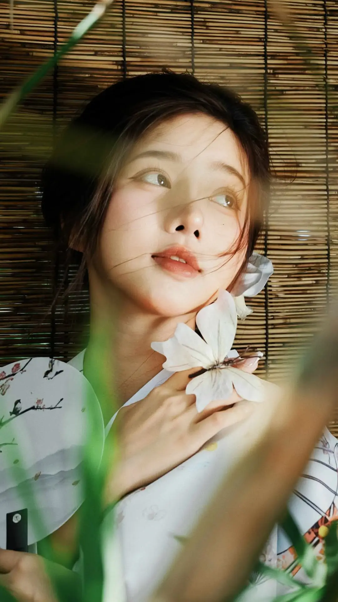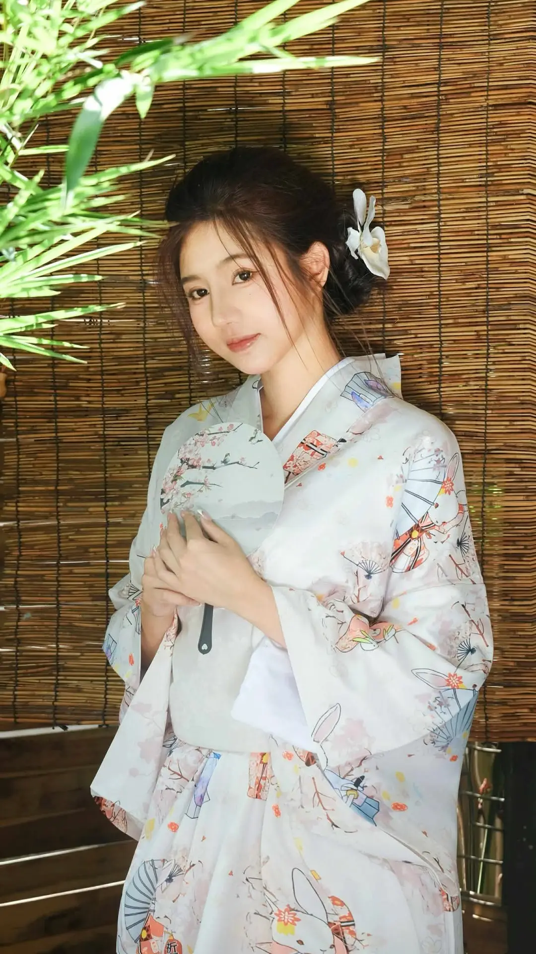 In this VGU No176 photograph we are captivated by the gentle and elegant beauty of an Asian woman She is adorned in a traditional kimono featuring exquisite patterns that deeply reflect Japanese culture Every detail on her attire from the delicate fans to the soaring cranes exudes sophistication and grace Her neatly styled hair complemented by a small white hair accessory further enhances her serene and pure charm Her face radiates a soft beauty with clear eyes that hold a sense of peaceful contemplation Against a backdrop of a bamboo screen and lush green bamboo shoots a classic and natureinspired atmosphere is created This image is not just a beautiful moment but also a harmonious blend of human elegance and the captivating essence of traditional East Asian culture#Kimono #AsianBeauty #TraditionalAttire #JapaneseCulture #ElegantStyle