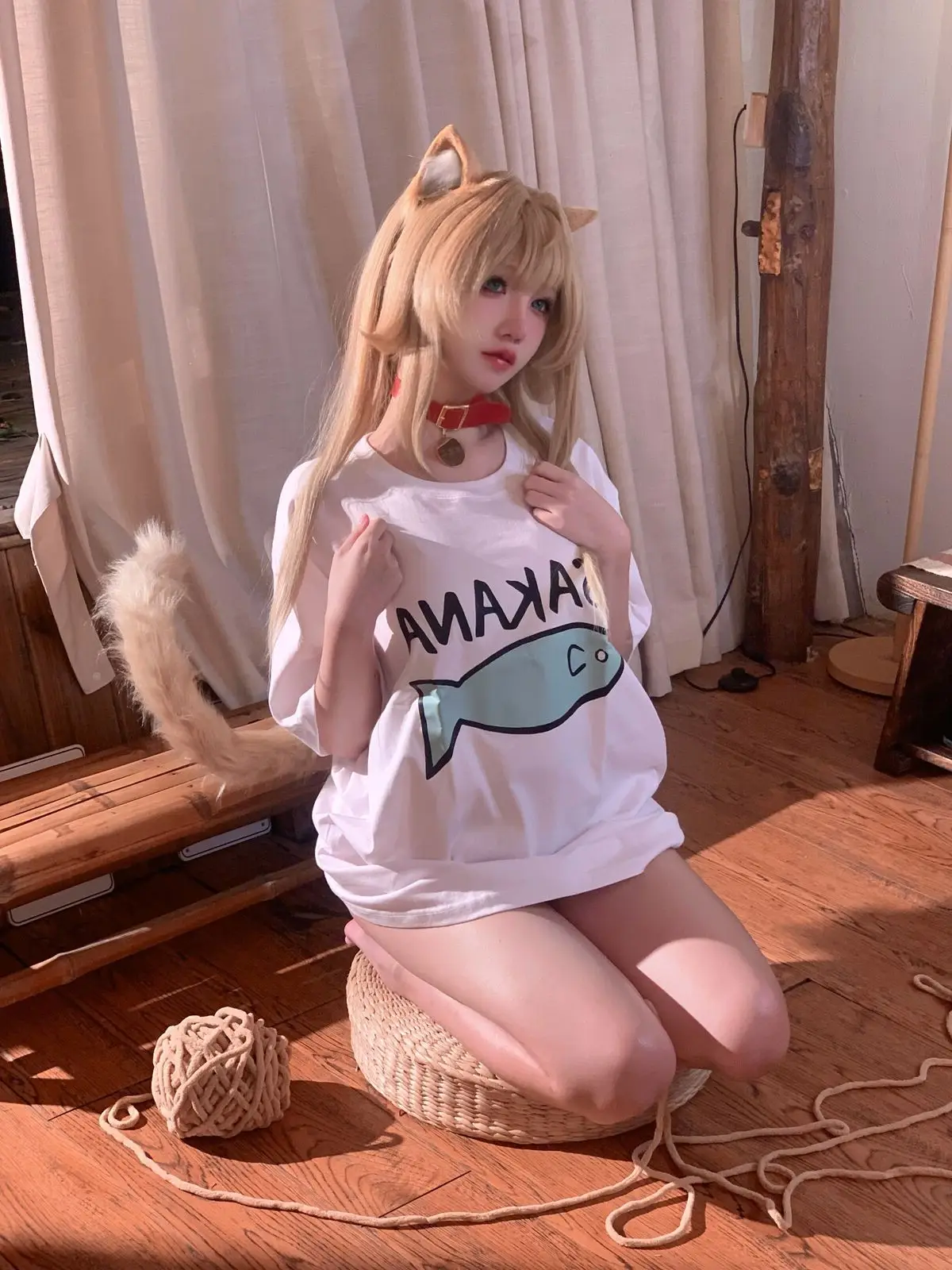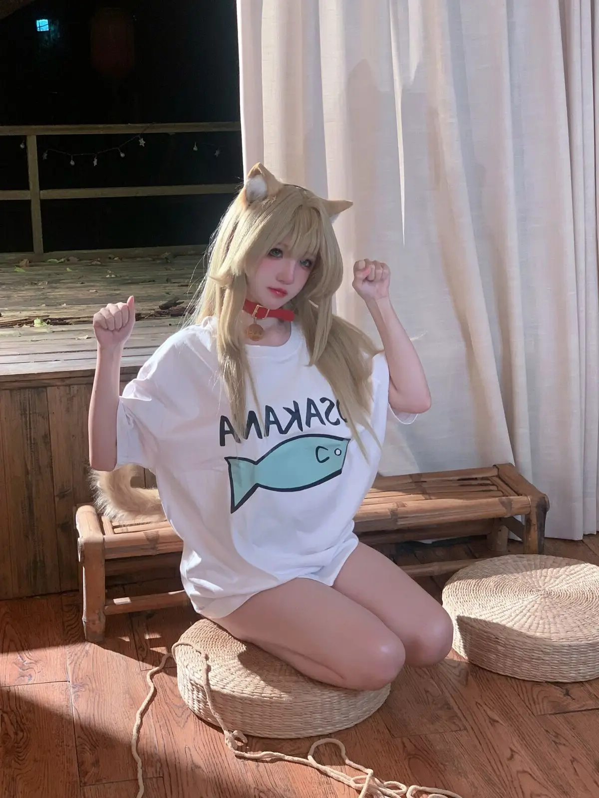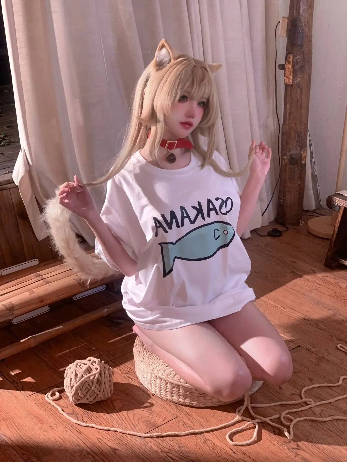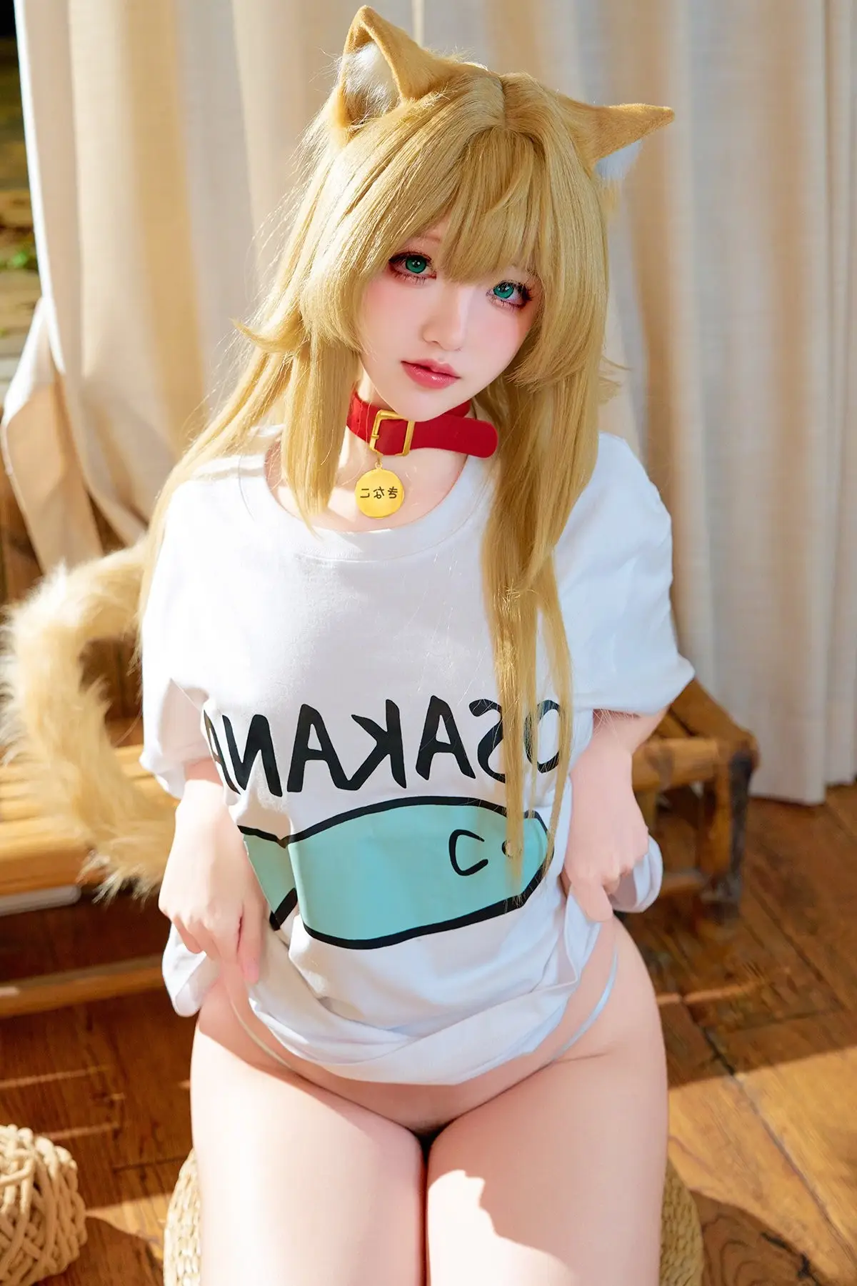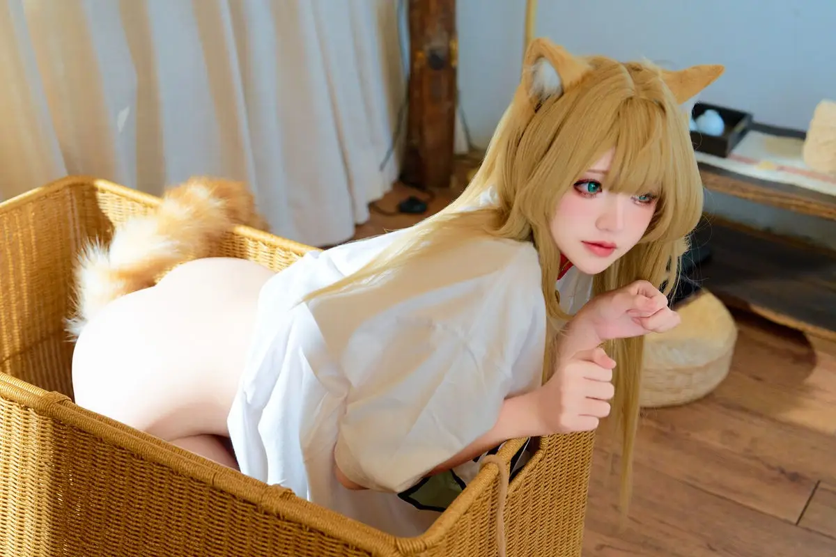 Immerse yourself in the enchanting world of cosplay with Coser 阿薰kaOri in her 'Cat Soybean Flour' Part03 photo collection. She transforms into a mischievous feline, complete with pointy ears and a soft, long tail, exuding irresistible cuteness. Seated on a warm wooden floor, 阿薰kaOri showcases her slender legs in a playful white t-shirt featuring a charming fish graphic, paired with subtly alluring attire. Each moment captures her graceful charm and natural allure, conveying a sense of intimacy and vibrant energy. This photoshoot is sure to delight cosplay enthusiasts and those who appreciate the sweet, playful spirit of cats.#Coser #kaOri #CatCosplay #CuteGirl #JapaneseFashion #Kawaii