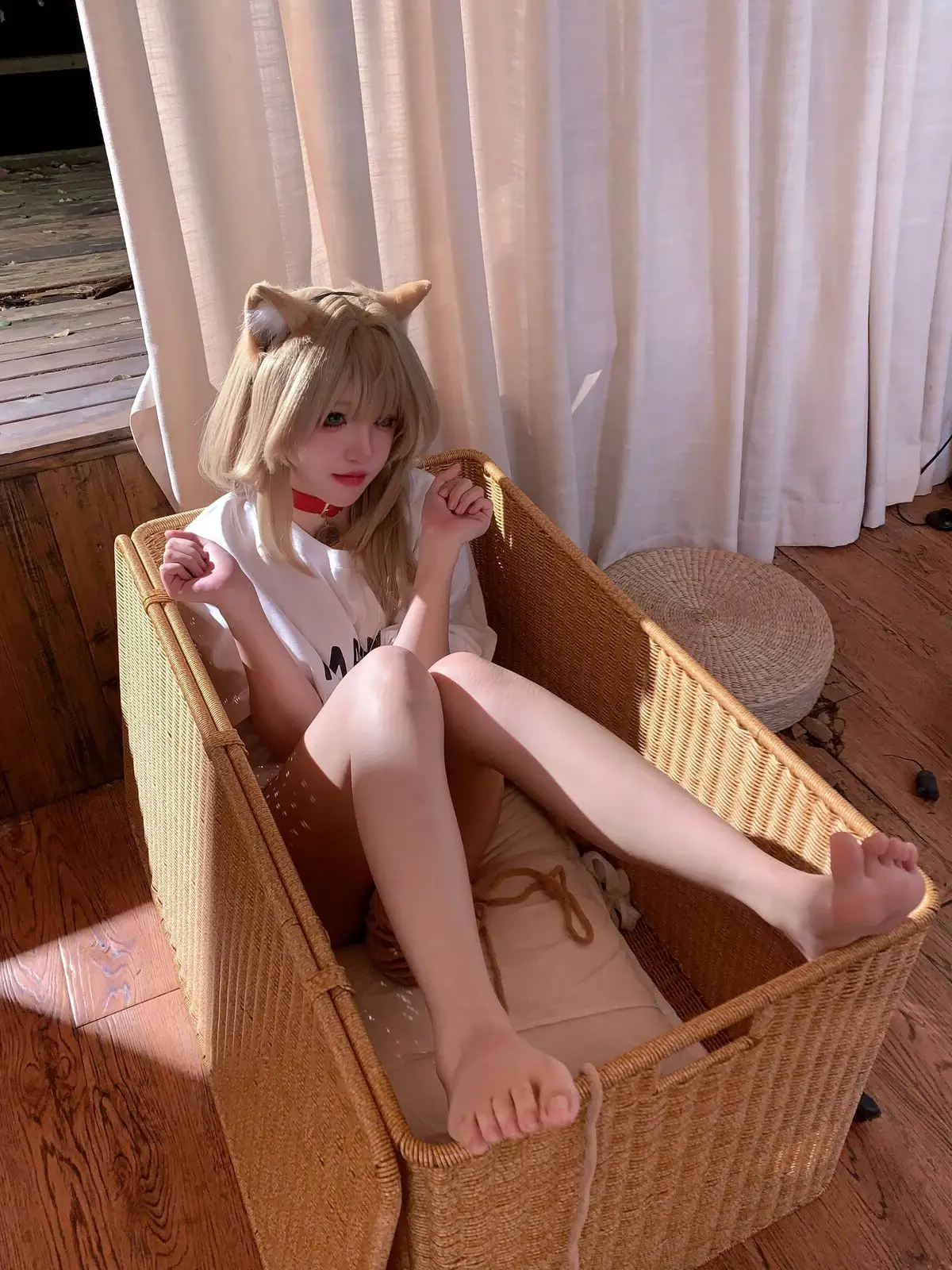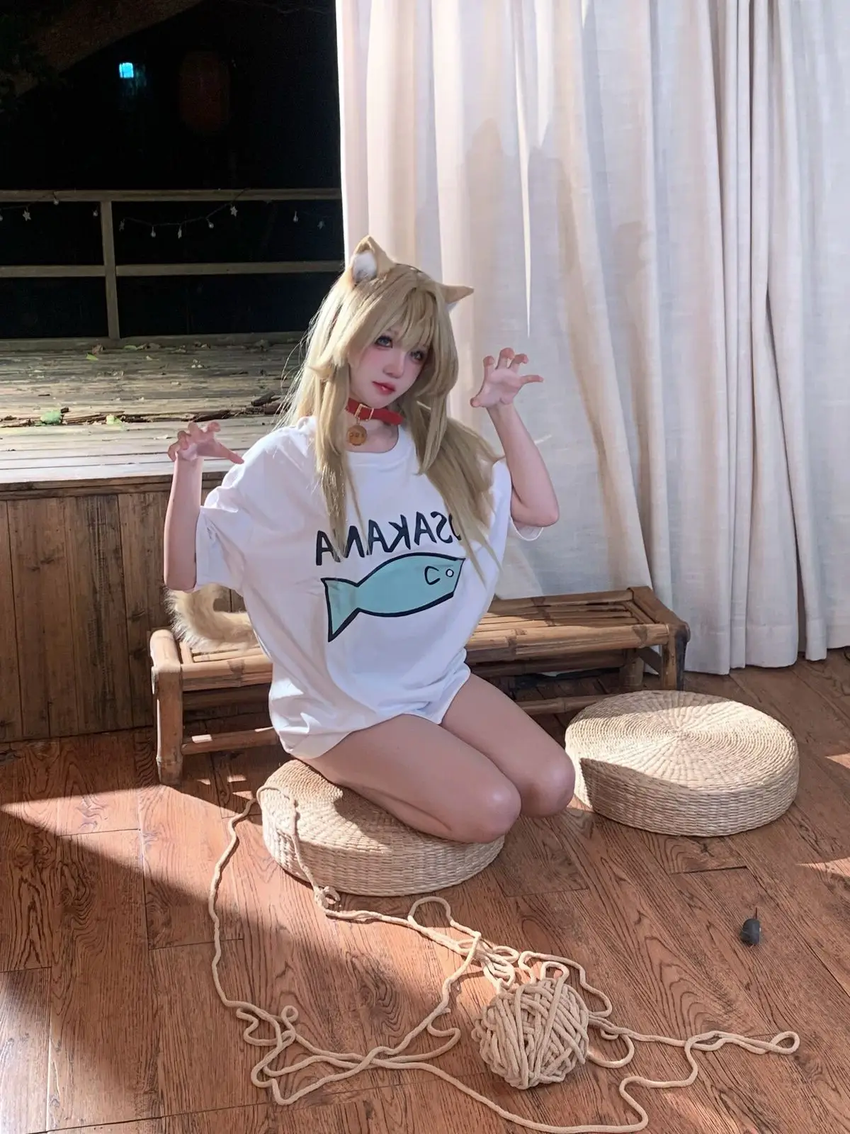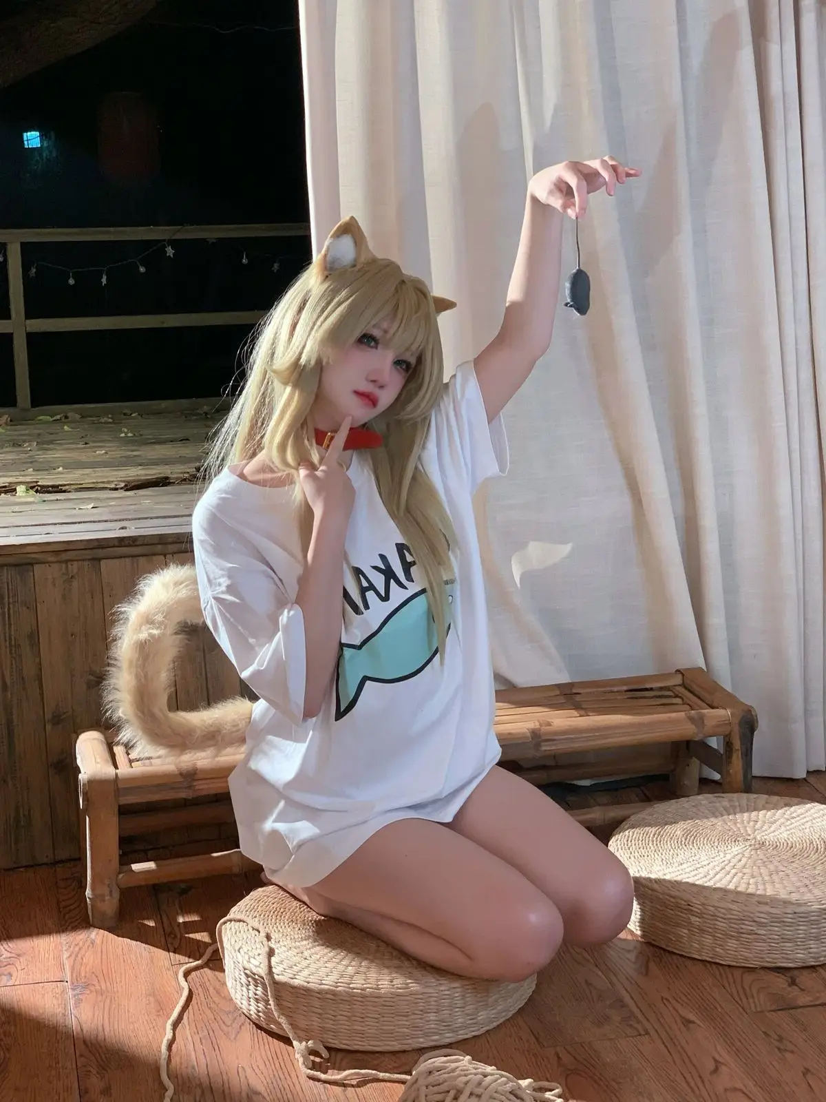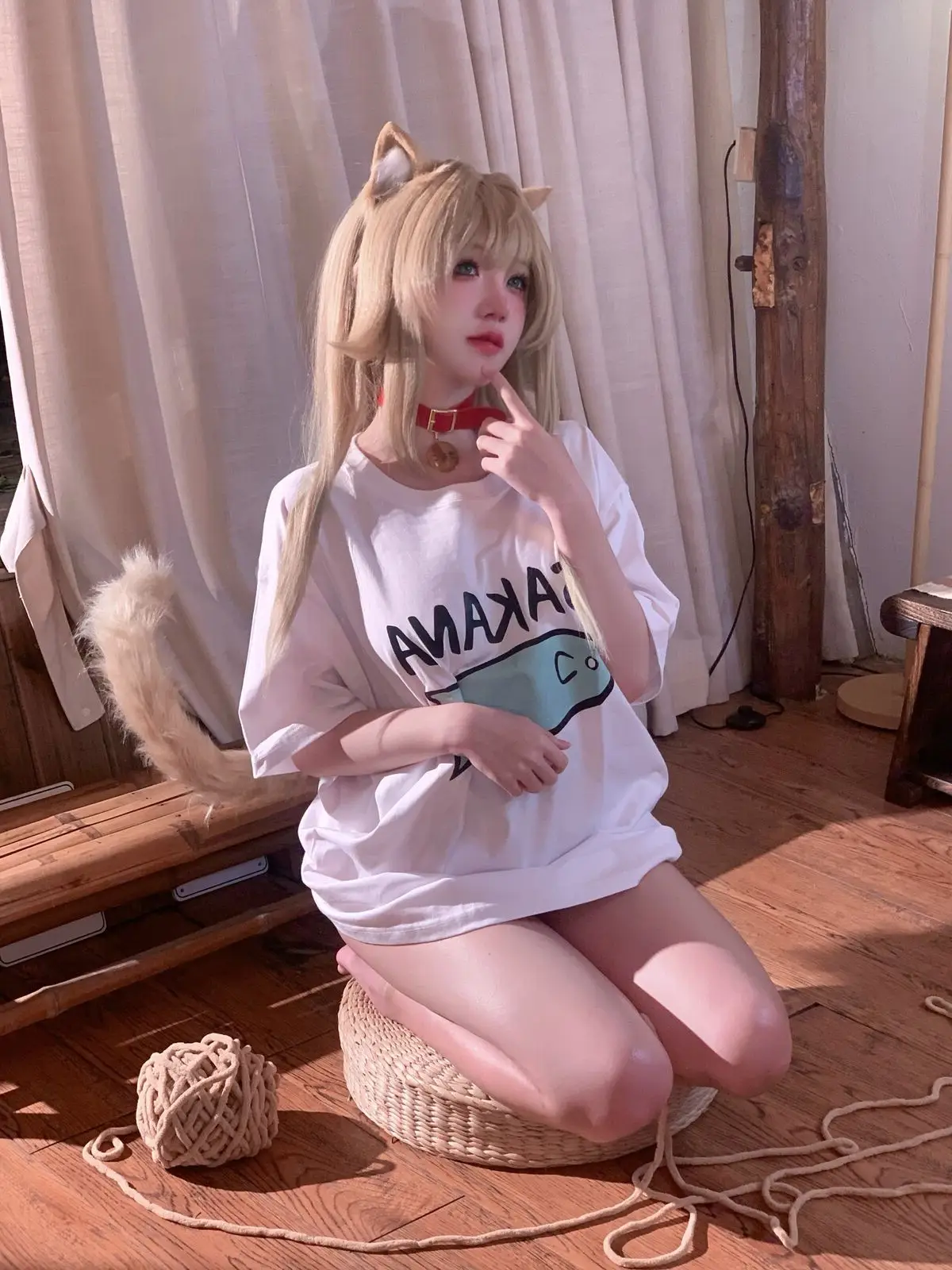 Immerse yourself in the enchanting world of cosplay with Coser 阿薰kaOri in her 'Cat Soybean Flour' Part03 photo collection. She transforms into a mischievous feline, complete with pointy ears and a soft, long tail, exuding irresistible cuteness. Seated on a warm wooden floor, 阿薰kaOri showcases her slender legs in a playful white t-shirt featuring a charming fish graphic, paired with subtly alluring attire. Each moment captures her graceful charm and natural allure, conveying a sense of intimacy and vibrant energy. This photoshoot is sure to delight cosplay enthusiasts and those who appreciate the sweet, playful spirit of cats.#Coser #kaOri #CatCosplay #CuteGirl #JapaneseFashion #Kawaii