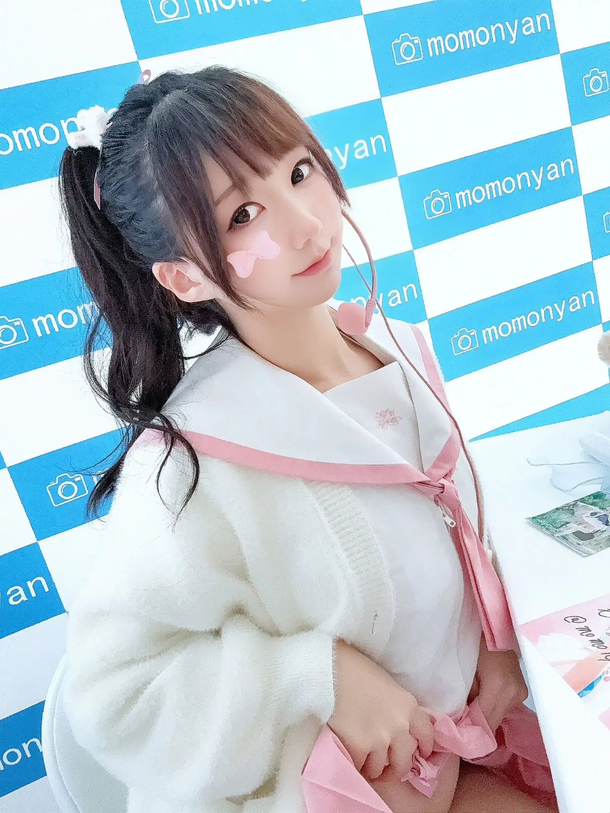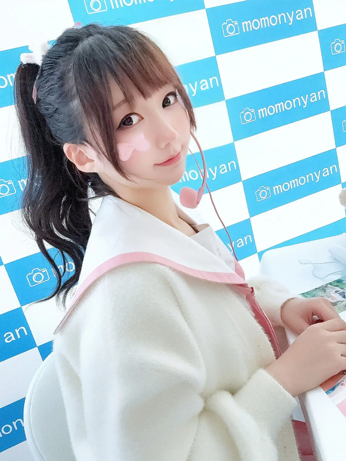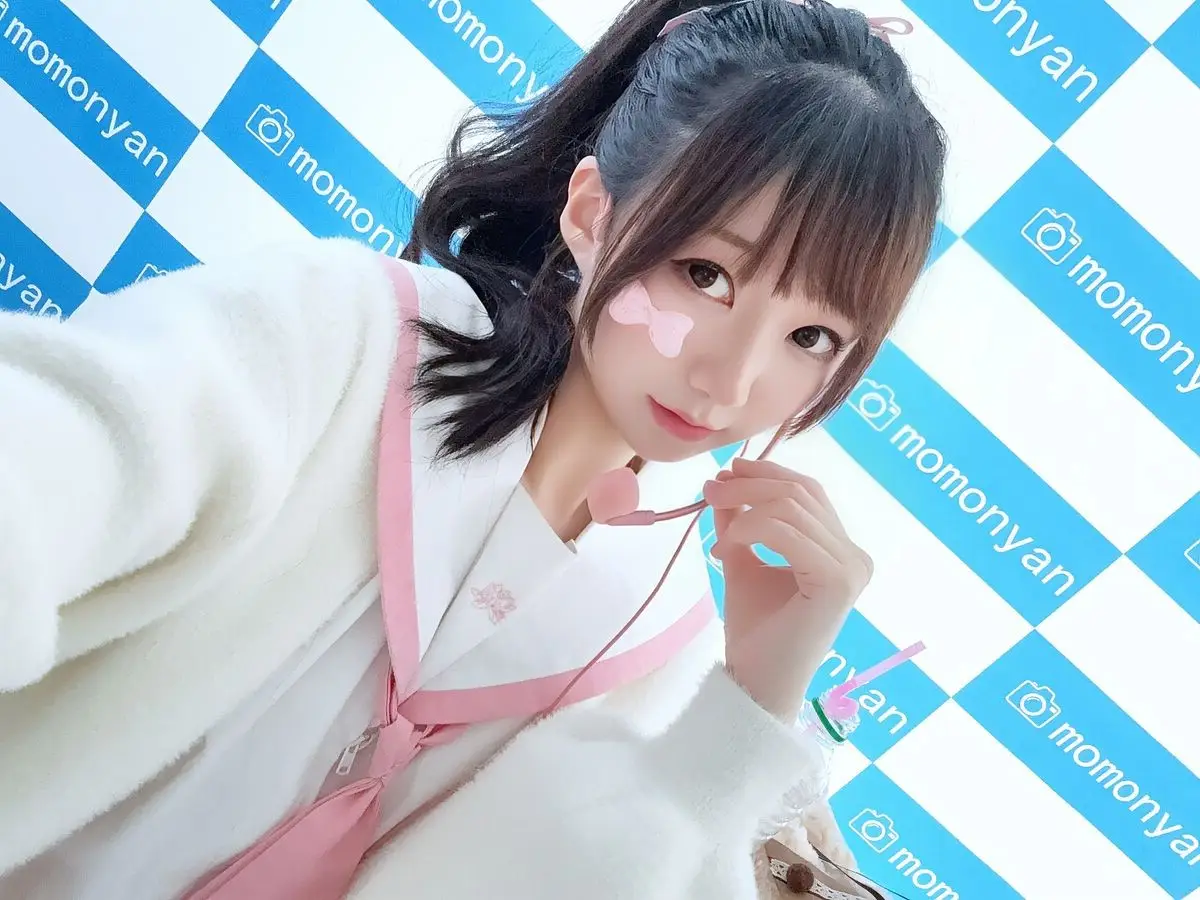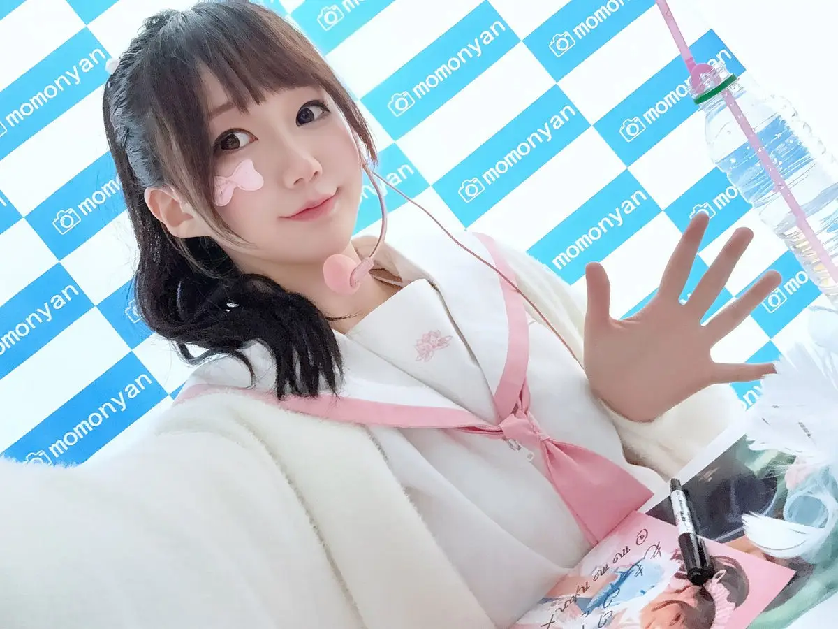 In this captivating image Coser NAGISA魔物喵 shines brightly with a radiant smile and sparkling alluring eyes. She wears a sweet Japanese-style outfit featuring pristine white tones combined with charming pink accents reminiscent of school uniforms or idol fashion. The small heart-shaped sticker on her cheek further enhances her innocent playful look. Her friendly waving pose against a blue and white checkered background creates a youthful and vibrant overall impression. NAGISA魔物喵 not only showcases her pure beauty but also conveys positive energy instantly endearing her to viewers. This is part of the special Part03 collection promising many more impressive moments to discover.#Coser #NAGISA #JapaneseFashion #CuteCosplay #KawaiiStyle #IdolLook