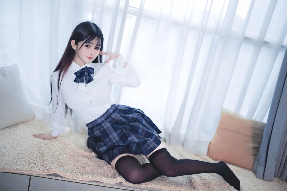 This image captures a moment of serene beauty, like a soft morning light filtering through a quiet window. The model, Coser 桜井宁宁, embodies a poetic and pure aesthetic in her classic JK Uniform Part02. The ensemble, featuring a crisp white shirt paired with a dark pleated plaid skirt, perfectly illustrates the timeless Japanese school style. The deep blue bow tie and over the knee socks add a touch of youthful elegance and feminine charm. Her gaze is gentle and contemplative, blending seamlessly with the minimalist backdrop of delicate white curtains. The natural lighting creates a soft focus effect that blurs the noise of the outside world, highlighting the fine textures and graceful silhouettes. It is more than just a cosplay shoot, it is a visual journey into a world of tranquility and nostalgic youth. For those who appreciate minimalist art and fashion, this collection offers an inspiring look at how simplicity can evoke such profound emotion and style.#JkUniform #SakuraiNening #VisualArt #JapaneseFashion #SoftAesthetic