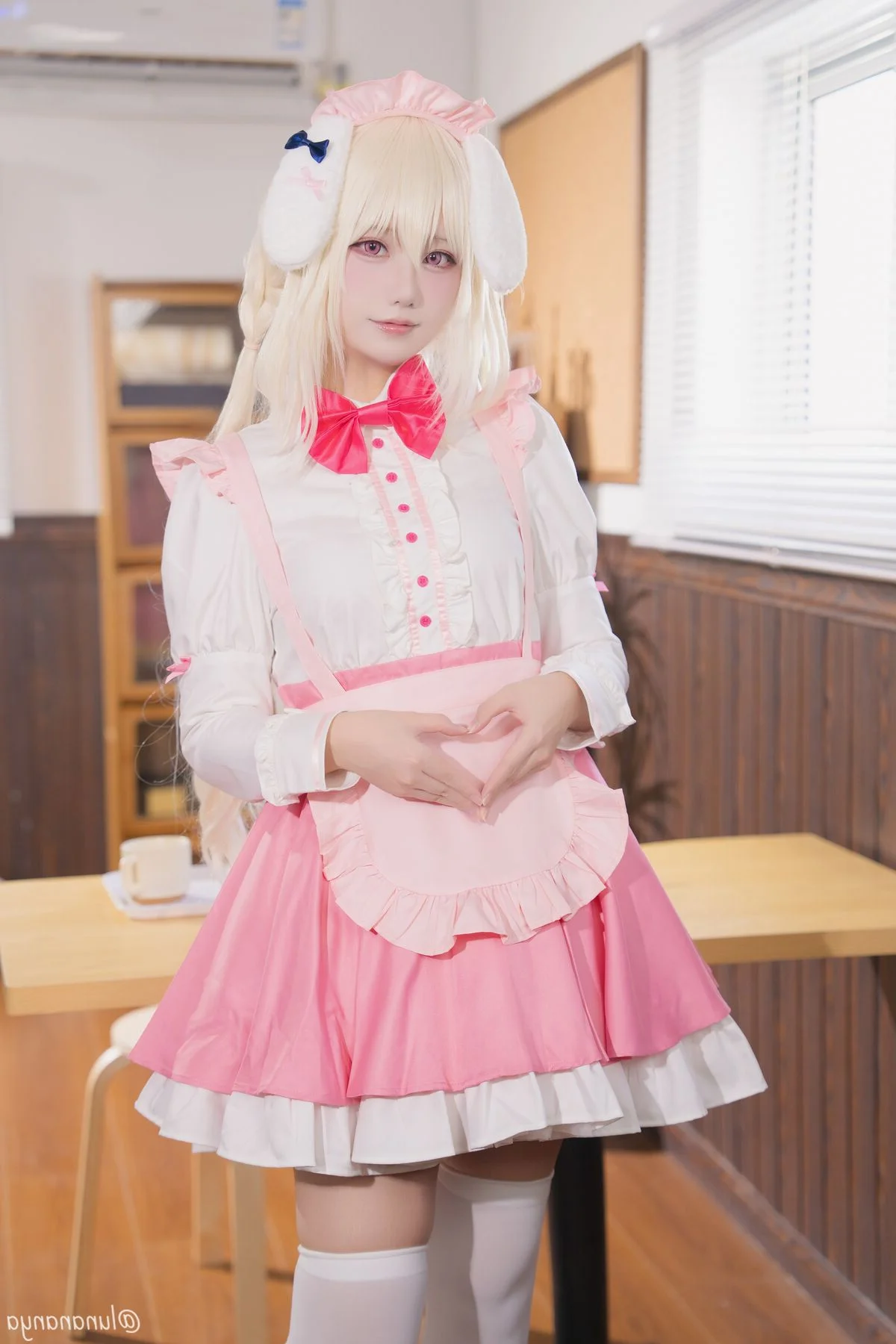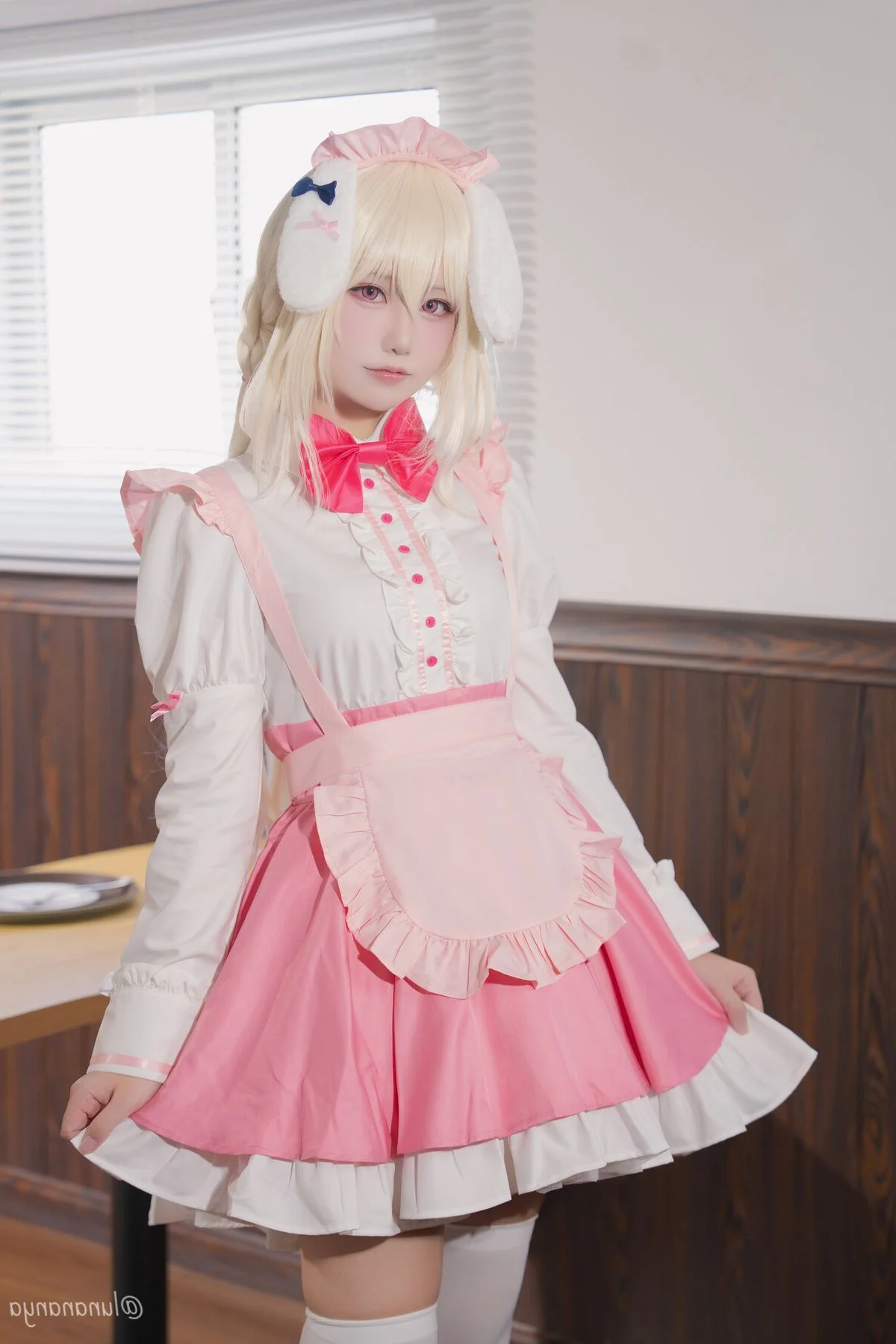 Immerse yourself in a world of pure sweetness with Coser@lunananya as she perfectly embodies the charm of 御园莓华. This visual journey captures the essence of a whimsical atmosphere where every frame feels like a soft whisper of nostalgia. The outfit, a delightful blend of pastel pink and crisp white ruffles, showcases a meticulous eye for fashion and texture. From the vibrant red bow to the adorable bunny ear accessories, the styling highlights a playful yet elegant aesthetic that is characteristic of the 巧克甜恋 universe. The warm indoor lighting casts a gentle glow on the wooden surroundings, enhancing the natural expressions and graceful body language of the model. It is a beautiful celebration of visual storytelling and character art, inviting viewers to appreciate the delicate balance between costume design and emotional depth in this enchanting collection.#CosplayPhotography #Lunananya #MisonoIchika #MaidOutfit #AestheticVisuals #ChocoSweetLove #KawaiiCulture