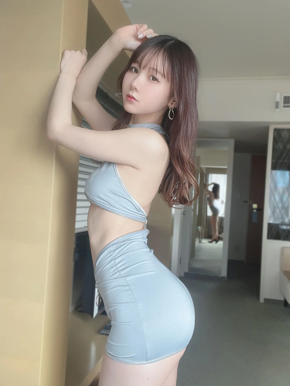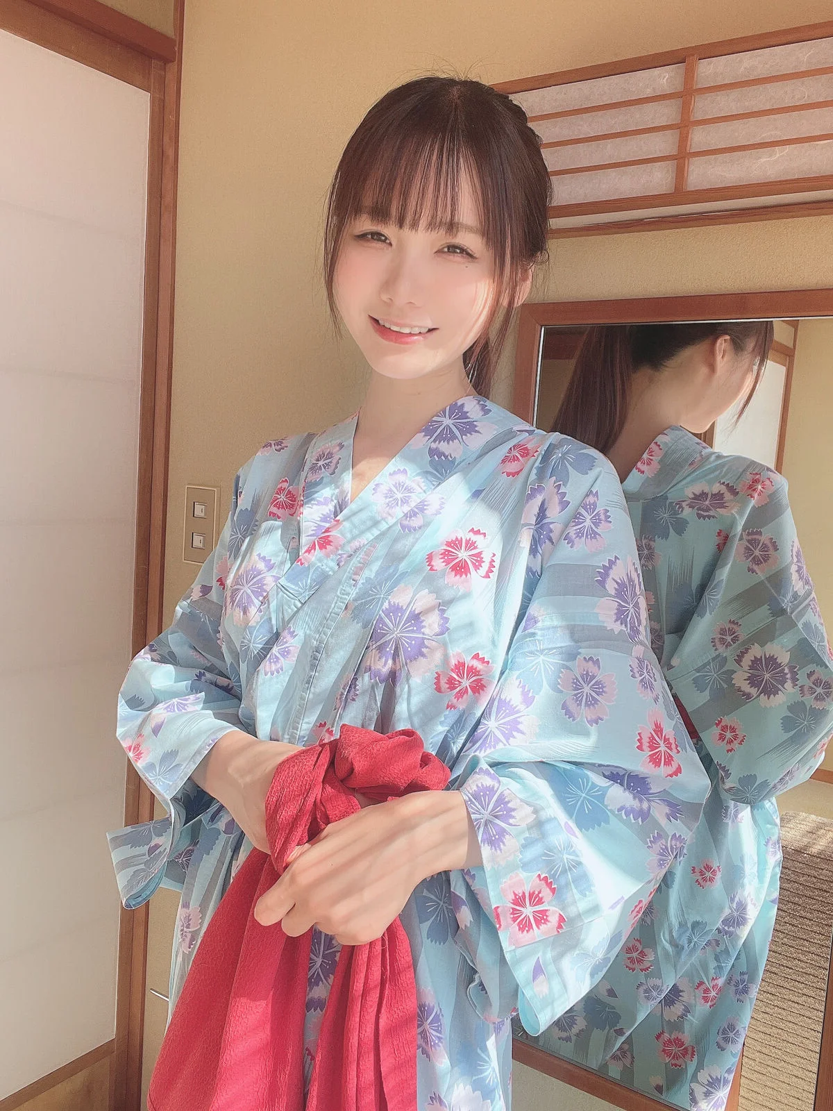 Stepping into a serene afternoon atmosphere, Coser captures the essence of Japanese elegance in a stunning floral Yukata. The soft blue fabric, adorned with delicate purple and pink blossoms, creates a refreshing visual that feels like a gentle summer breeze. Filtered light through the bamboo blinds casts a soft glow on her features, highlighting a gaze that is both innocent and deeply expressive. The styling is impeccable, with a bold red Obi belt providing a sophisticated contrast to the pastel tones of the outfit. This visual narrative evokes a sense of nostalgia and tranquility, reminiscent of a quiet stay in a traditional Ryokan. Every detail, from the texture of the fabric to the subtle body language, reflects a high level of aesthetic sensibility and artistic grace, making it a perfect inspiration for those who love the blend of culture and fashion.