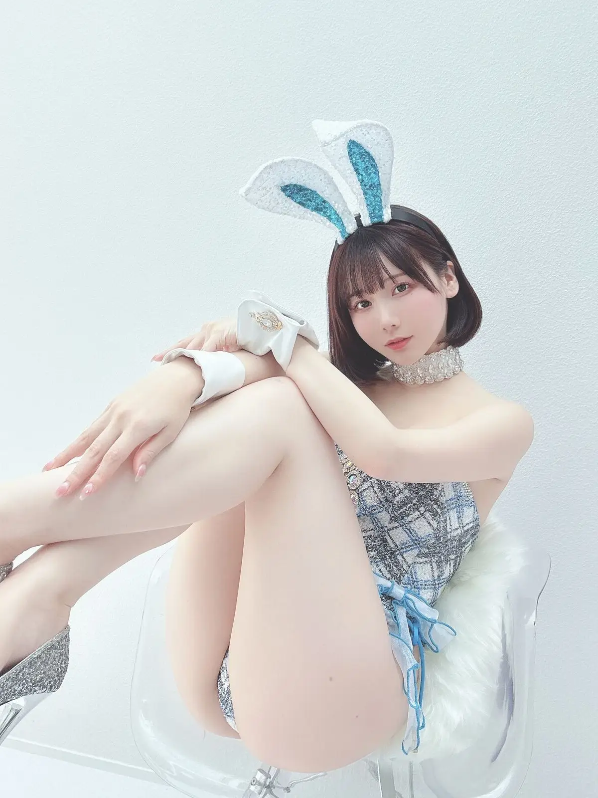 Coser けん研 けんけん makes a captivating appearance in a pristine white outfit, a unique design hinting at futuristic or race-inspired aesthetics. Featuring a high collar, a prominent front zipper, and subtle cut-outs, the ensemble elegantly accentuates her figure. Her short dark hair frames a delicate face, with an alluring gaze directed straight at the viewer, creating a strong connection. She poses gracefully on a classic chair, showcasing sleek long white gloves and matching thigh-high stockings, exuding sophistication. The minimalist studio backdrop, with a touch of greenery, ensures full focus on her presence. This Fantia 2023.10 Part03 collection masterfully blends contemporary style with timeless grace, offering an unforgettable visual experience.#Coser #Kenken #WhiteOutfit #Fantia2023 #CosplayBeauty #FuturisticCosplay