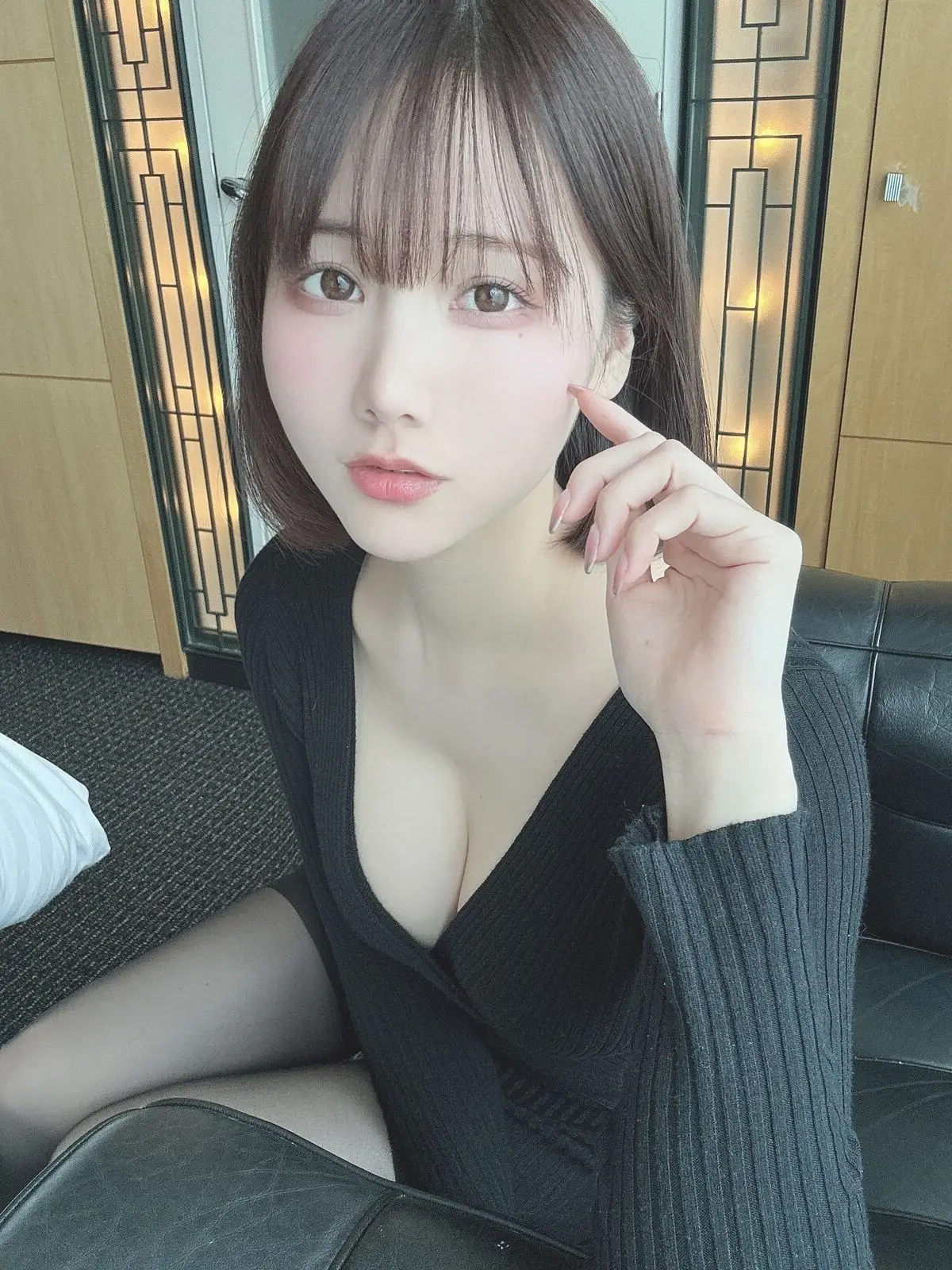 This stunning photograph captures Coser Ken Ken with an enchanting beauty and refined style She radiates charm in an elegant low-cut black dress subtly showcasing her alluring silhouette Her gentle gaze combined with the delicate gesture of touching her cheek creates a moment that is both tender and sensual Her neat short hair and natural makeup further enhance the graceful features of her face Seated on a luxurious black leather couch she exudes confidence and captivating charisma This Fantia 2023.05 Part02 collection is sure to mesmerize viewers with its perfect blend of East Asian aesthetics and modern allure#Coser #KenKen #FantiaModel #AsianBeauty #AlluringFashion #CosplayGirl