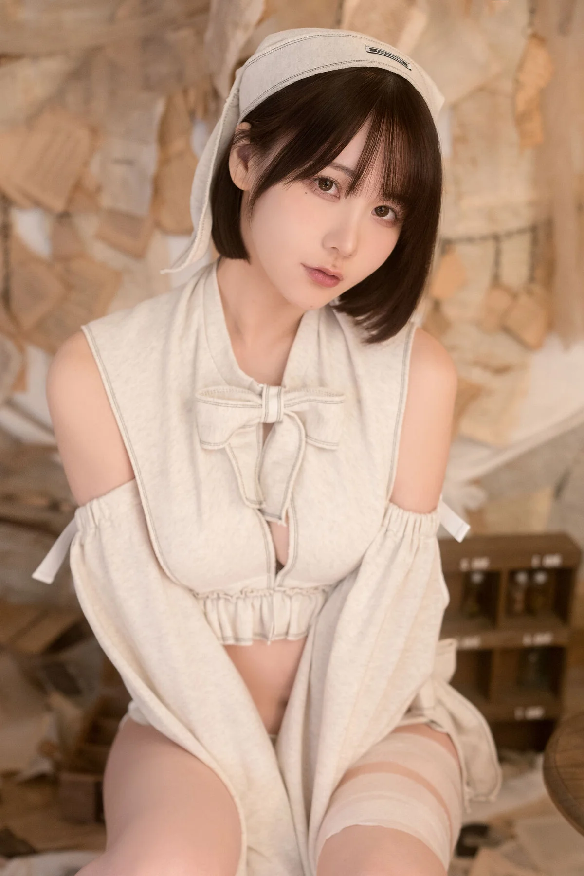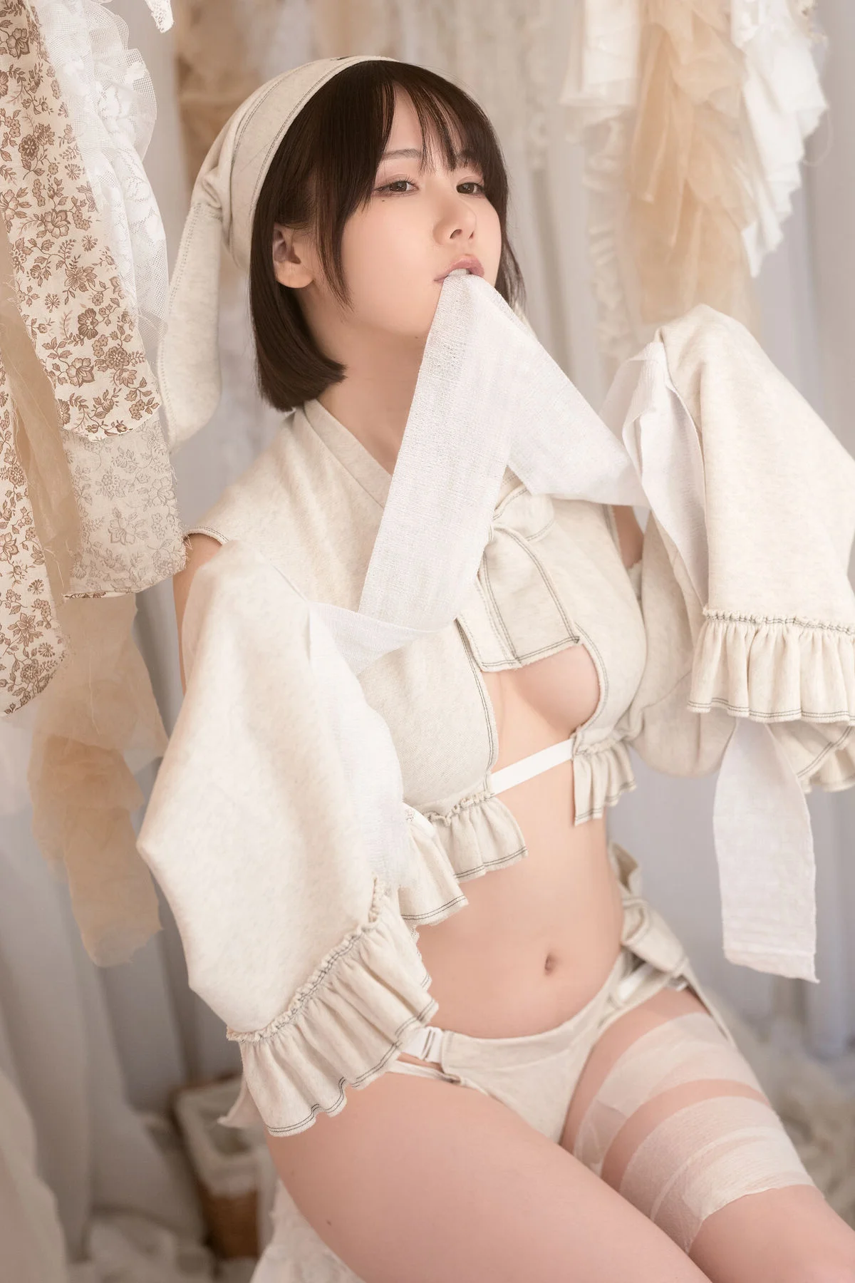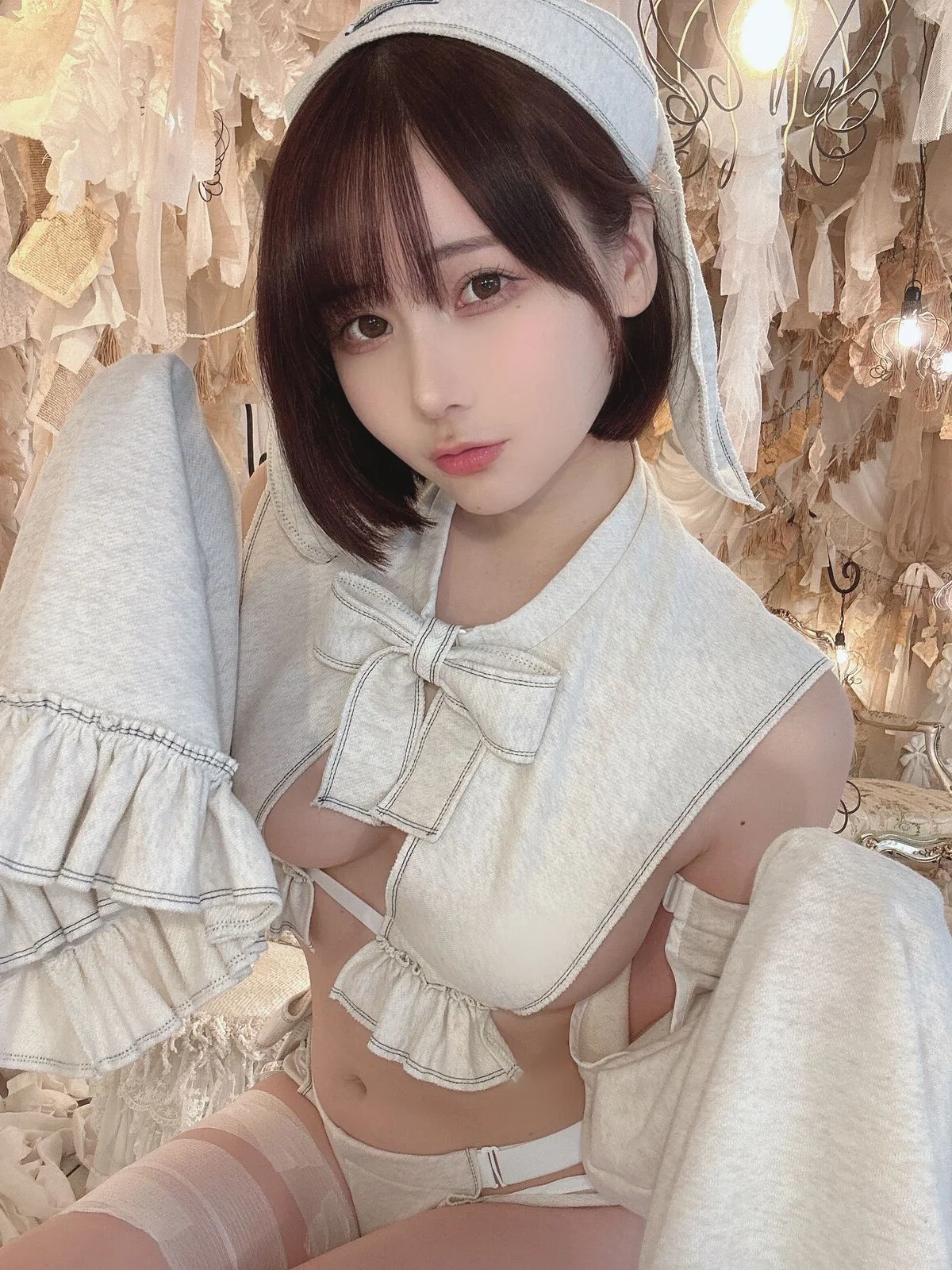 This captivating image is part of Coser@けん研 けんけん's Fantia 2023.10 Part03 collection showcasing a sweet and enchanting beauty. The character is portrayed with an elegant demeanor wearing a soft cream-colored outfit adorned with delicate ruffles and bows evoking the image of a classic doll or a charming maid. Gentle diffused lighting bathes the scene creating a dreamy and ethereal atmosphere that highlights けんけん's porcelain skin and clear eyes. Every detail from her sleek bob haircut to her stylish high heels contributes to a harmonious overall look exuding grace and allure. This is more than just a photograph it is an artistic piece where けんけん fully expresses her unique charisma and distinctive style leaving viewers captivated and eager to explore more from this remarkable collection.#Coser #Kenken #Fantia2023 #CosplayGirl #SweetCharm #JapaneseCosplay