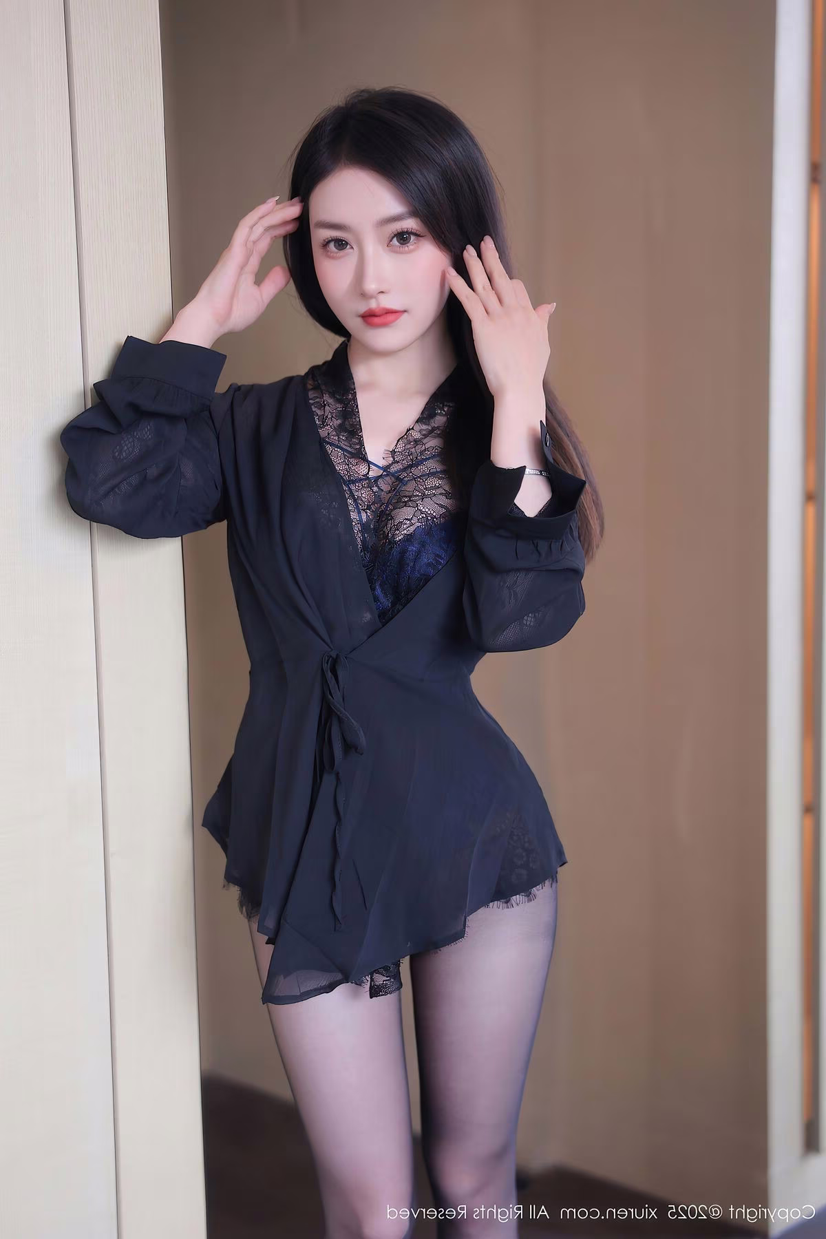 The XiuRen No.10382 collection proudly presents Annie_baby a captivating newcomer with immense potential. In this stunning photoshoot Annie_baby exudes an irresistible blend of allure and elegance. She is beautifully adorned in a sophisticated black outfit featuring delicate lace details that perfectly accentuate her slender figure and remarkably long legs. Her confident pose on the vibrant blue cabinet creates a striking visual contrast highlighting her poised demeanor. Annie_baby's deep gaze and subtle smile are sure to leave a lasting impression on viewers. This exquisite series of photos showcases her sensual beauty while maintaining an air of refined sophistication establishing her as a rising star within the XiuRen community.