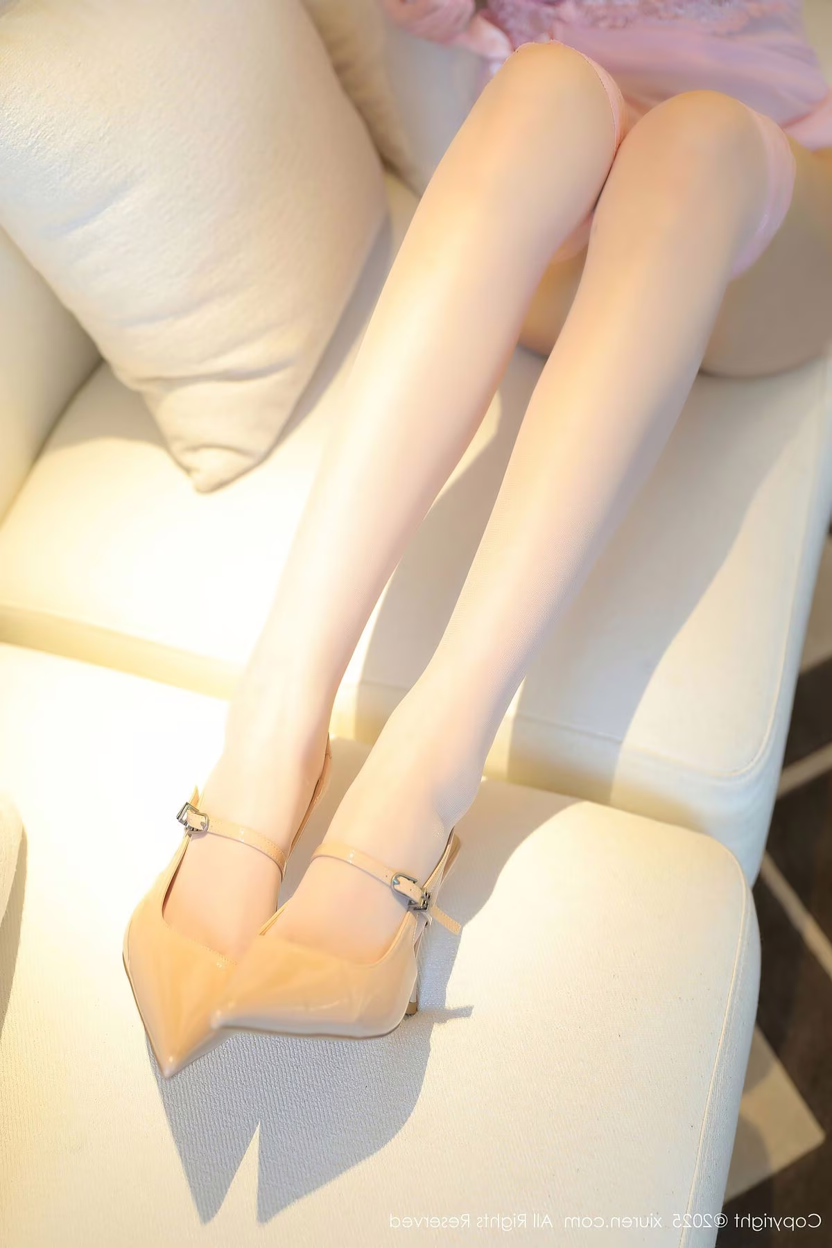 In this captivating image Nai Fu Jiang EVA No.10310 radiates alluring beauty with her remarkably long legs. Posing gracefully on a plush sofa within a luxurious hotel room she creates an enchanting scene. The soft lighting and natural posture accentuate every curve of her body especially her slender and captivating legs. This photograph not only conveys confidence but also evokes an irresistible sense of relaxation and charm. It is a true photographic masterpiece where physical beauty is celebrated with subtlety and sensuality.