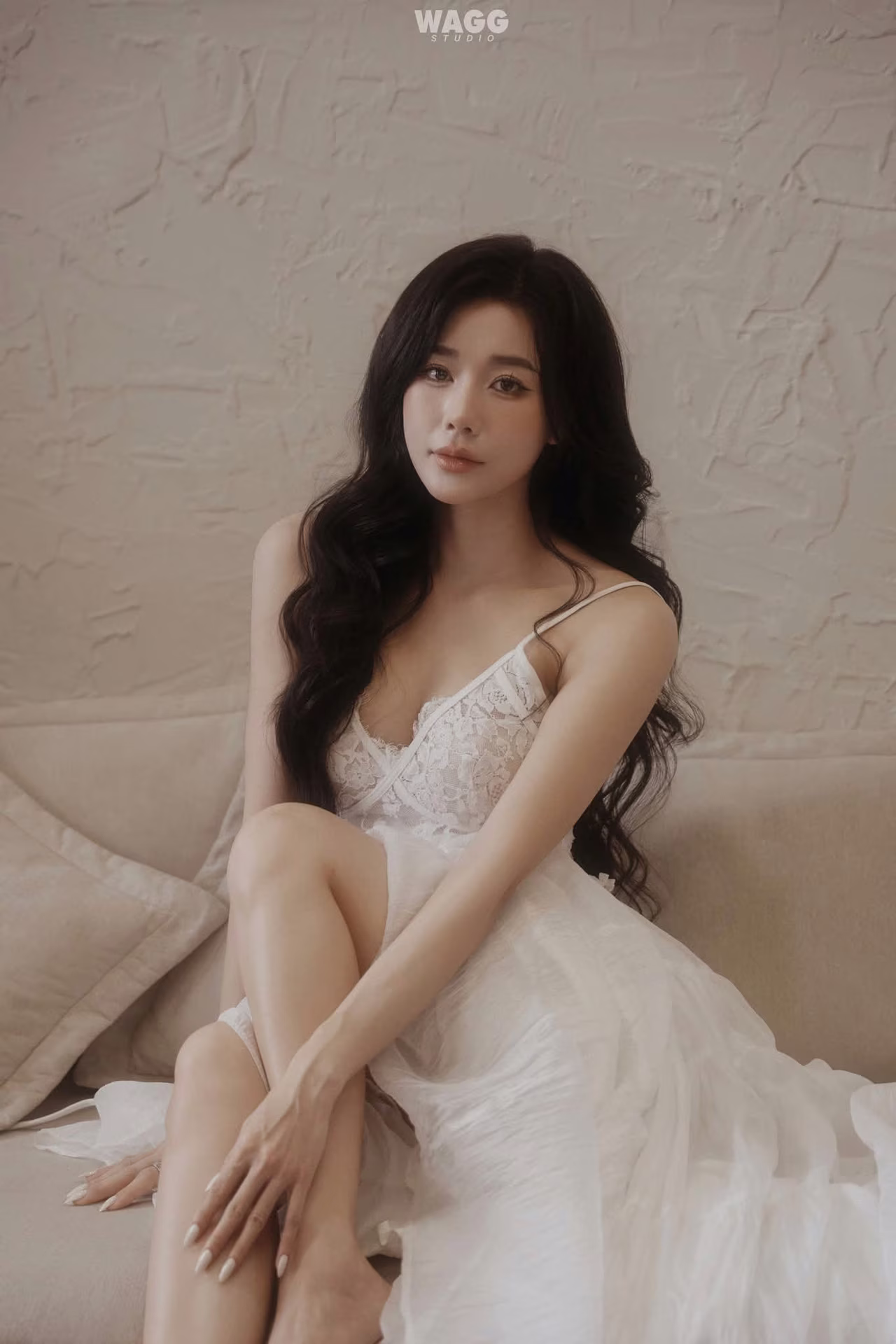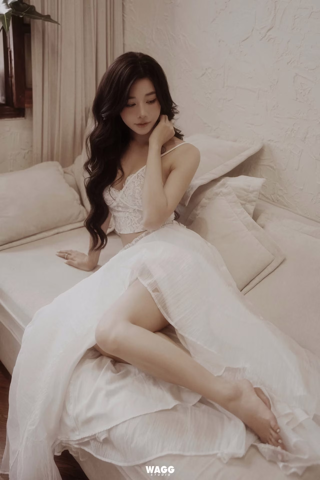This photograph captures an enchanting moment of a young woman exuding an ethereal and graceful beauty. Dressed in a pristine white gown she poses elegantly on a soft sofa her long flowing hair accentuating her gentle and delicate features. Soft natural light bathes the scene highlighting her fair skin and the dreamy profound expression on her face. The dress with its subtle slit delicately reveals her slender legs creating an alluring yet sophisticated and romantic charm. The entire setting radiates a sense of peace luxury and poetic quality leaving viewers captivated by this pure and enchanting beauty.