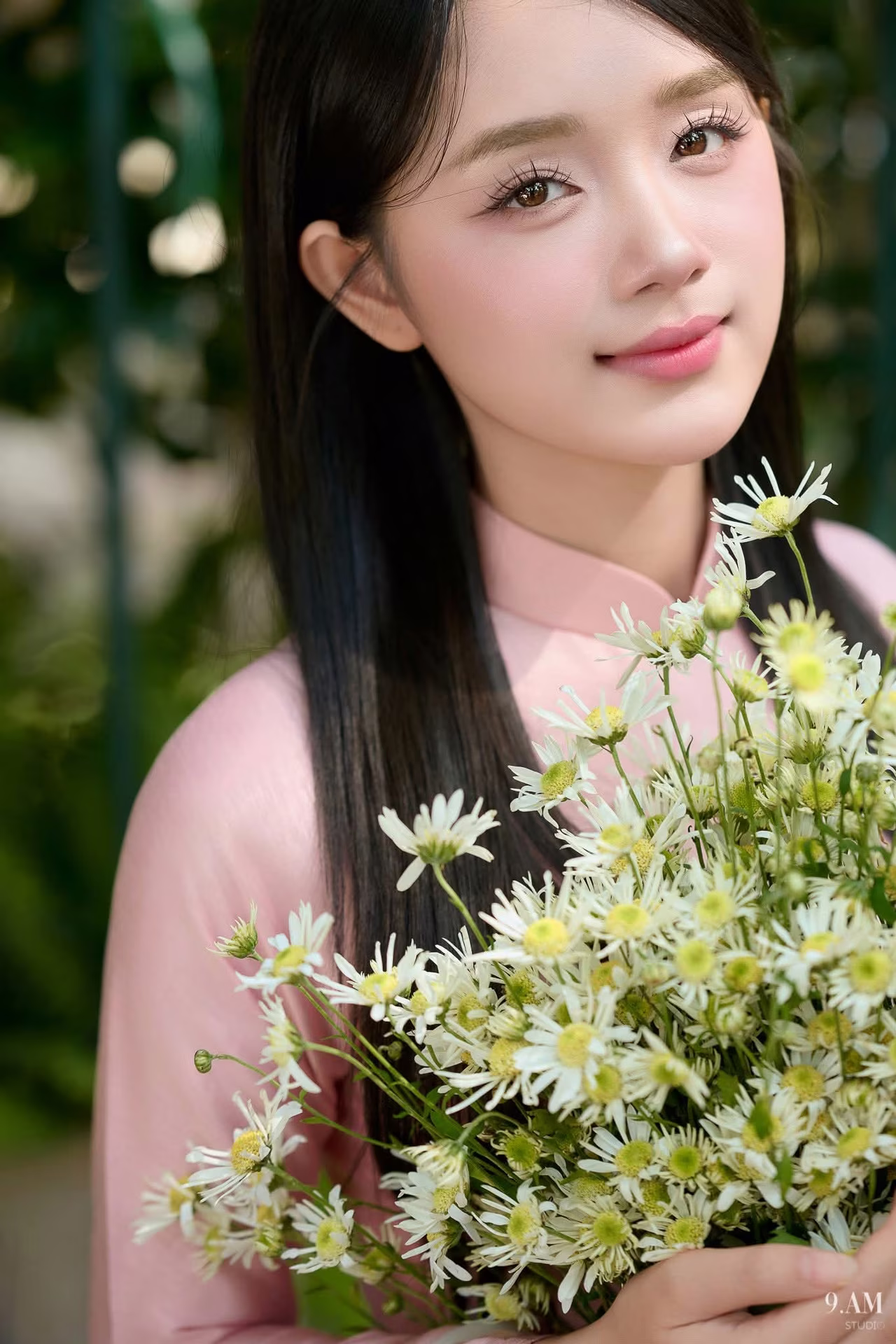 This beautiful photograph captures a Vietnamese lady with a serene and graceful beauty. Dressed in a traditional light pink Ao Dai her elegant figure is highlighted. Her gentle smile and clear eyes convey a demure charm characteristic of Vietnamese women. She holds a delicate bouquet of pure white flowers symbolizing purity and natural beauty. This image not only records a peaceful moment but also celebrates the rich cultural identity of Vietnam through its iconic Ao Dai. It is a harmonious blend of human beauty and traditional attire creating a captivating and emotional portrait. The lush green background further enhances her elegant presence. #Vietnamese #pretty #charm