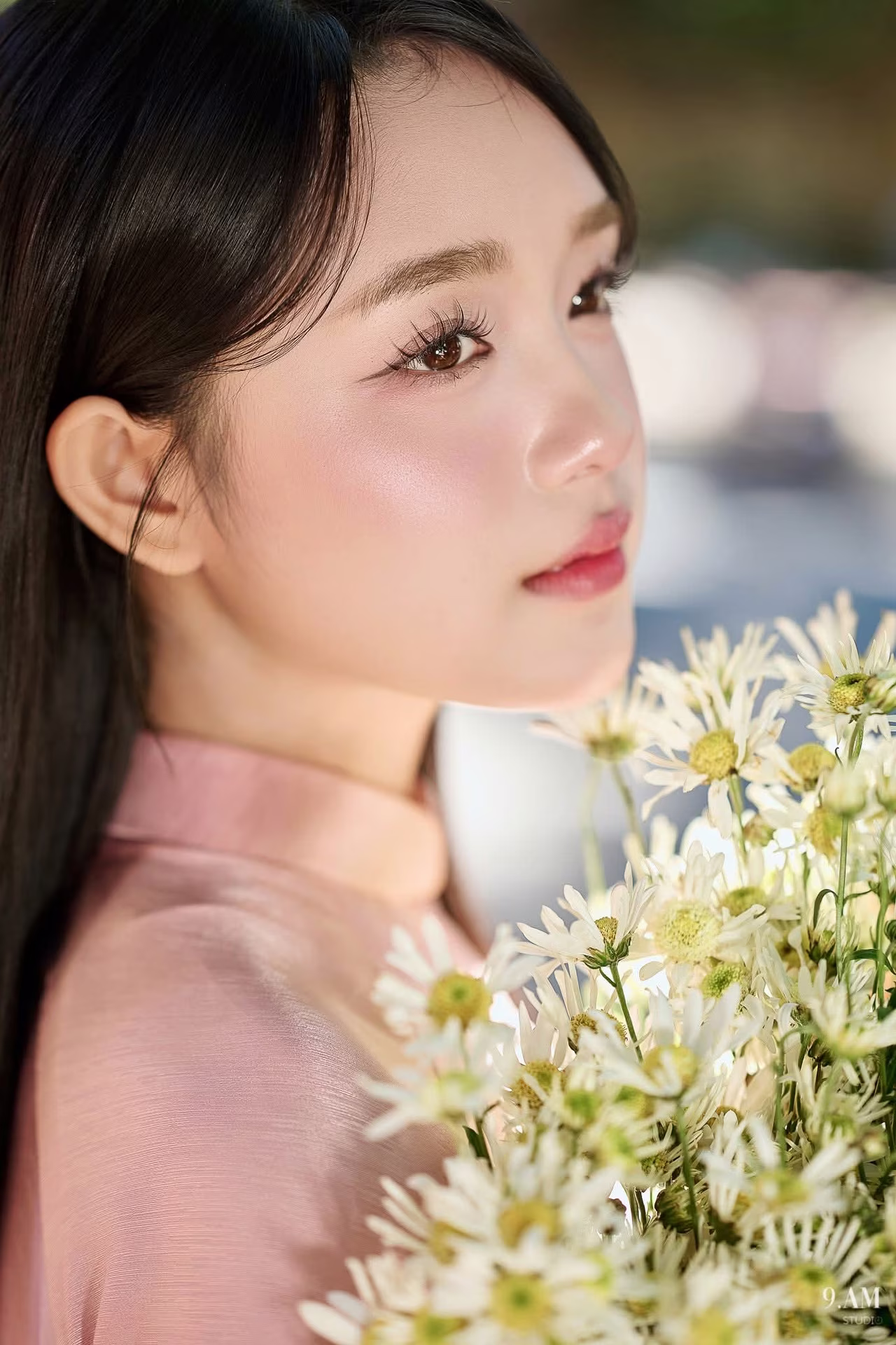 VGU No.18 captures a stunning Vietnamese young woman adorned in a flowing pink Ao Dai exuding elegance and grace. Her long raven hair frames a delicate face, and her dreamy gaze directed upwards adds a layer of emotion and depth to the moment. In her hands she holds a pristine bouquet of white daisies symbolizing purity and simple beauty further enhancing her charming Asian allure. The lush green natural backdrop provides a serene setting beautifully complementing the vibrant pink of her traditional attire. This image perfectly blends traditional aesthetics with the fresh vitality of youth creating a captivating and soulful portrait. #Vietnamese #pretty #charm