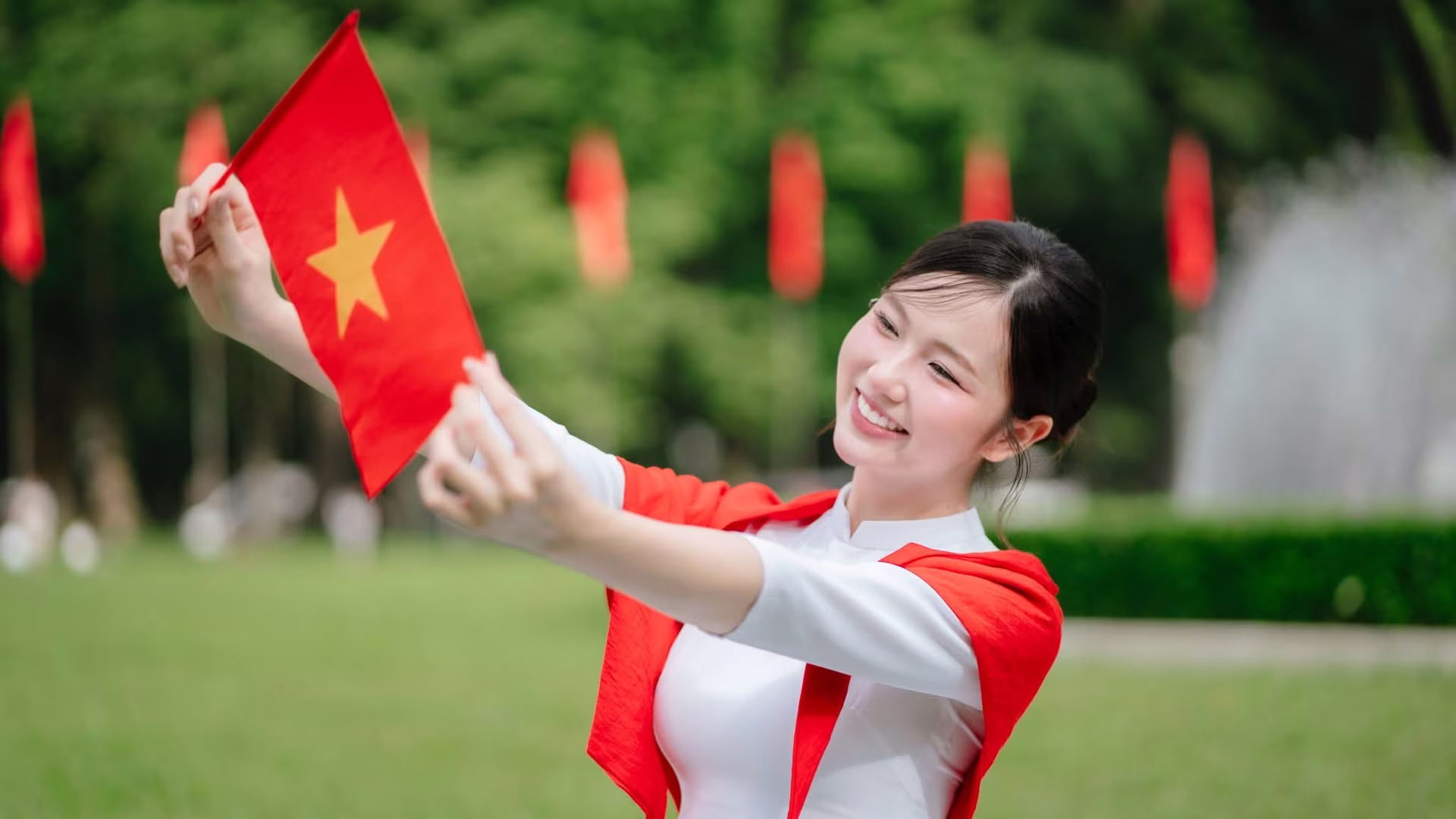 This stunning VGU No102 image captures a graceful Vietnamese girl in a pristine white Ao Dai exuding elegance and serenity She wears a vibrant red cape adorned with a yellow star symbolizing Vietnam's national flag and holds a small flag in her hand showcasing intense national pride Her radiant smile and forward gaze against the lush green lawn and ancient architecture evoke the spirit of a passionate and patriotic young generation This scene beautifully blends tradition with modernity inner beauty with love for the homeland a memorable moment honoring Vietnamese culture and its people #Vietnamese #pretty #charm