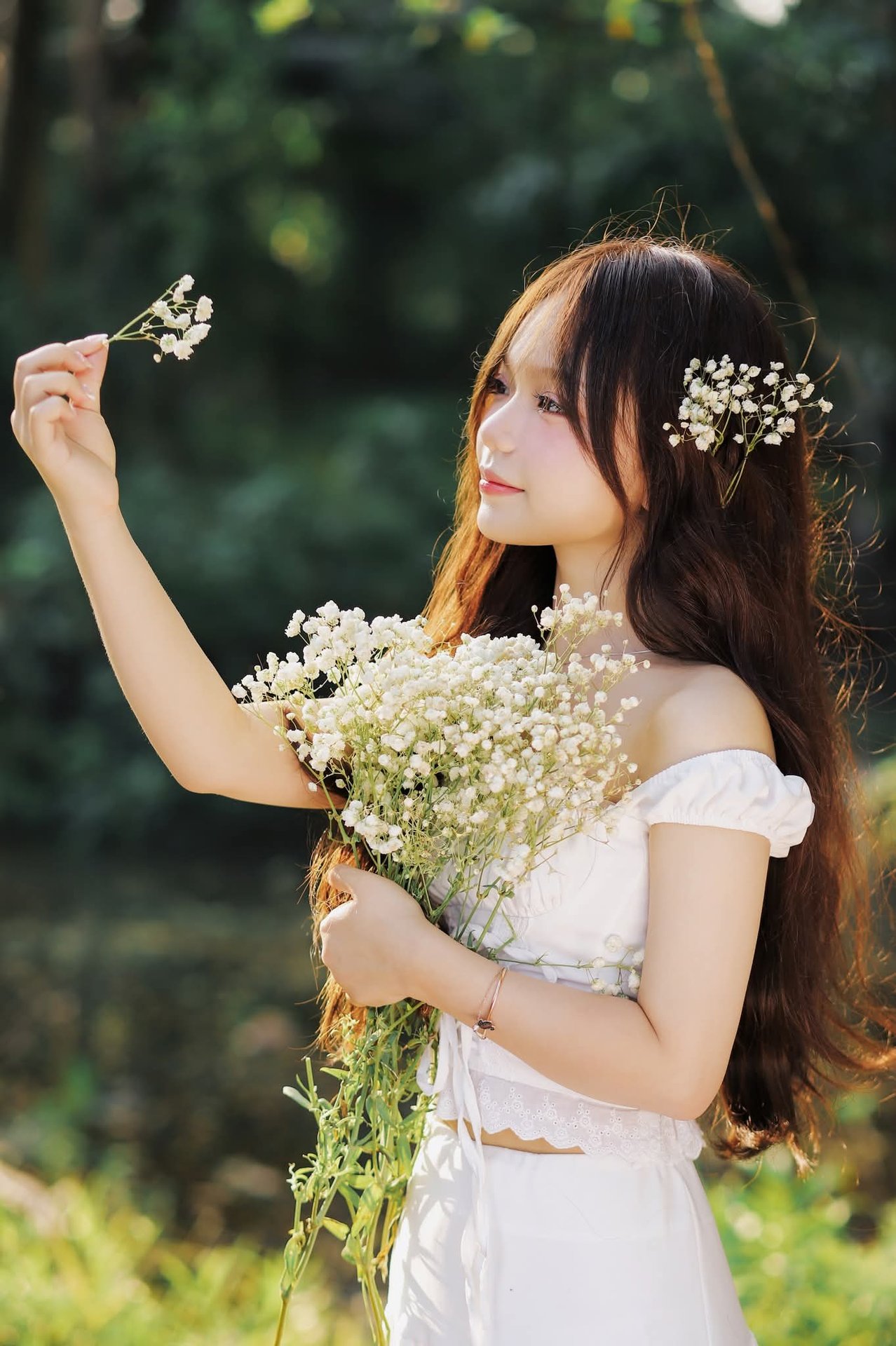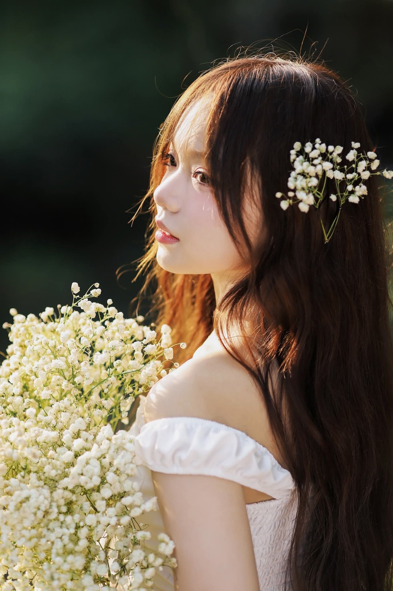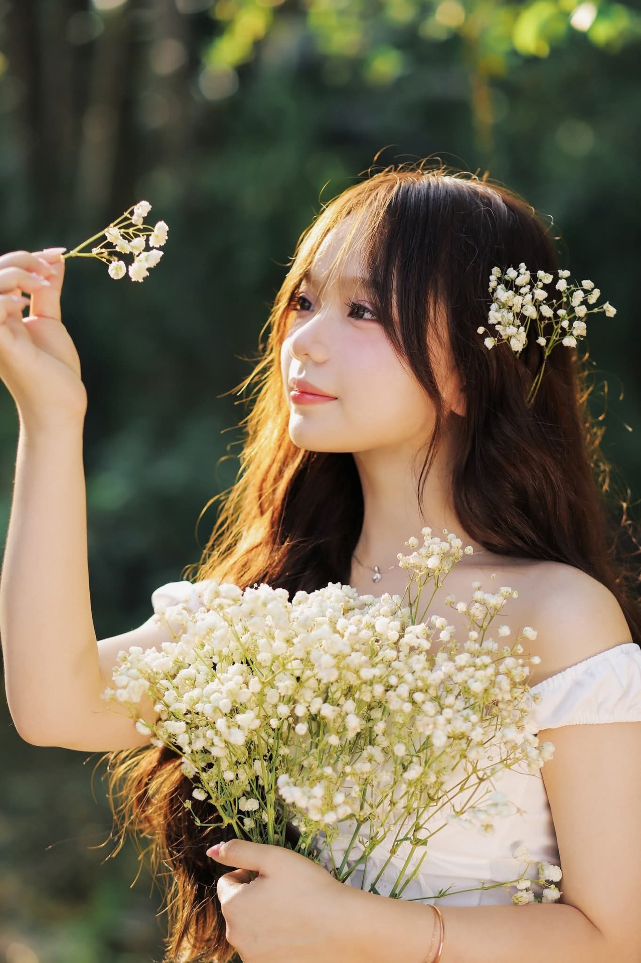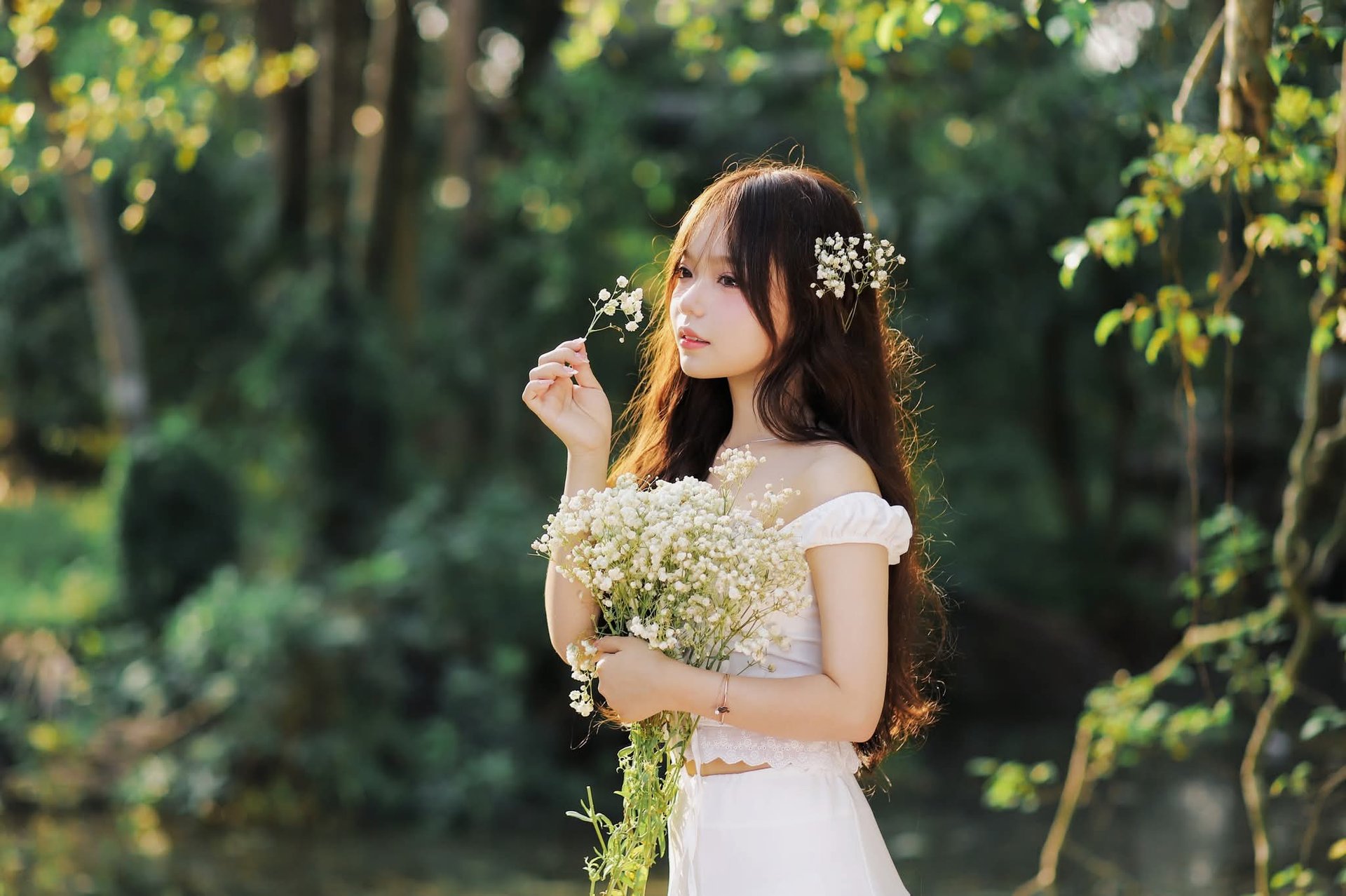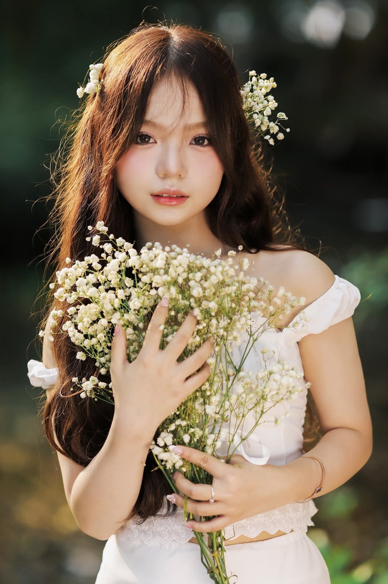 The image 1000019515.jpg depicts a portrait of a young girl with innocent and gentle beauty. She wears a pristine white outfit, blending into the lush green natural scenery. Her long flowing hair is adorned with tiny white flowers, creating a poetic and pure look. The girl's eyes exude innocence, her direct gaze into the camera is captivating. Prominently in her hands is a large bouquet of white flowers, symbolizing purity and elegance. Soft golden sunlight filters through the leaves, highlighting her delicate features and fair skin. This image represents natural beauty, unpretentious yet incredibly charming, evoking a sense of peace and romance.