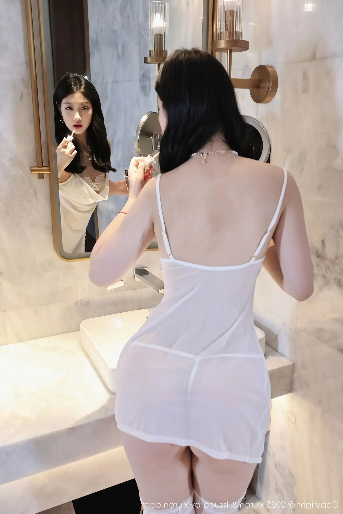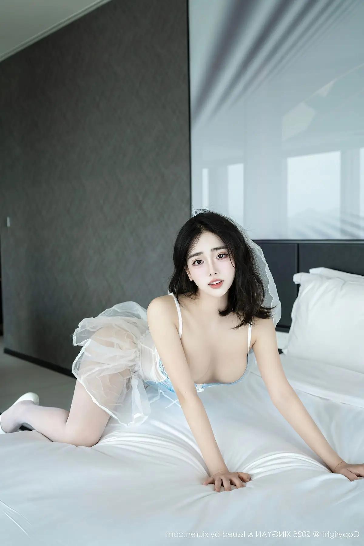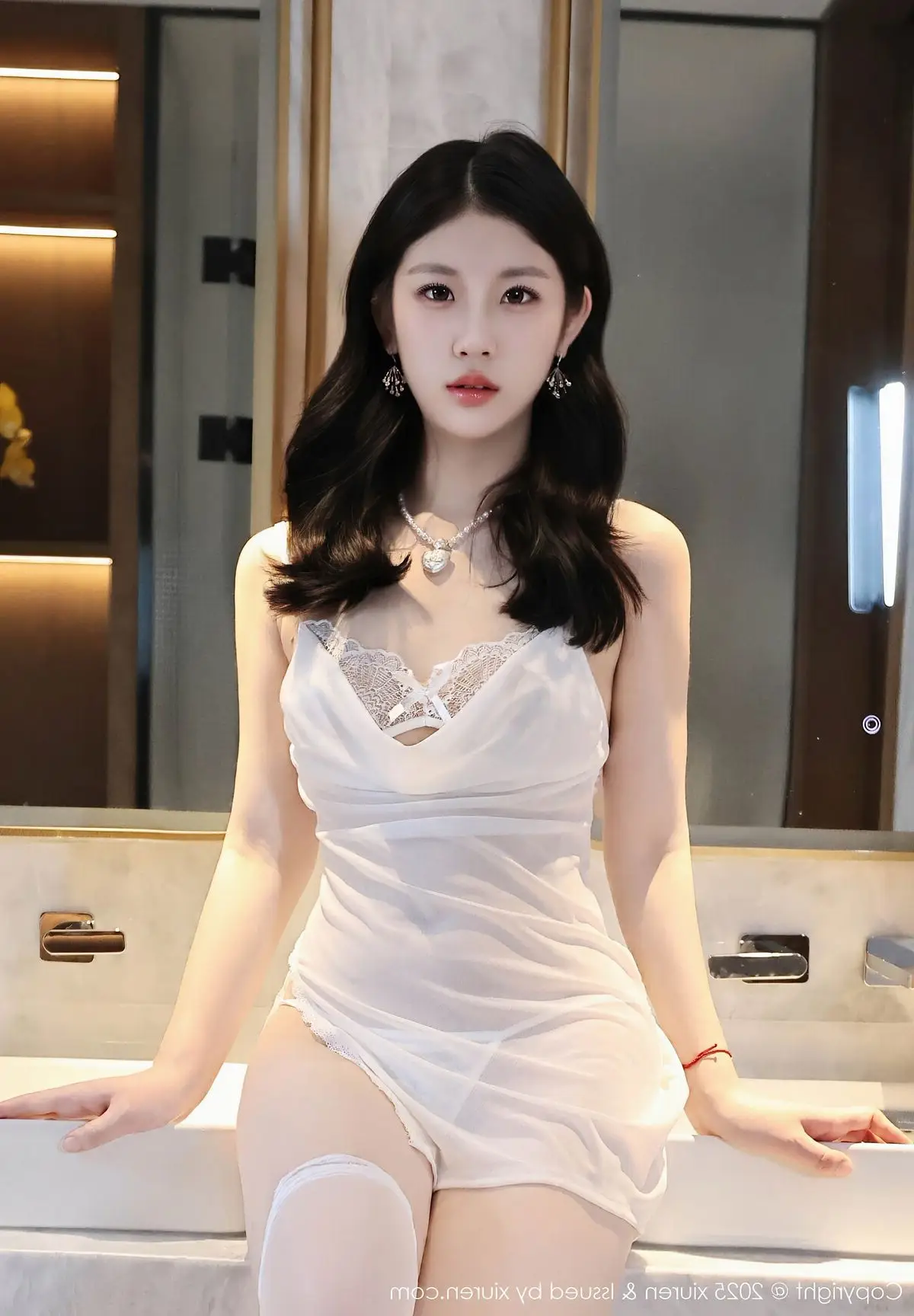Discover the captivating allure of model Xiao Ba Le in the XiuRen No10609 collection. She is elegantly portrayed in a sheer white nightgown, its delicate fabric subtly enhancing her natural grace and charm. Every detail, from the soft cowl neck of the dress to the pristine white thigh-high stockings, contributes to an image that is both sensual and sophisticated. The gentle lighting of the intimate indoor setting accentuates Xiao Ba Le's radiant skin and lustrous dark hair. This portrayal perfectly blends oriental elegance with modern lingerie fashion, offering a visually stunning and memorable experience for viewers.#XiaoBaLe #XiuRen #WhiteNightgown #SensualBeauty #LingerieFashion