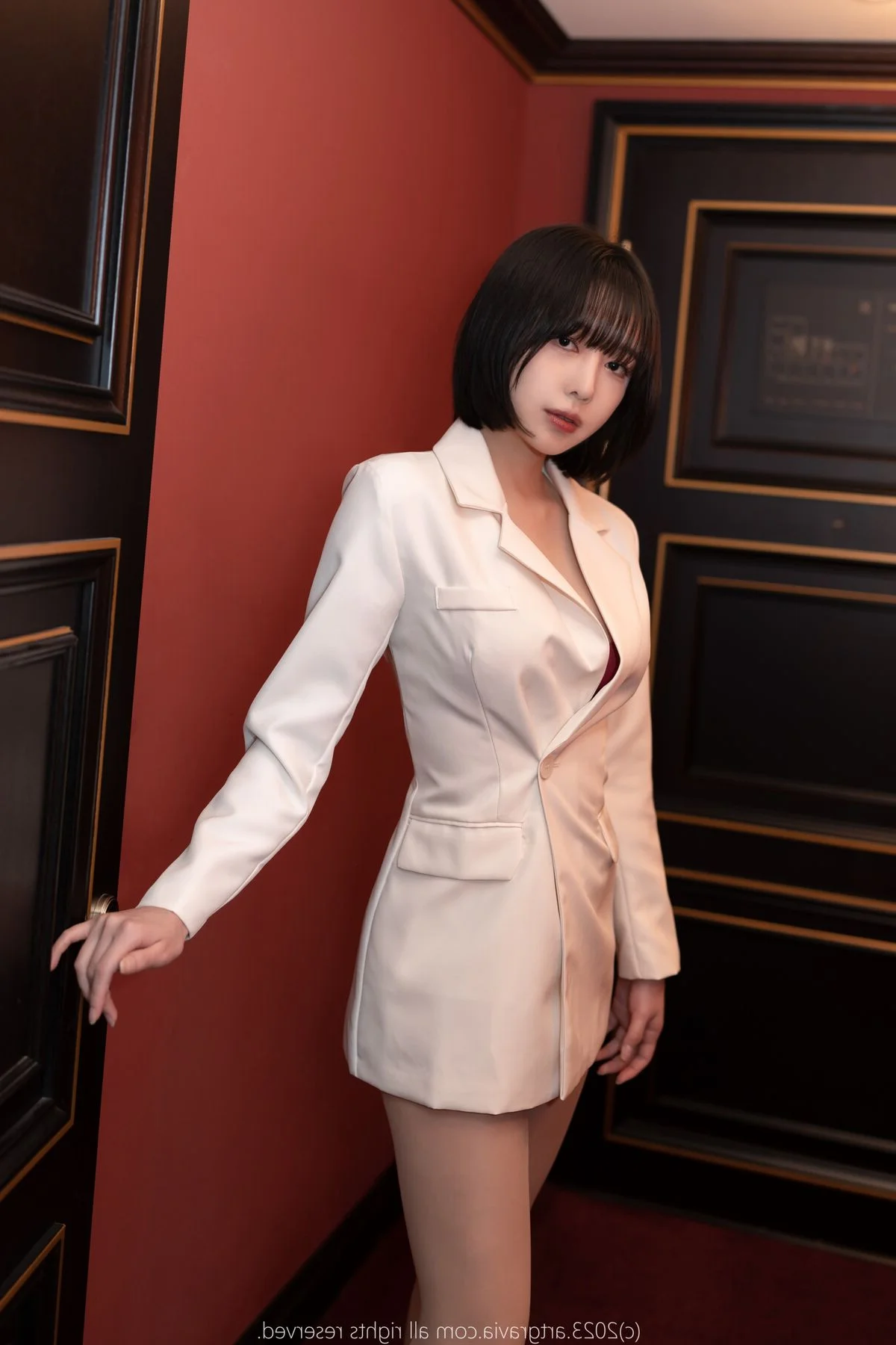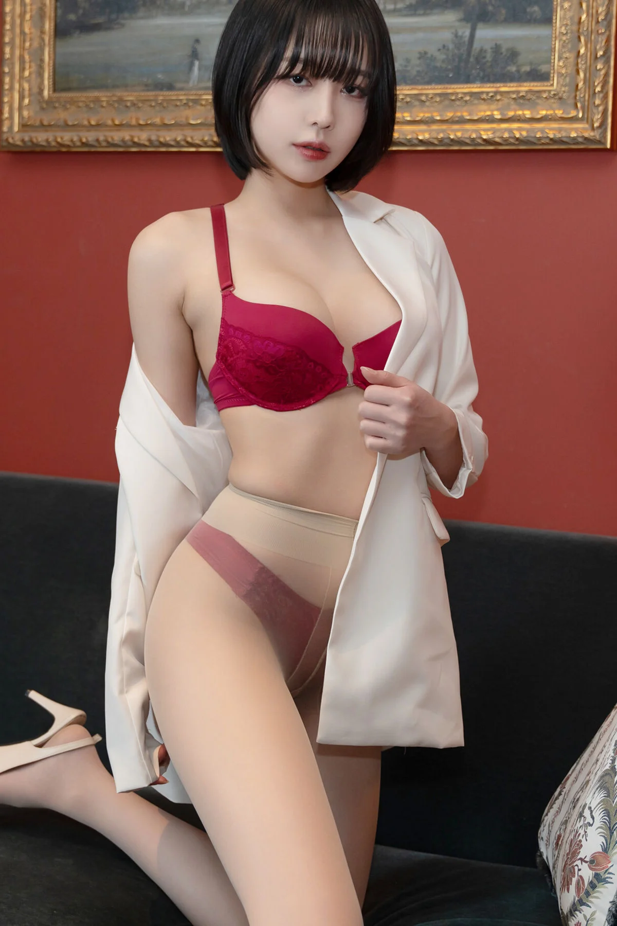 In the captivating AG Vol.532 Part01 photo collection, model Parkhaag 박하악 shines with irresistible allure. She is featured in a cozy setting, gracefully draped in a pristine white shirt over vibrant red lingerie, highlighting her elegant curves and perfect figure. Her expressive gaze and refined pose on the dark sofa create an artistic and sensual portrait. Parkhaag exudes confidence and professional poise, delivering moments filled with emotion and fascination. This photoshoot not only celebrates her physical beauty but also portrays her graceful and sophisticated charm, undoubtedly delighting fans and photography enthusiasts alike.#Parkhaag #AsianModel #LingerieFashion #SensualBeauty #AG