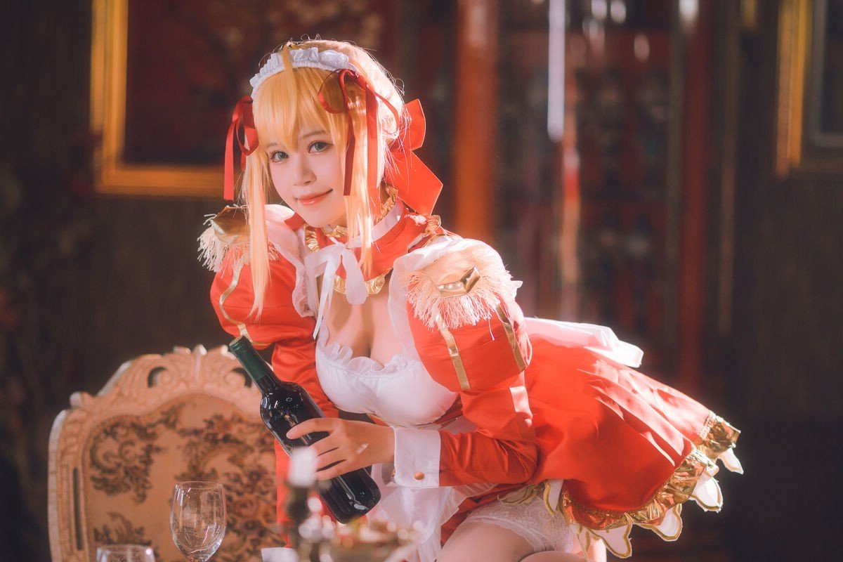 This image captures a stunning moment of Coser Kanoko Chitanda embodying the impressive character of Nero Maid. She shines brightly in a vibrant orange-red maid costume harmoniously combined with a pristine white apron and intricate ruffled details. Her golden hair is adorned with a matching headband and bows, creating an appearance that is both noble and graceful. The gentle standing pose and soft gaze exude elegance and charm, as if the character has stepped out of the virtual world. The meticulous attention to every detail of the cosplay showcases Coser Kanoko Chitanda's passion and skill, presenting a vivid and captivating image of Nero Maid that enthralls every viewer.