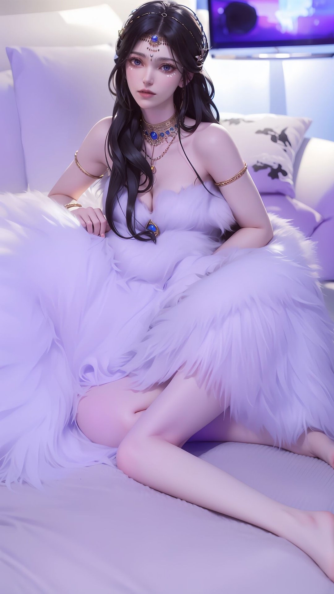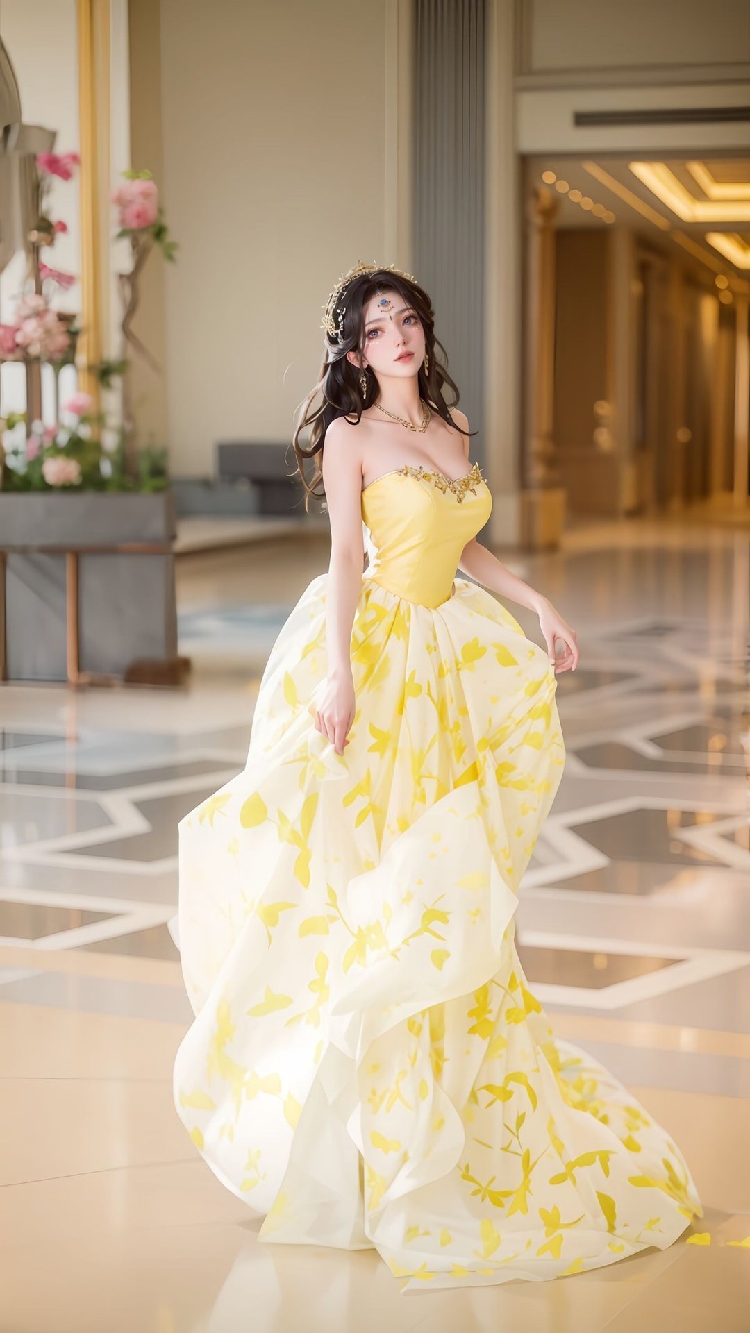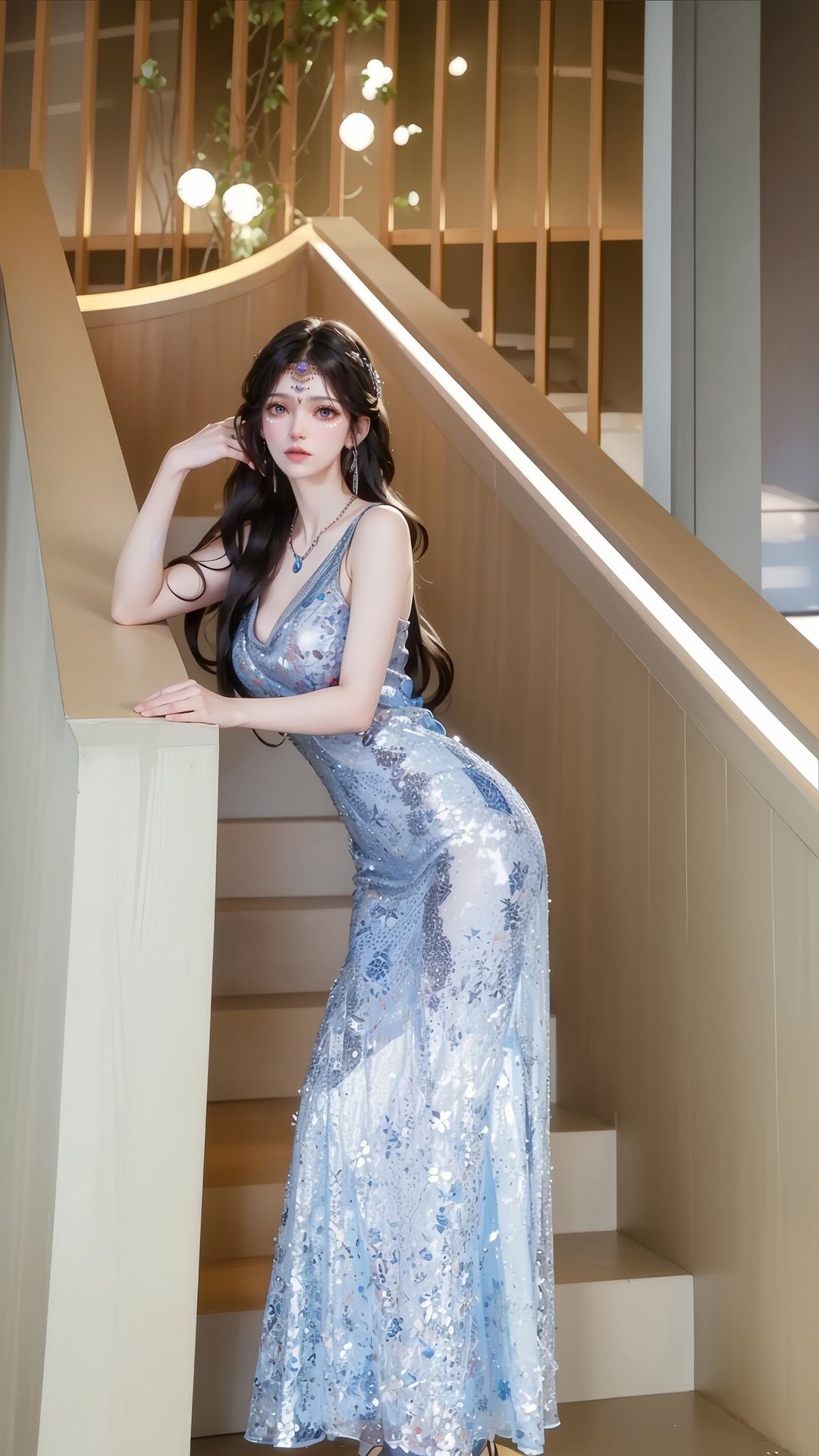 This stunning image showcases the AI generated character Jiang Li from the Stellar Transformation series. The enchanting maiden radiates an ethereal beauty and captivating presence in her magnificent blue gown. Her long flowing dark hair and deep mesmerizing eyes create an alluring visual. The exquisite attire adorned with sparkling gem-like details emphasizes her luxurious and regal bearing. Jiang Li stands amidst ancient architecture and crystal clear waters evoking a sense of a mystical world where she reigns as a divine figure. Her surreal beauty and noble demeanor are sure to captivate every gaze transporting viewers into the wondrous realm of her story.