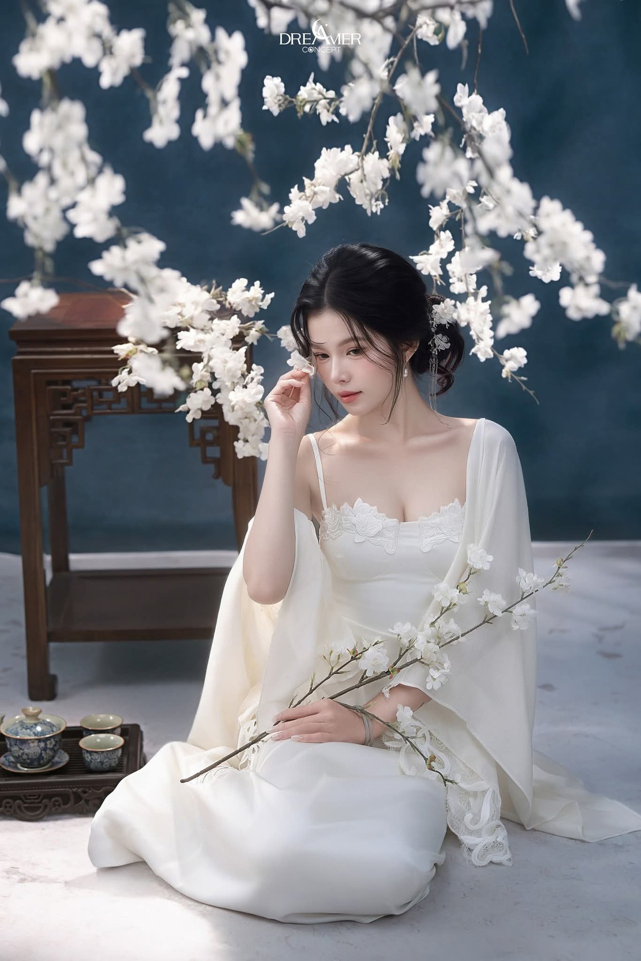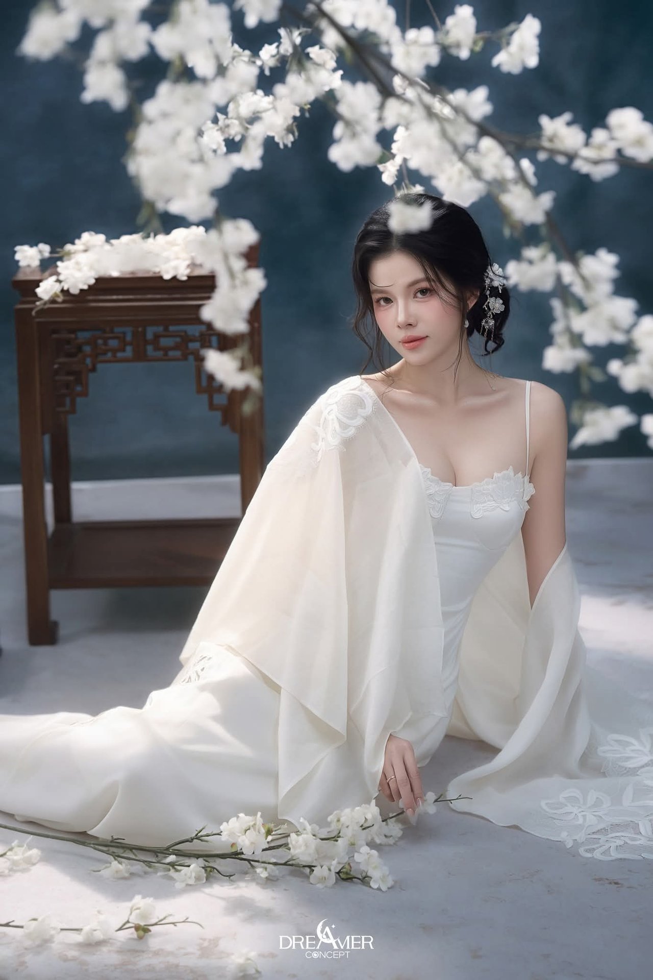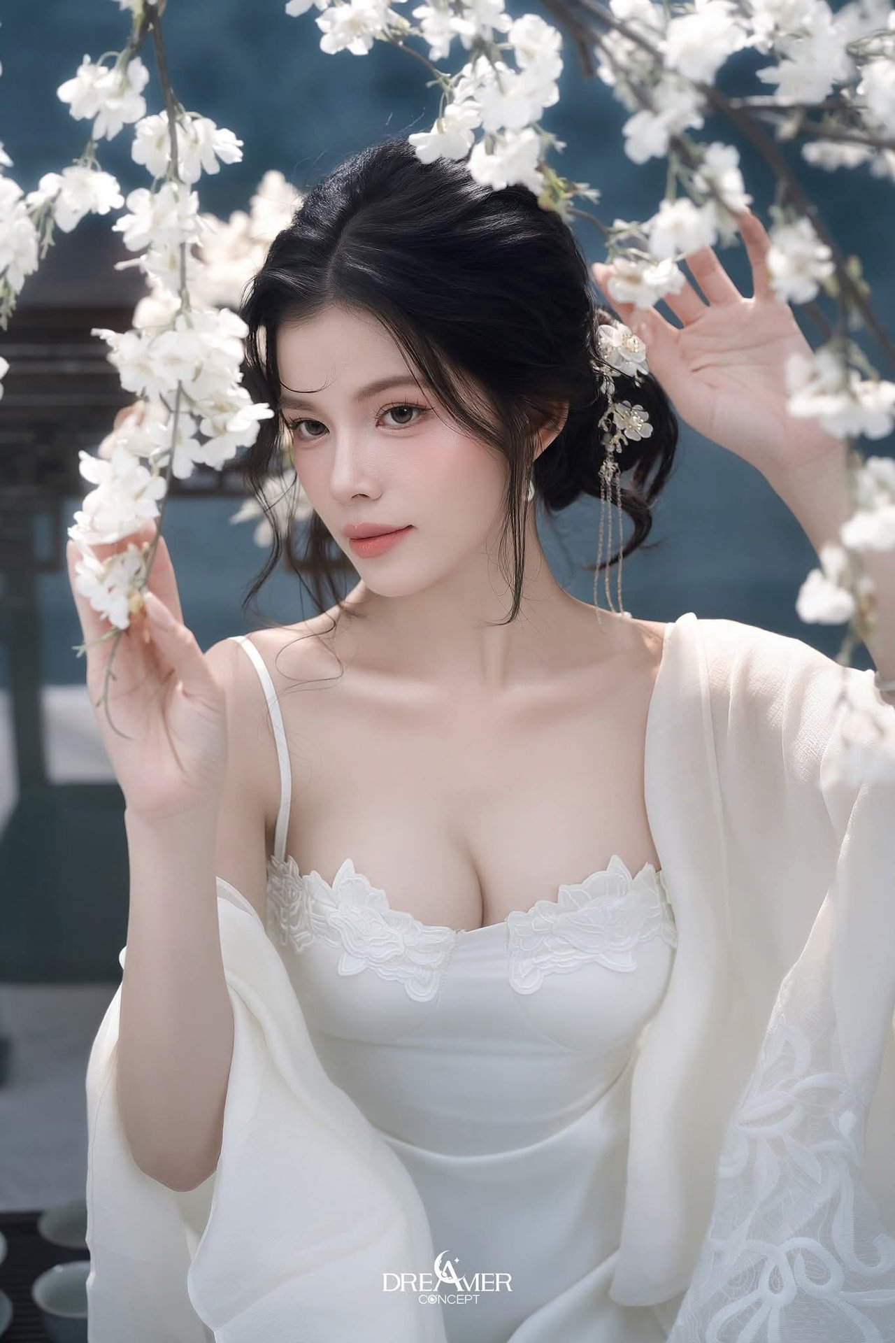 This exquisite photograph is a delicate work of art, celebrating the ethereal and pristine beauty of an Asian maiden. Dressed in a pure white gown, its soft fabric and classic design create a graceful, almost otherworldly presence. Surrounding her are branches adorned with pristine white blossoms, resembling falling snow, which craft a magical and romantic tableau. The maiden's serene gaze and gentle demeanor seamlessly blend with the setting, exuding a dreamy elegance and profound sense of peace. More than just a portrait, this image tells a story of innocence, timeless beauty, and the captivating allure of traditional Asian aesthetics, destined to enchant every viewer.