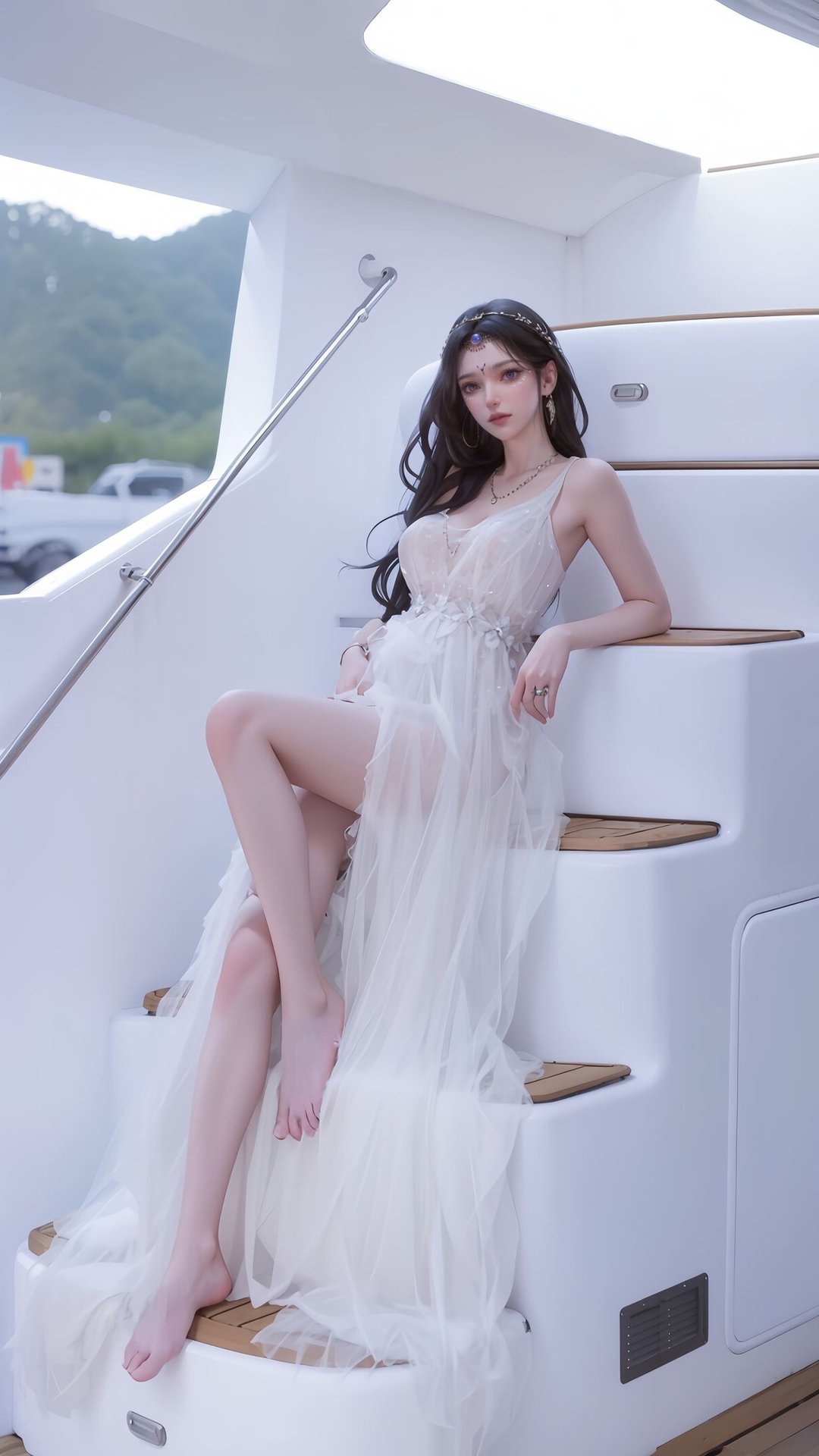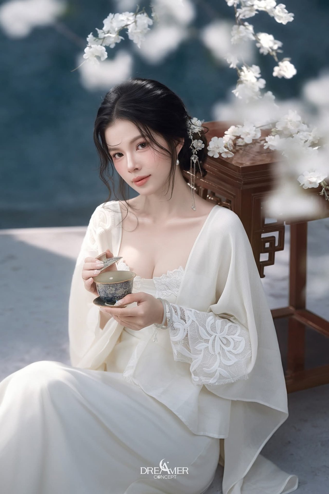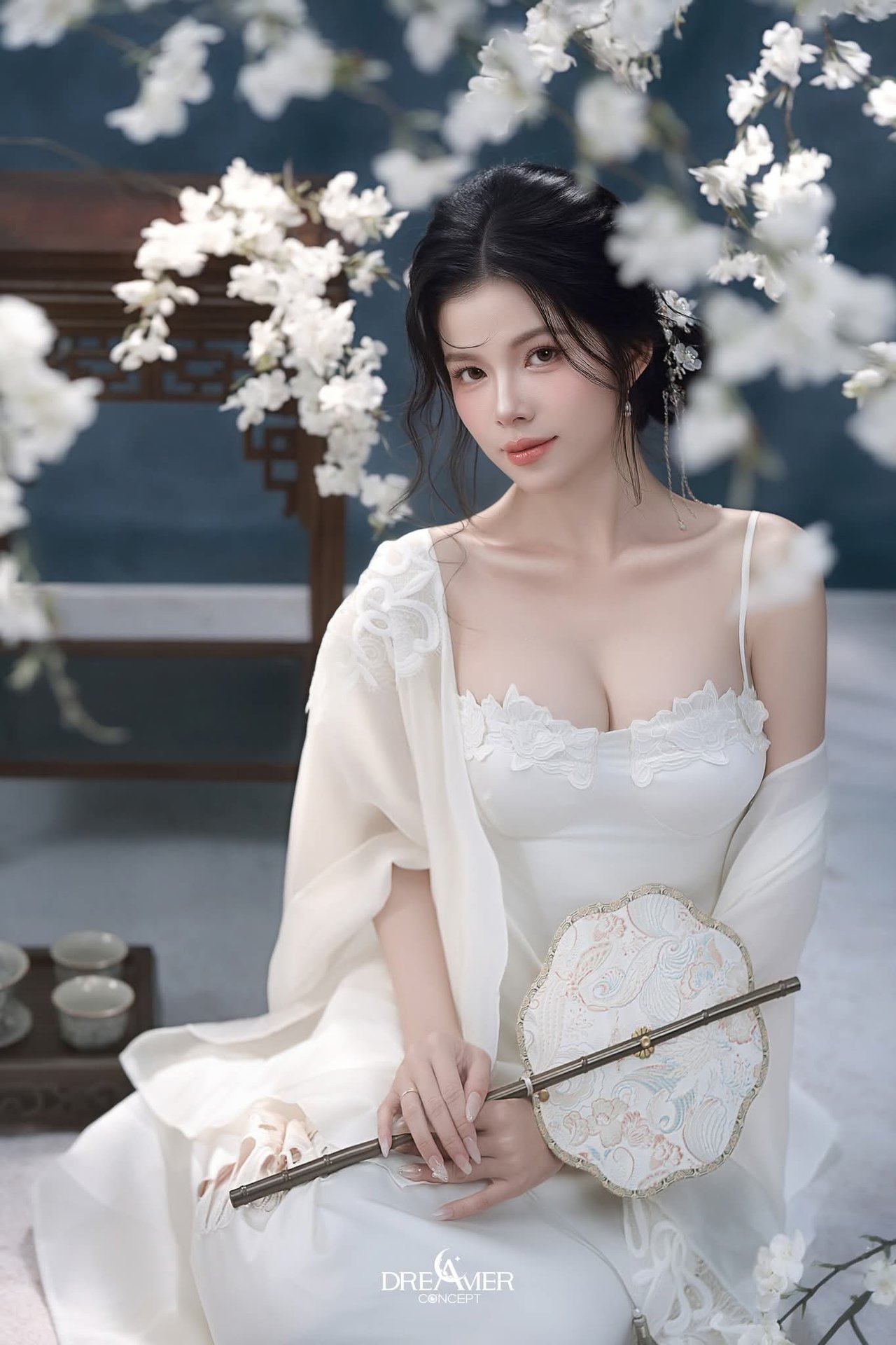 This exquisite photograph is a delicate work of art, celebrating the ethereal and pristine beauty of an Asian maiden. Dressed in a pure white gown, its soft fabric and classic design create a graceful, almost otherworldly presence. Surrounding her are branches adorned with pristine white blossoms, resembling falling snow, which craft a magical and romantic tableau. The maiden's serene gaze and gentle demeanor seamlessly blend with the setting, exuding a dreamy elegance and profound sense of peace. More than just a portrait, this image tells a story of innocence, timeless beauty, and the captivating allure of traditional Asian aesthetics, destined to enchant every viewer.