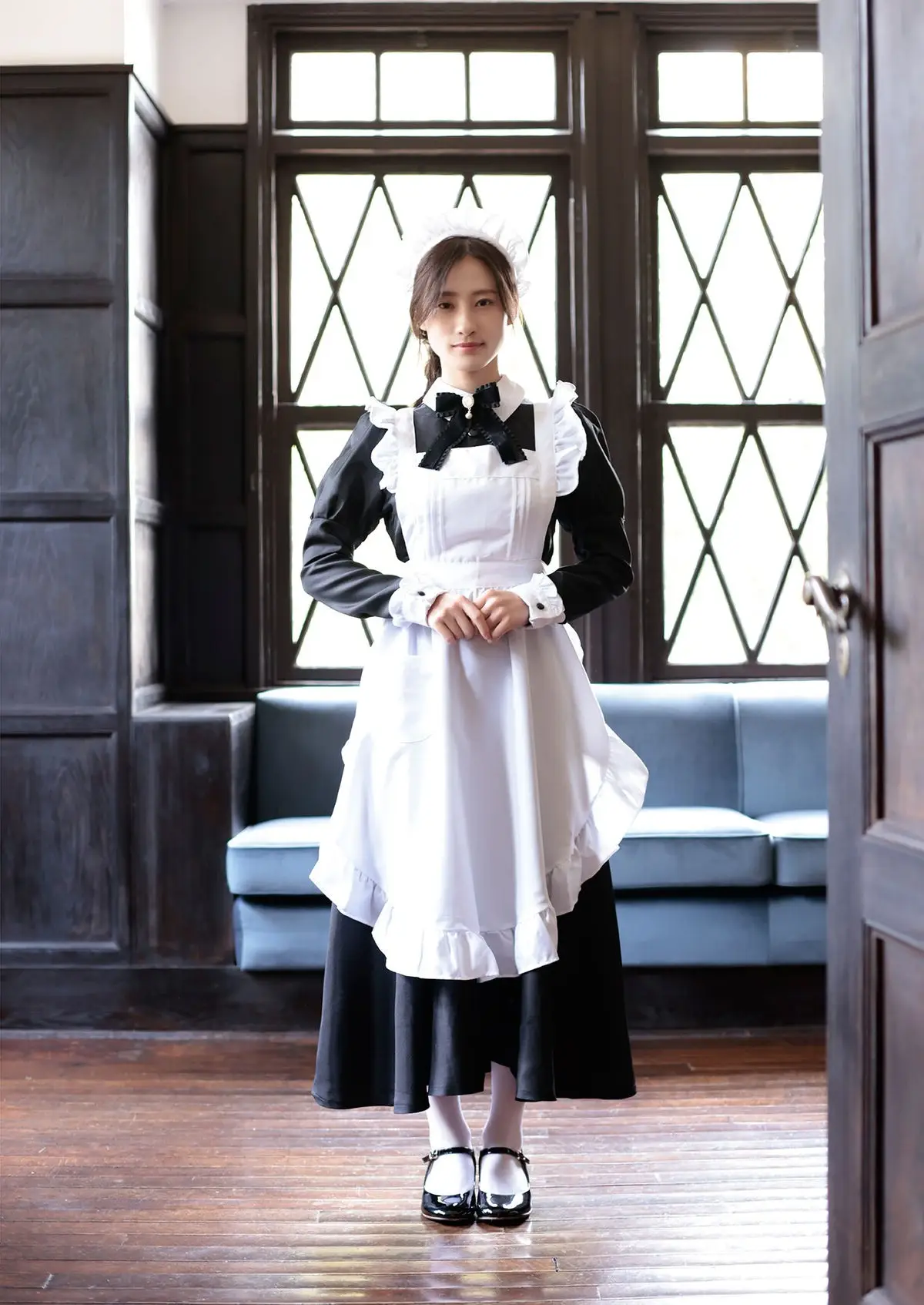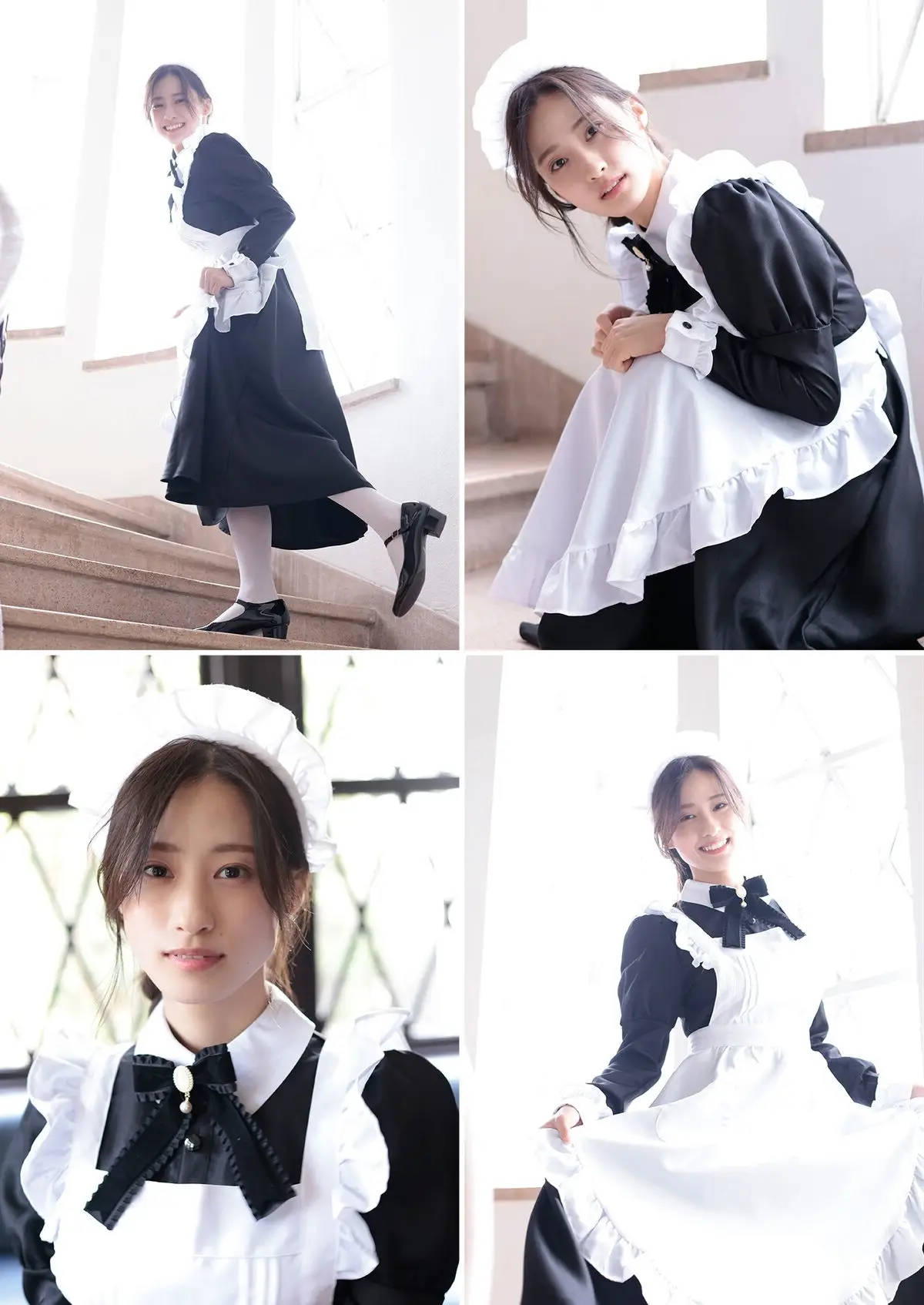 Immerse yourself in a classic world with Sumida Ayano 澄田綾乃 in her captivating 'Golden Siesta' YJ PHOTO BOOK. She appears gracefully in a traditional maid outfit, exuding an elegant and refined beauty that transcends time. With a gentle, welcoming smile and warm, inviting eyes, Sumida Ayano evokes a nostalgic feeling of a serene and golden era. The exquisite antique architectural background, featuring grand windows and dark wood, perfectly complements her timeless charm. This stunning photo collection promises to transport viewers into a romantic and utterly captivating golden siesta.