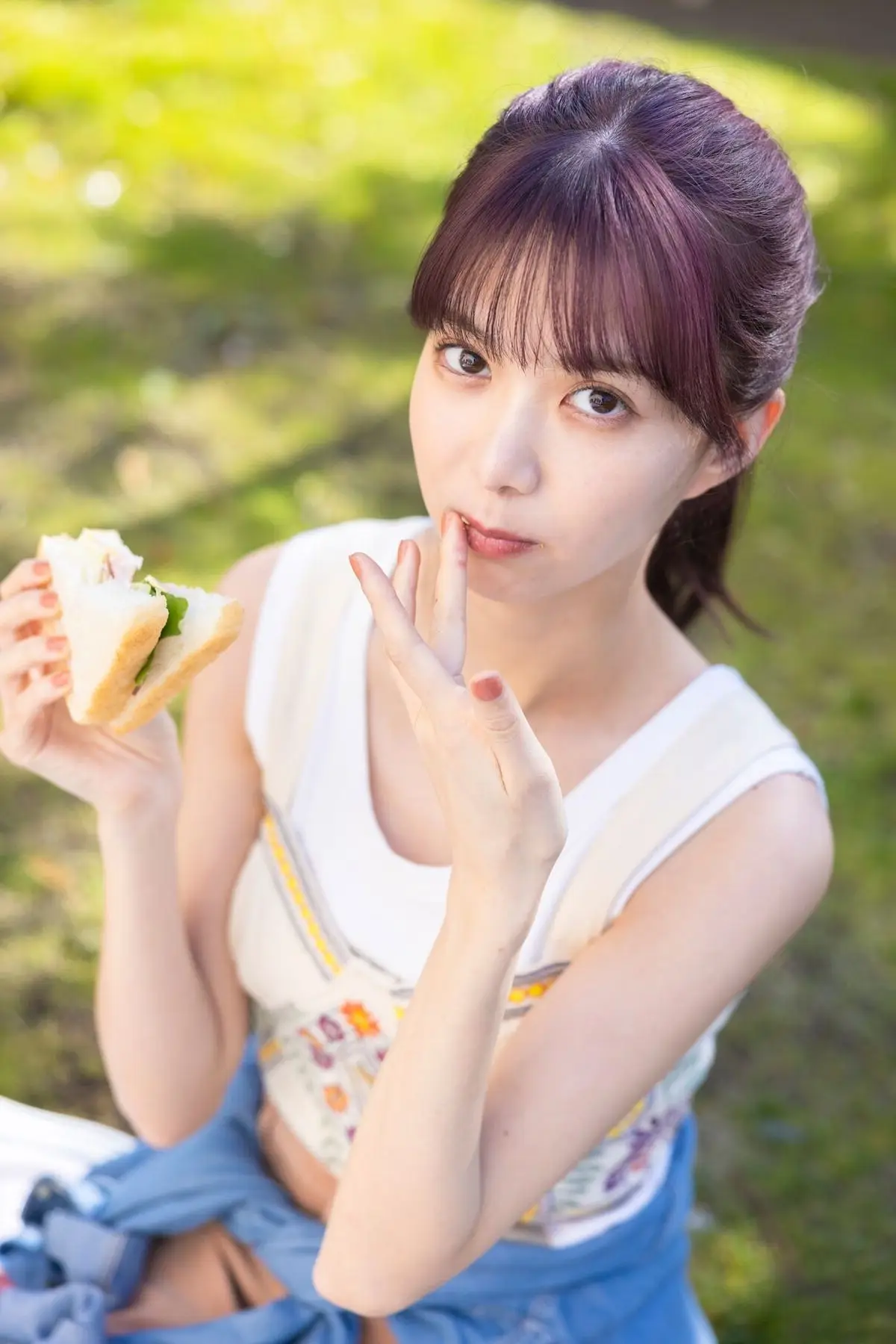 This captivating image showcases Riko Matsudaira's natural and alluring beauty. Her wet hair softly frames her face while her deep gaze and delicate hand gesture create a moment that is both enchanting and mysterious. The loosely worn white shirt subtly accentuates her graceful form and captivating charm. A dark blurred background enhances the focus on her evoking a sense of intimacy and privacy. This photograph is part of her debut photobook My Baby Riko Another Edition Part02 presenting an authentic and emotionally rich portrayal of Riko that is sure to mesmerize viewers.