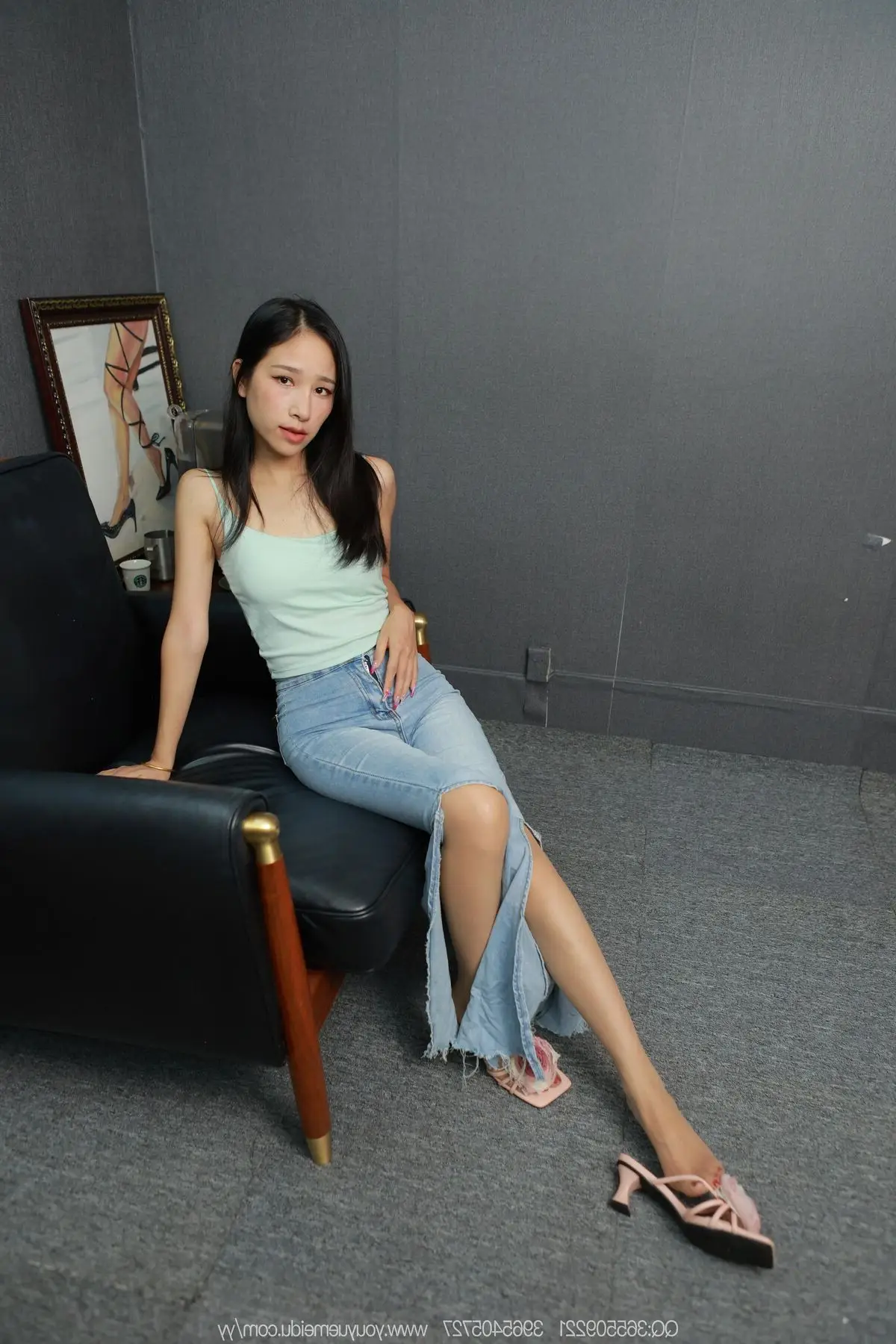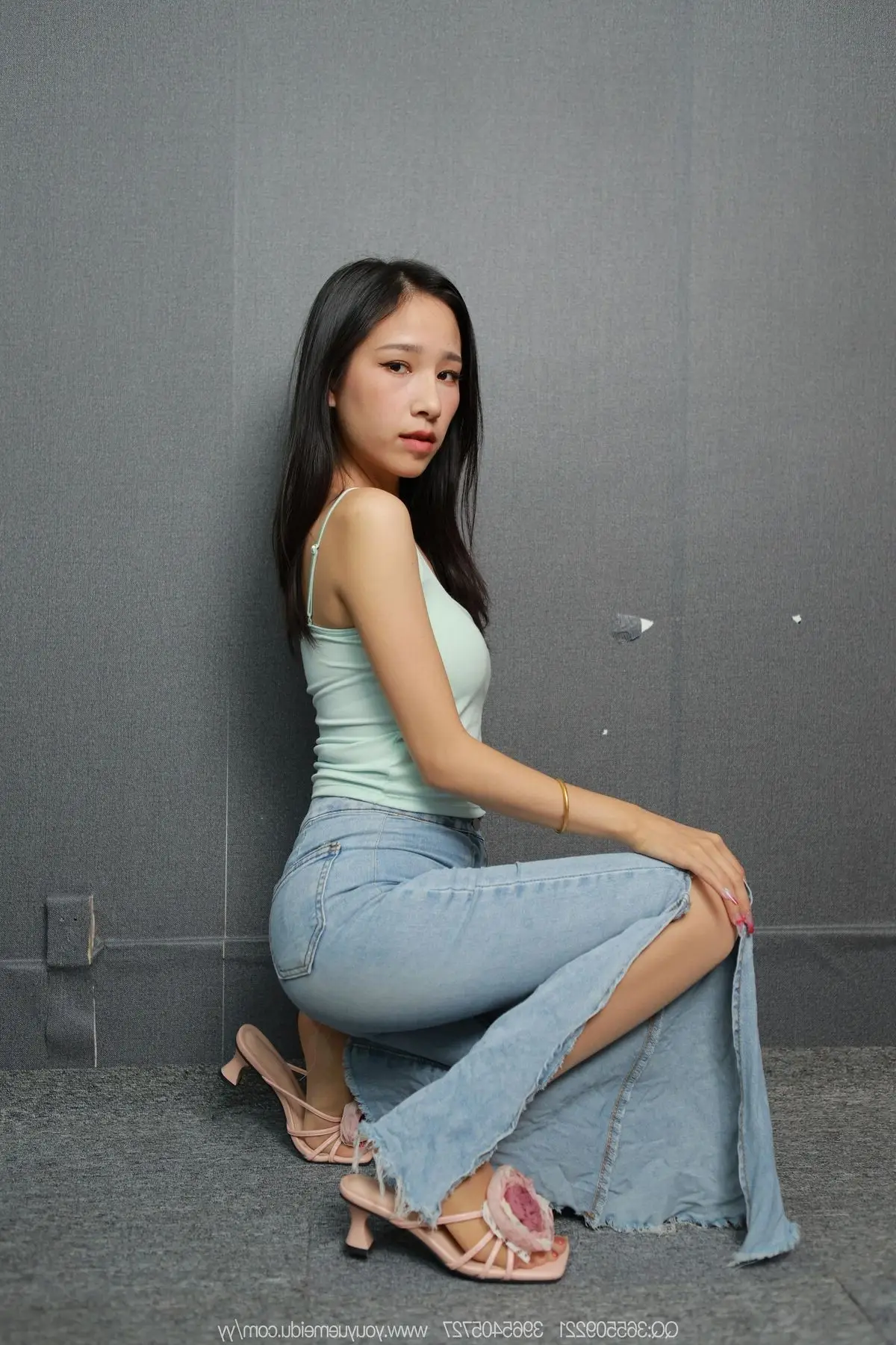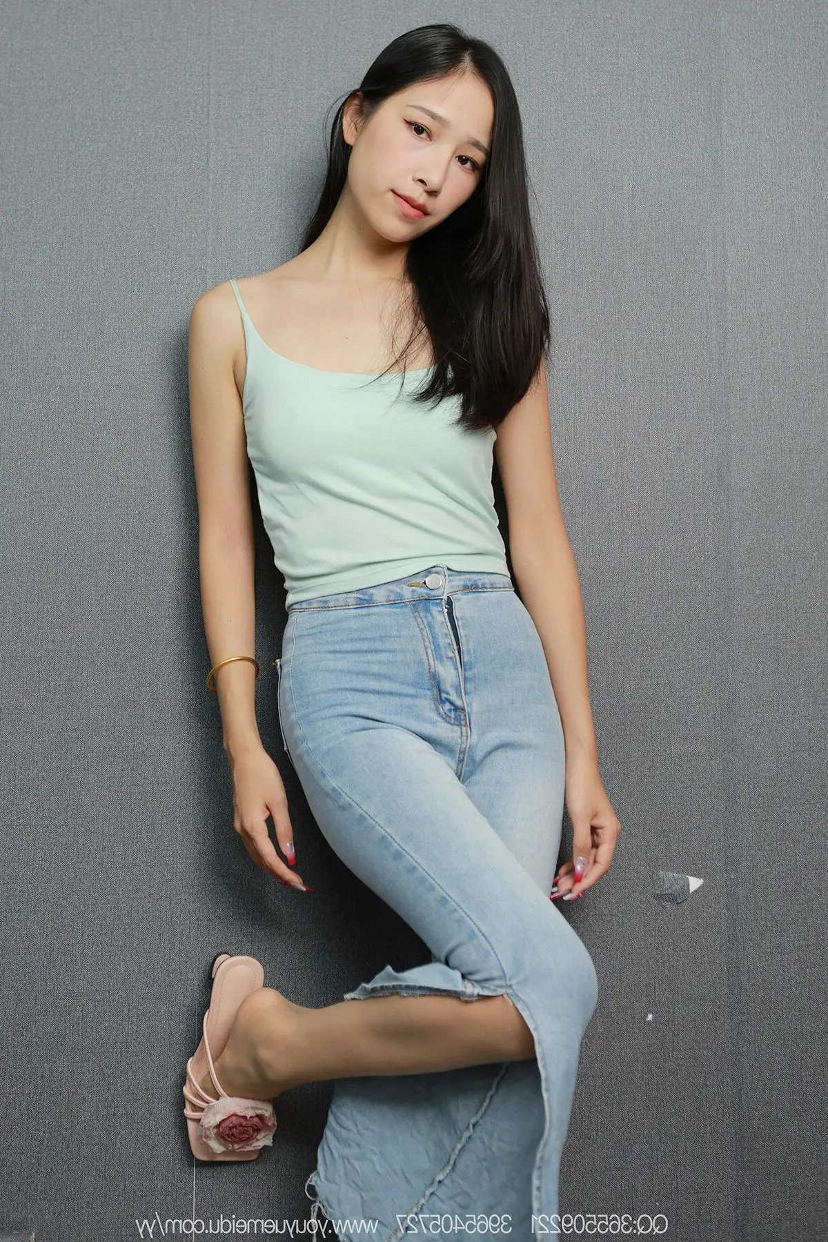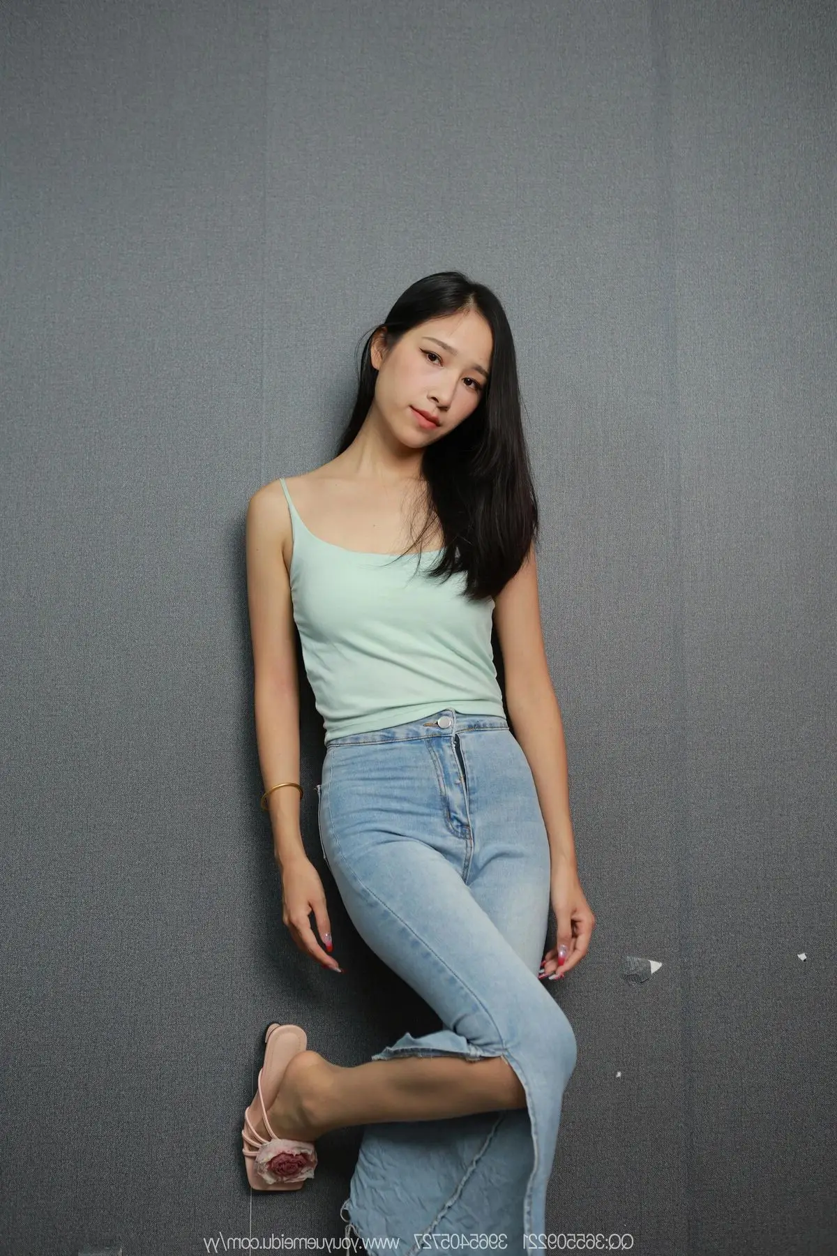 This image beautifully captures a graceful moment of model Mei Ko from the IESS异思趣向 SXJ No.2146 series. With her long flowing dark hair and a gentle gaze Mei Ko radiates a captivating natural beauty. She is elegantly dressed in a light blue spaghetti strap top paired with form-fitting jeans highlighting her slender figure. Her relaxed pose leaning against the grey wall along with simple slip-on sandals emphasizes her approachable and comfortable charm. This photograph clearly showcases the distinct style of IESS异思趣向 offering an authentic and emotional glimpse into the allure of East Asian beauty.#MeiKo #IESS #ChineseModel #SXJ2146 #NaturalBeauty